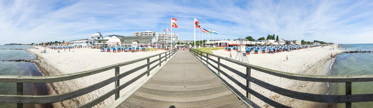 Weißer Sandstrand mit schönem, gepflegten Ostseeflair und vielen gastronomischen Angeboten hinter dem Strand an der Promenade. -