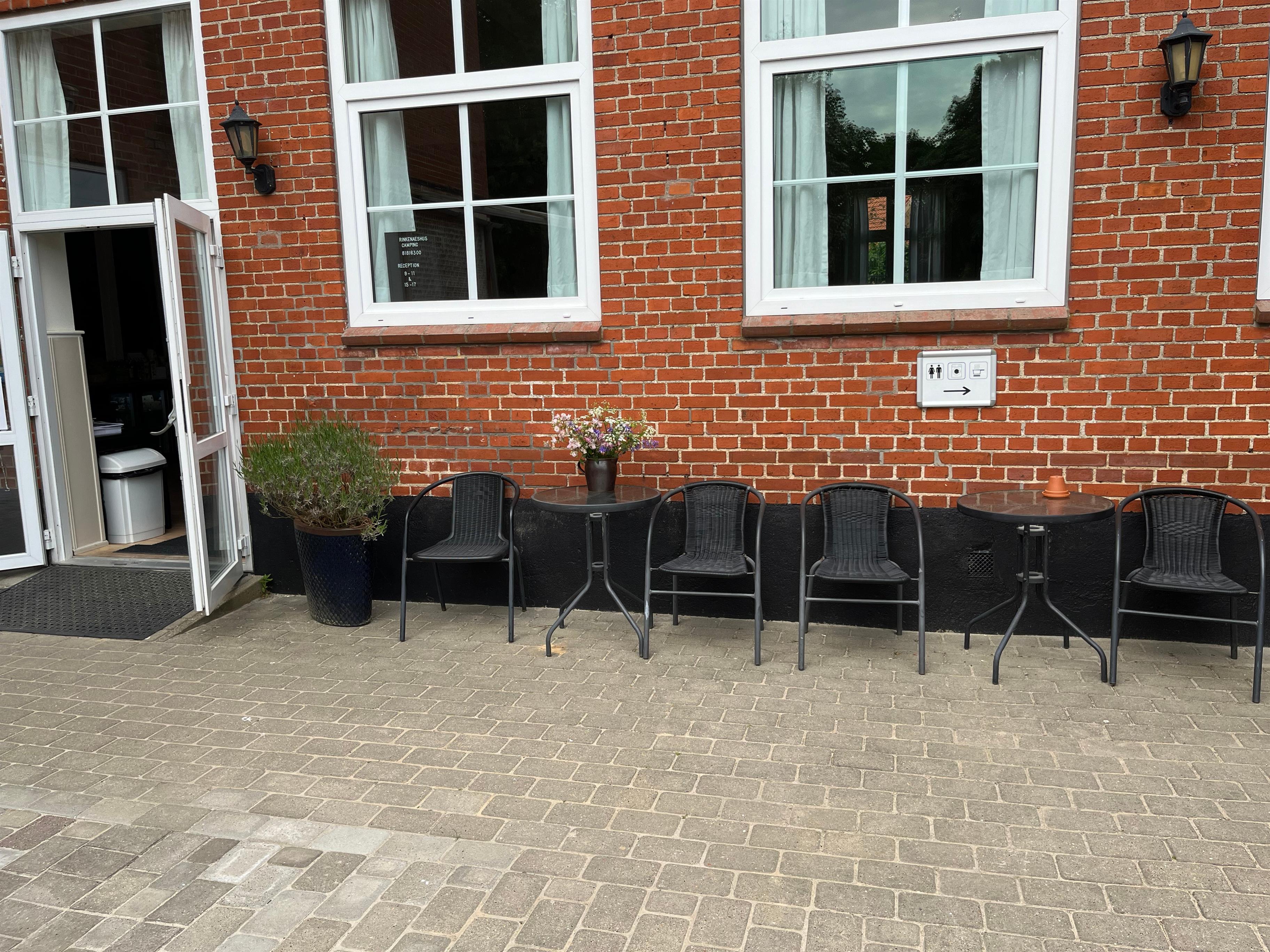 Rinkenæshus Camping Hytter C, gemütlich gelegen auf der Hyttenwiese, ist ausgestattet mit Außenterrasse, bezogenen Betten, Sitzecke, Waschbecken (nur kaltes Wasser), Wasserkocher, Kaffeebrüher, Geschirr & Kühlschrank. WLan Gratis.