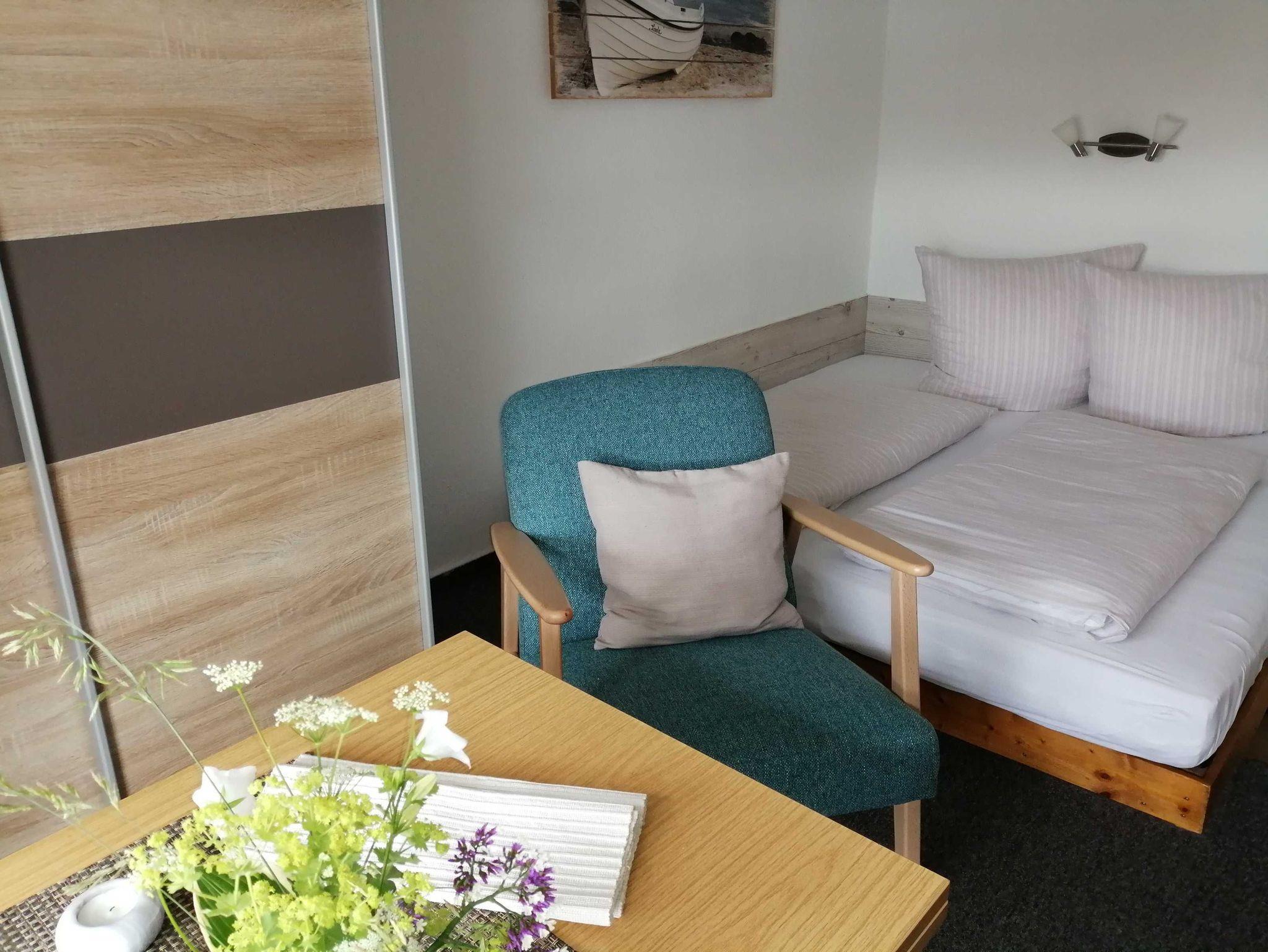 Das Ferienzimmer (Nichtraucher) ist 15 m² groß und ist ein kombiniertes Wohn-Schlaf-Zimmer (Doppelbett, 2 Sessel, Tisch, Sat-TV) mit integrierter Mini-Küche (2 Kochfelder, Kaffeemaschine, Kühlschrank, Toaster, Wasserkocher, Spüle). Dazu gehört ein Bad mit Dusche und WC. Bettwäsche (Erstausstattung) und Endreinigung sind inklusive. Handtücher bitte mitbringen. (Achtung: Die Treppe zum Zimmer hat an einer Stelle eine niedrige Durchgangshöhe ca. 1,70m) Keine Haustiere!
