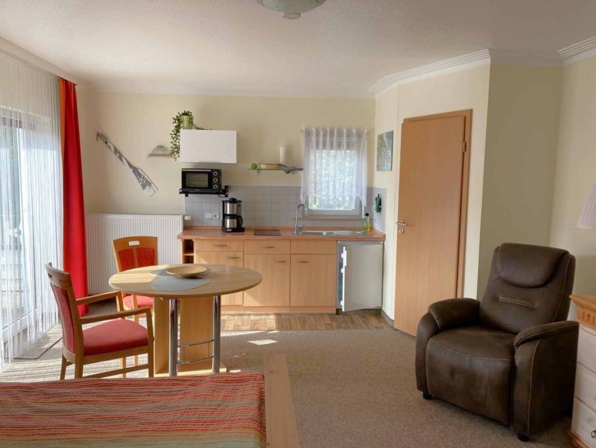 Die offene Küchenzeile ist mit einem 2-Plattenherd, einem Kühlschrank mit Gefrierfach, Toaster, Kaffeemaschine und Wasserkocher ausgestattet. Das moderne Badezimmer verfügt über eine ebenerdige Dusche, WC und Haartrockner. Vor der Ferienwohnung befindet sich die möblierte, beflanzte Terrasse in südöstlicher Richtung.