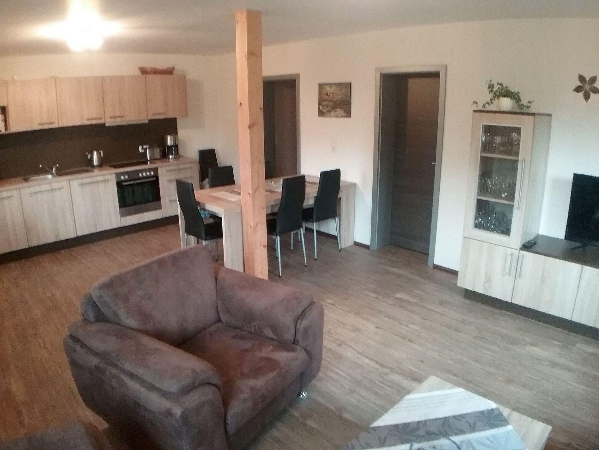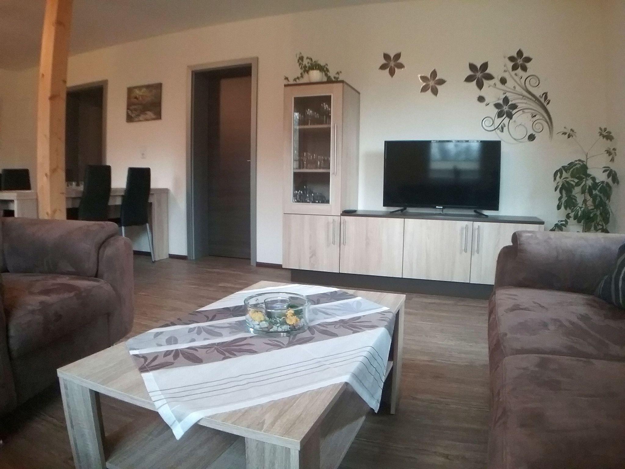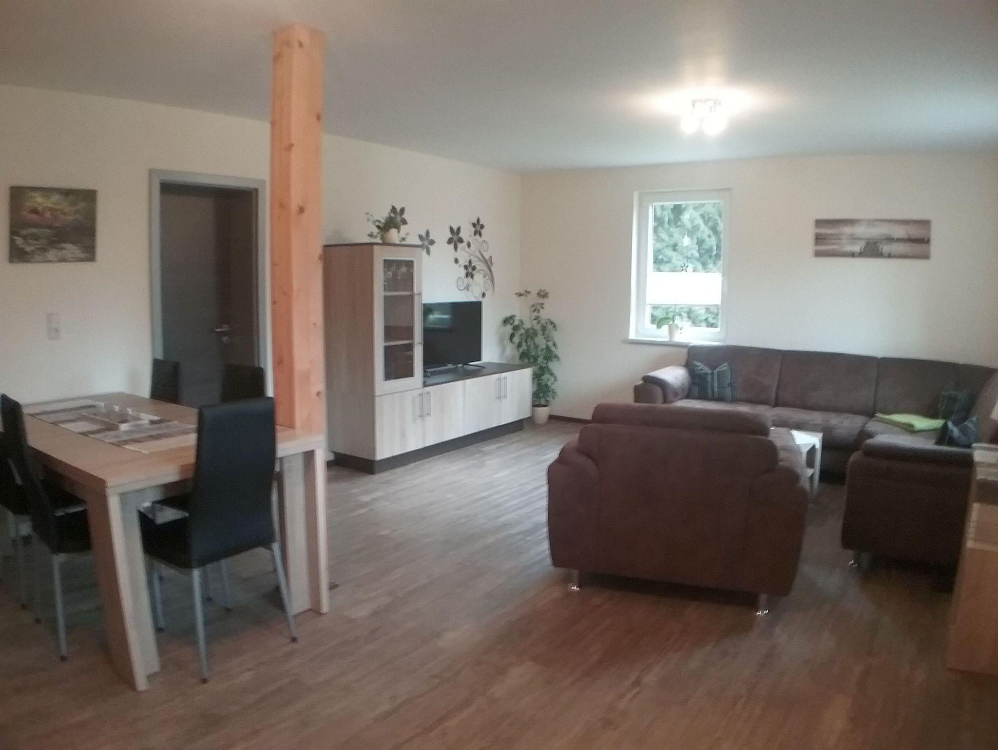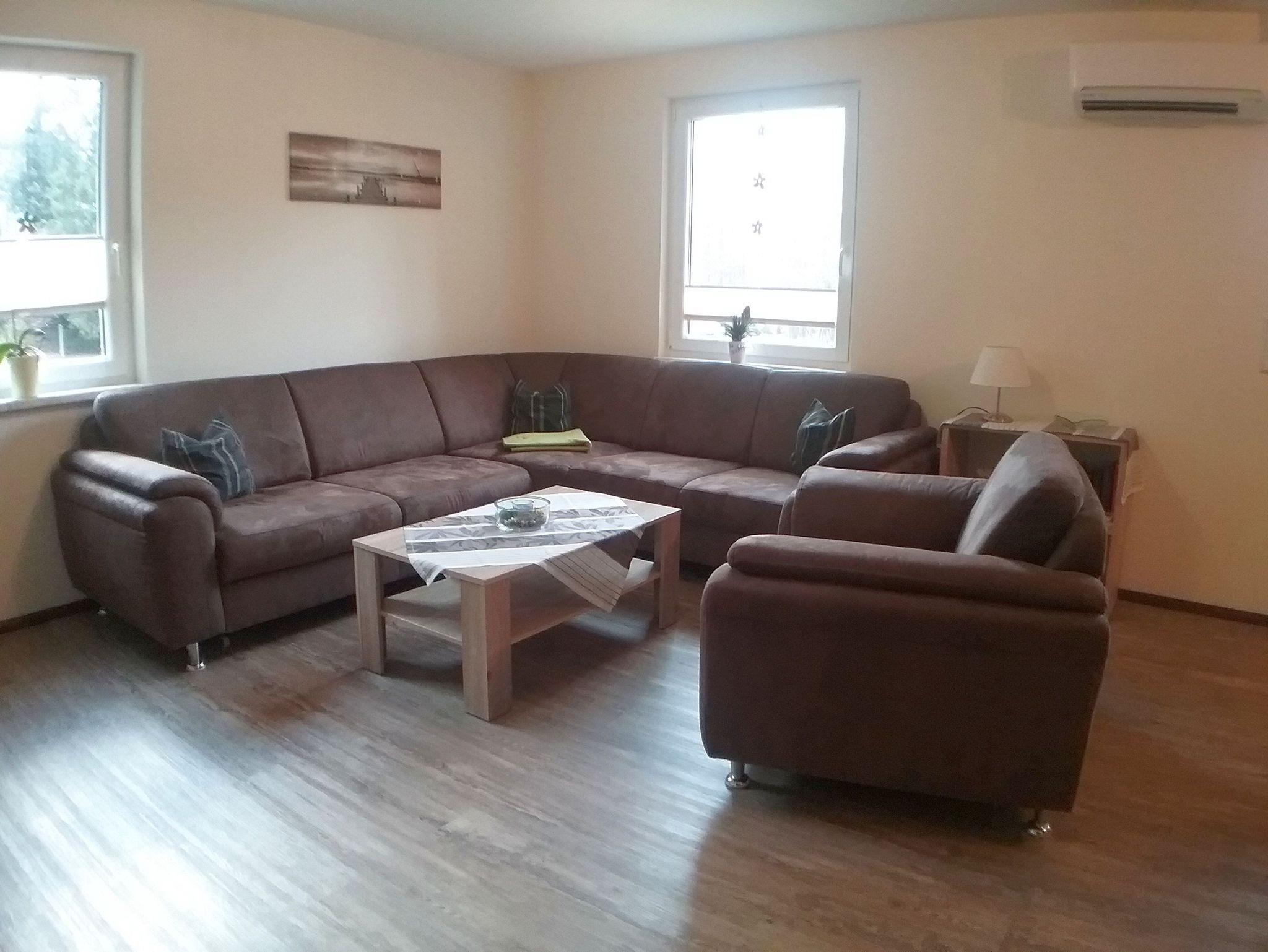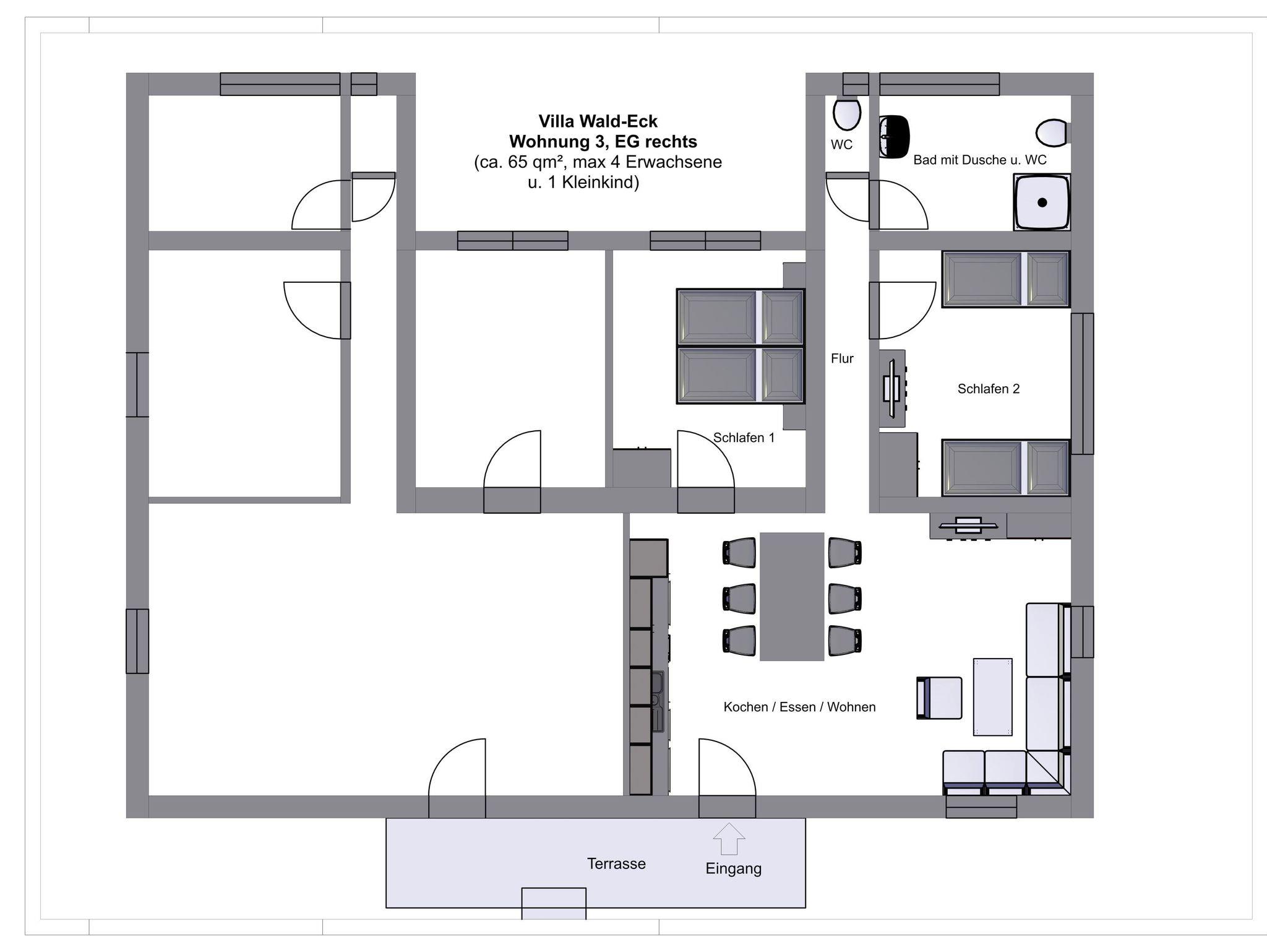 Die 3-Raumwohung im EG ist 65 qm groß und für 4 Personen, zzgl. Aufbettung für 2 Personen auf dem Schlafsofa im Wohnbereich, sowie ein Kleinkind im Kinderreisebett geeignet. Sie finden hier einen offenen Wohn-/Essbereich mit Küchenzeile, Essplatz und gemütlicher Sitzecke. In der Küche finden Sie alles was für einen entspannten Urlaub wichtig ist. Weiterhin gibt es ein Schlafzimmer mit Doppelbett und einen weiteren Schlafraum mit 2 Einzelbetten. Des Weiteren finden Sie ein Badezimmer mit Dusche und 1 Gäste-WC vor. Sowohl in der Sitzecke, als auch in dem Schlafraum mit den 2 Einzelbetten steht ein TV- Gerät.