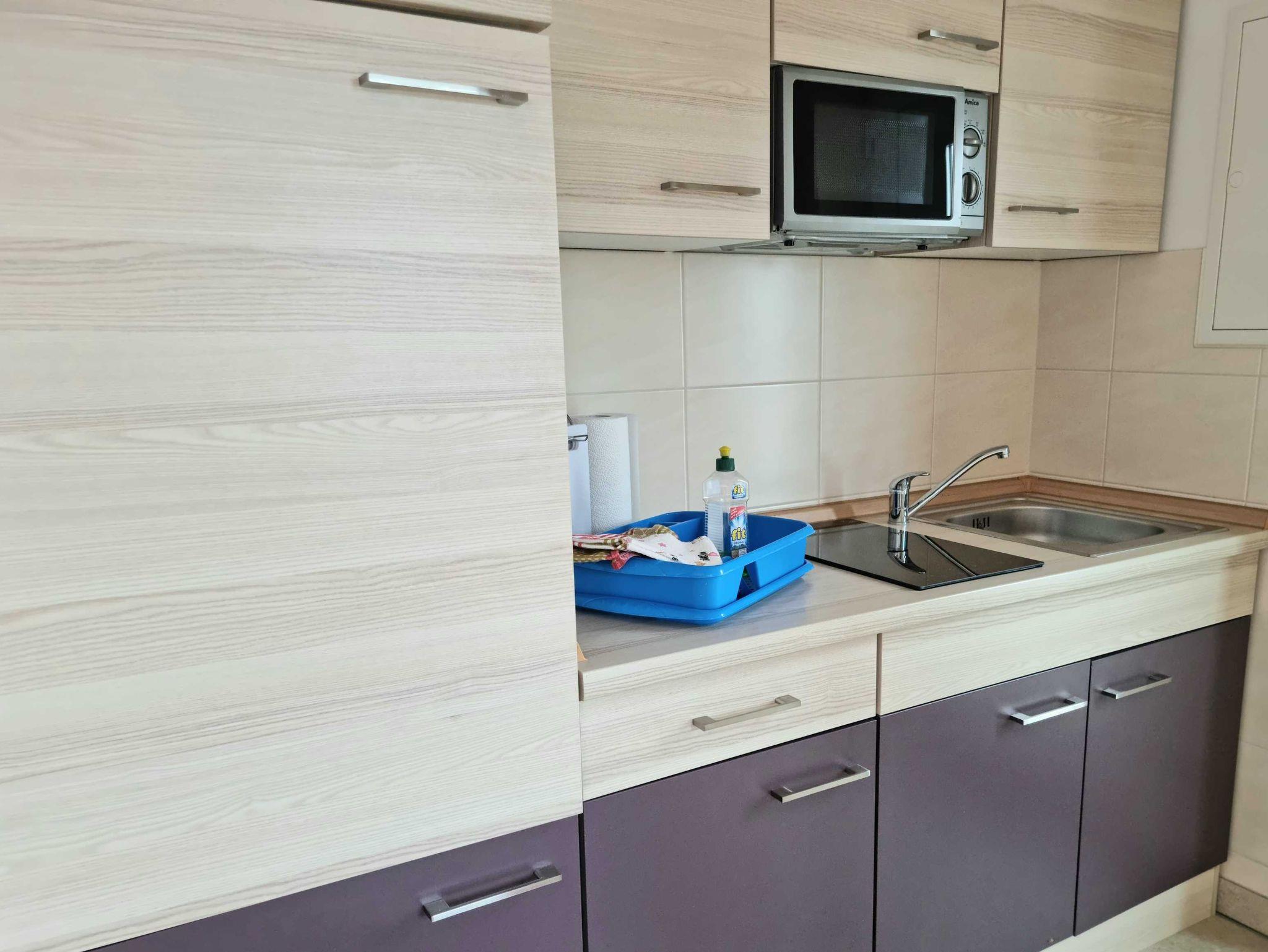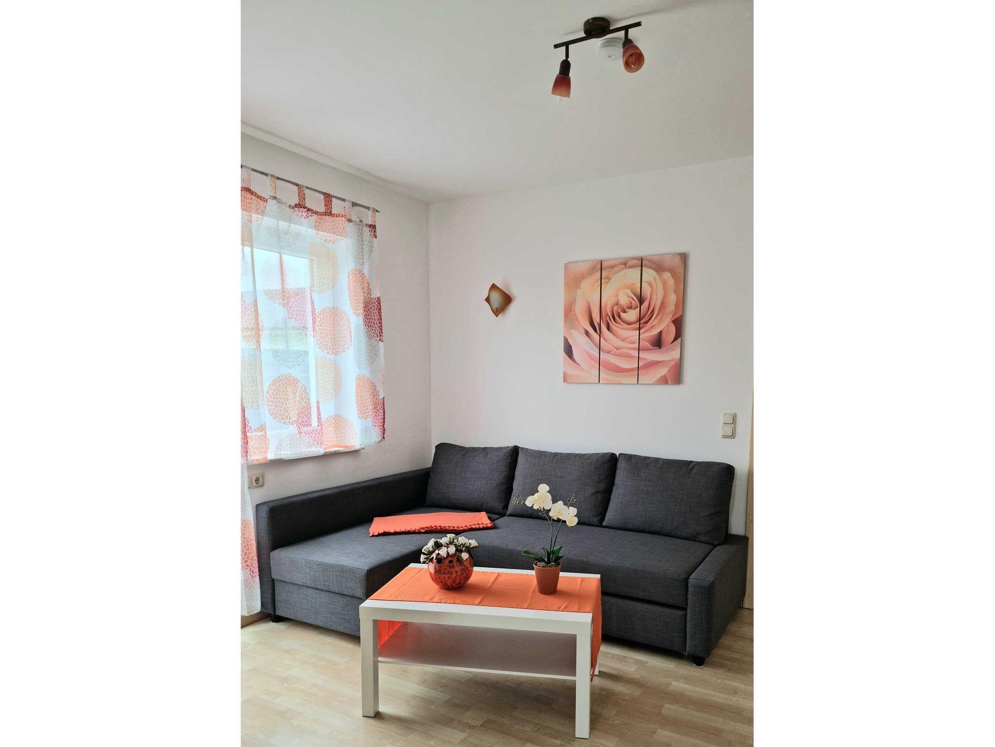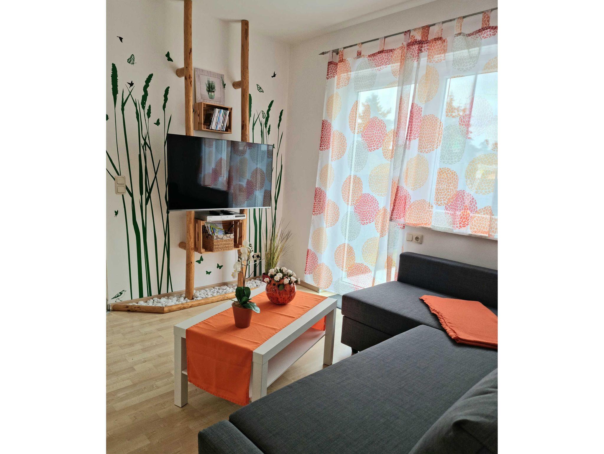 Die moderne 32 qm große Ferienwohnung verfügt über einen gemütlichen Wohn-/Essbereich mit einem Schlafsofa, TV (48 Zoll), DVD-Player, Couchtisch, Esstisch und Stühle. Die moderne Küchenzeile ist mit einen 2 Platten Herd, Mikrowelle, Wasserkocher, Toaster, Kaffeemaschine und Kühlschrank mit Gefrierfach ausgestattet.
