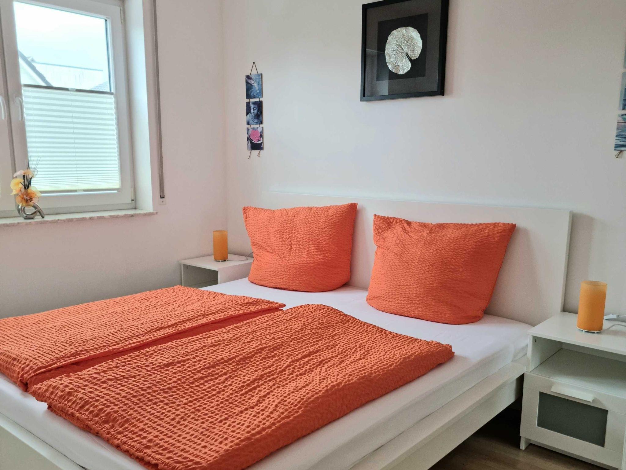 Im Schlafzimmer befindet sich ein Doppelbett und Kleiderschrank.