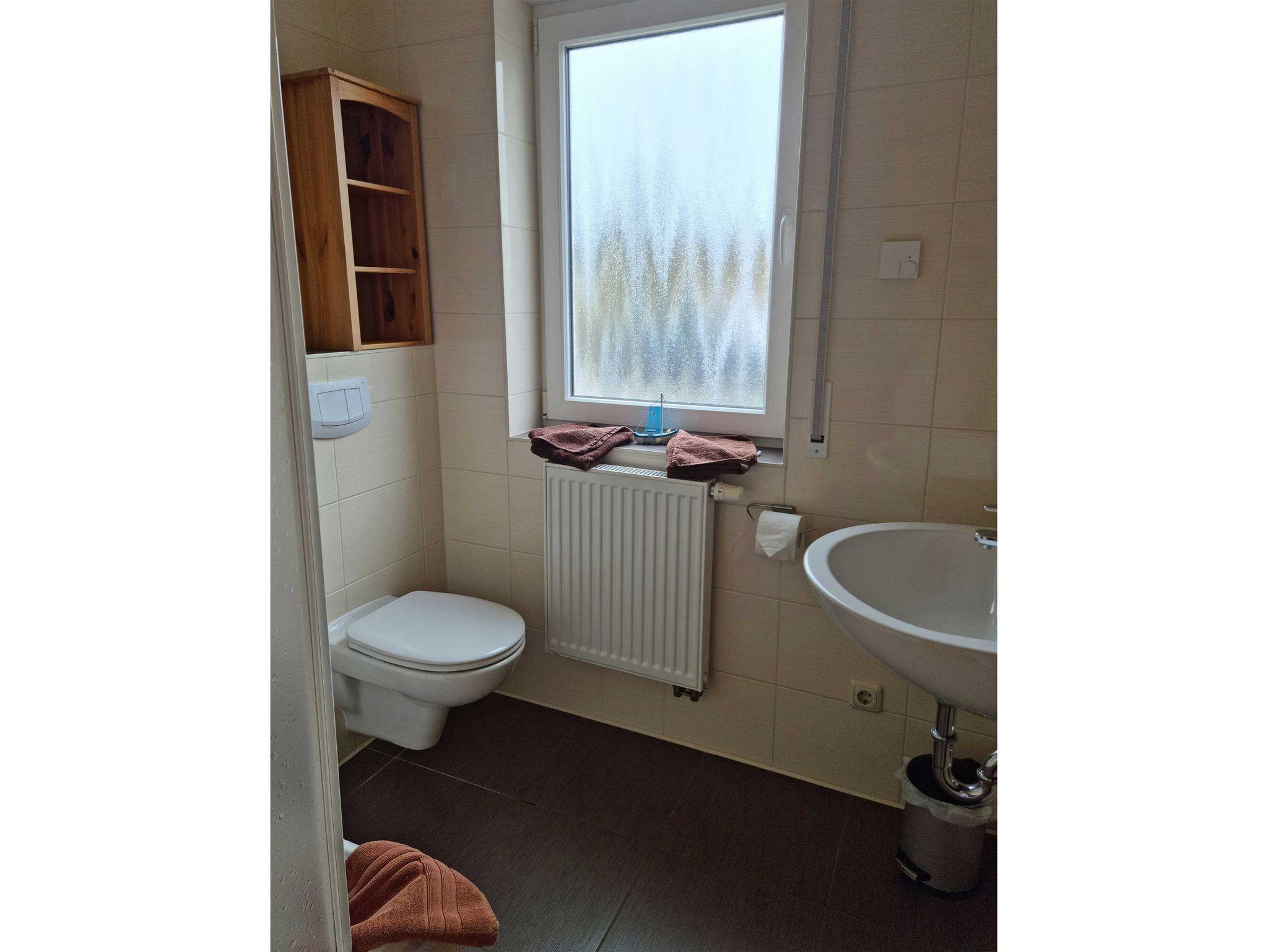 Das Badezimmer verfügt über ein Fenster mit Dusche und WC.