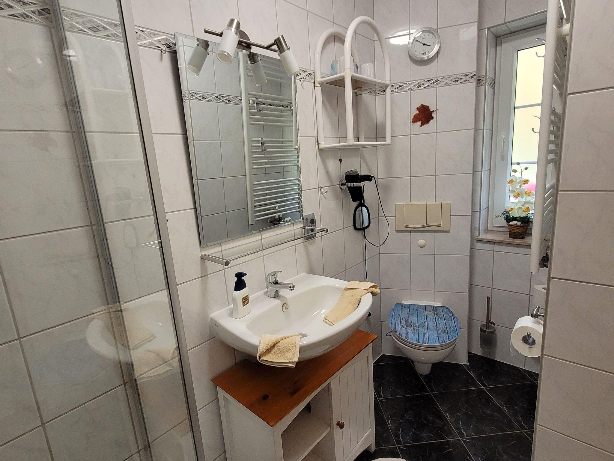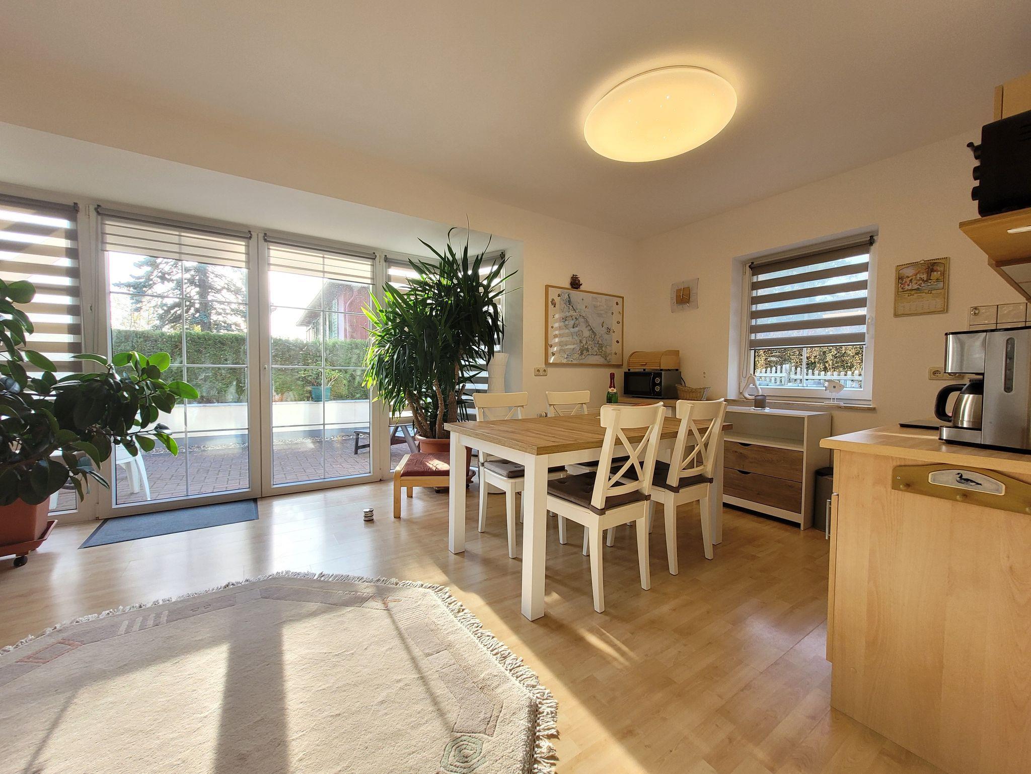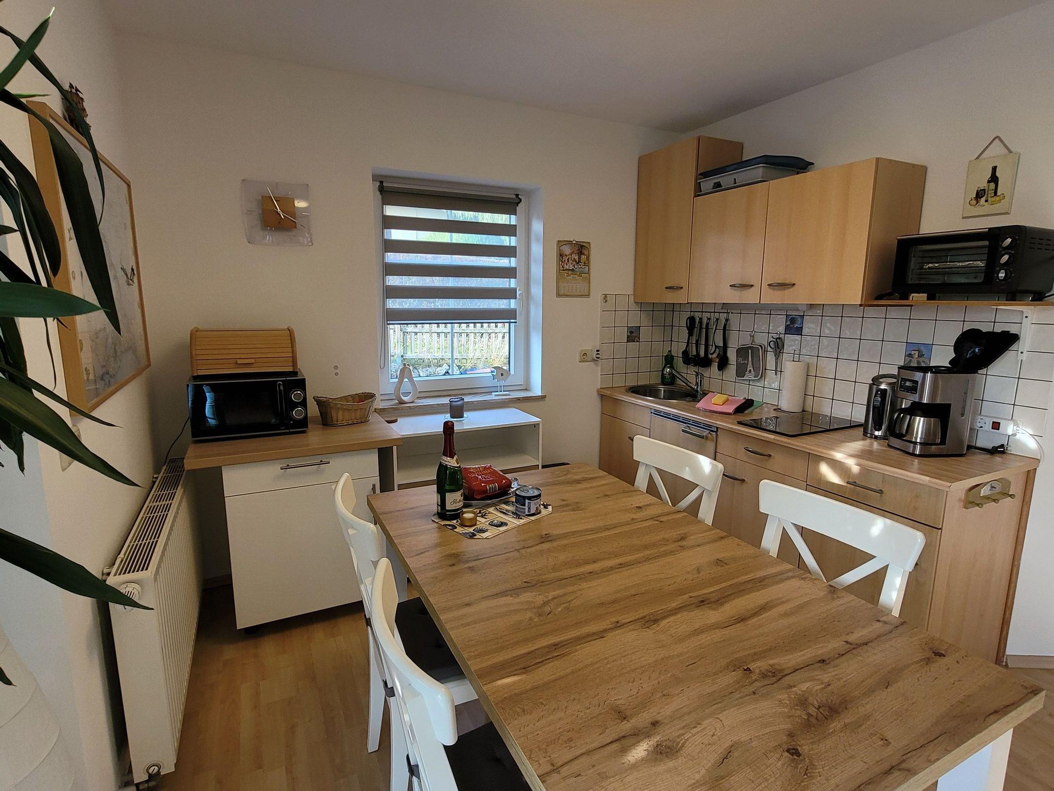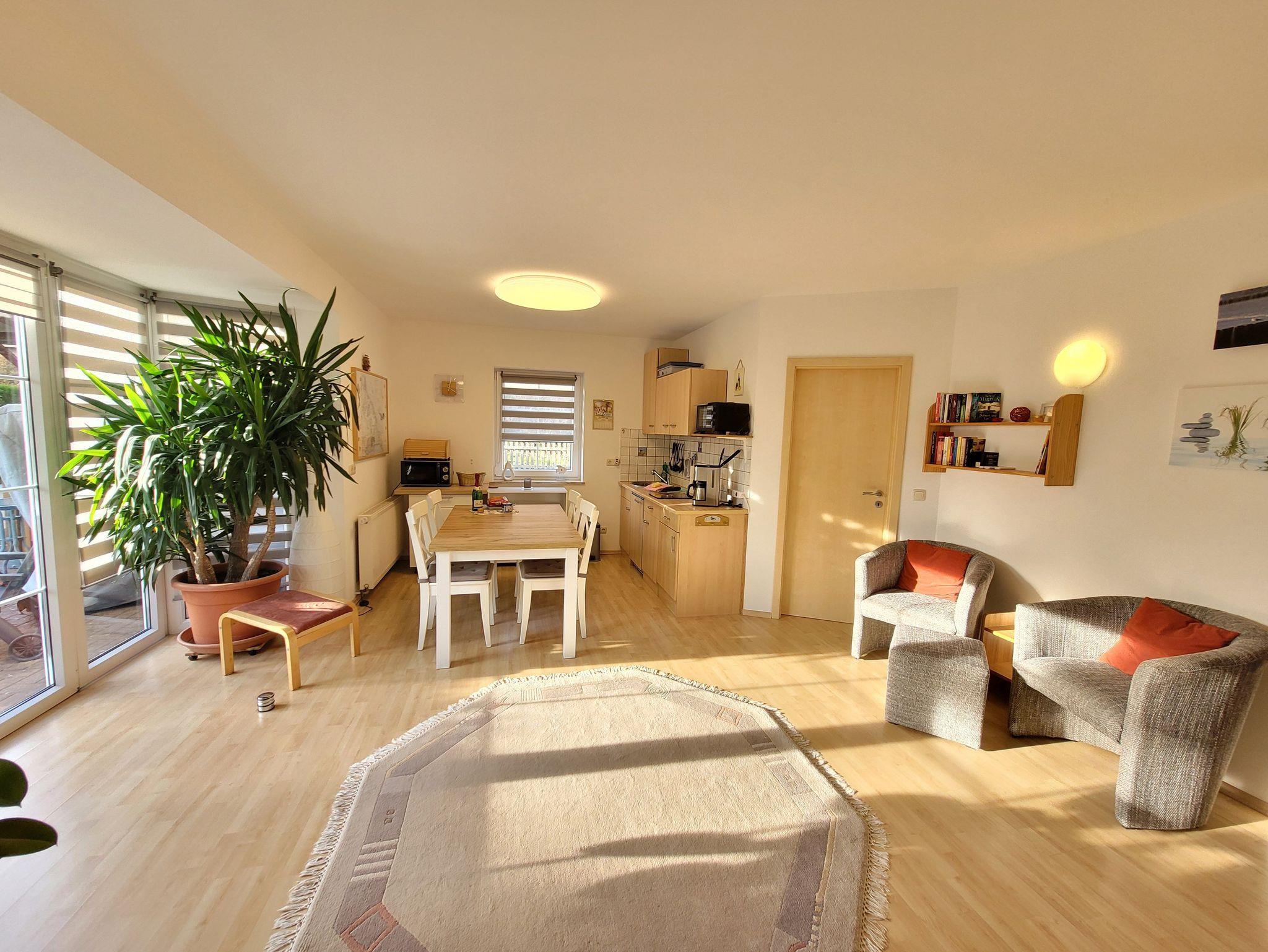 Die Ferienwohnung befindet sich im Untergeschoss des Hauses. Sie hat einen kleinen Flur, ein kleines Bad, ein großes Wohnzimmer mit Küchenbereich und ein Schlafzimmer. Eine Küchenzeile sowie der Essbereich befinden sich im geräumigen Wohnzimmer. Im Wohnbereich können bei Bedarf 2 weitere Personen auf der Couch mit Schlaffunktion übernachten. Über das Wohnzimmer gelangt man auf die Terasse.
