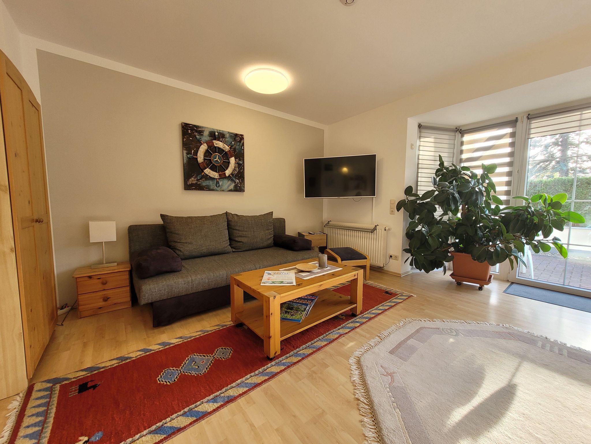 Im Wohnbereich können bei Bedarf 2 weitere Personen auf der Couch mit Schlaffunktion übernachten - somit bietet die Wohnung Platz für maximal 4 Personen. Über das Wohnzimmer gelangt man auf die Terrasse.