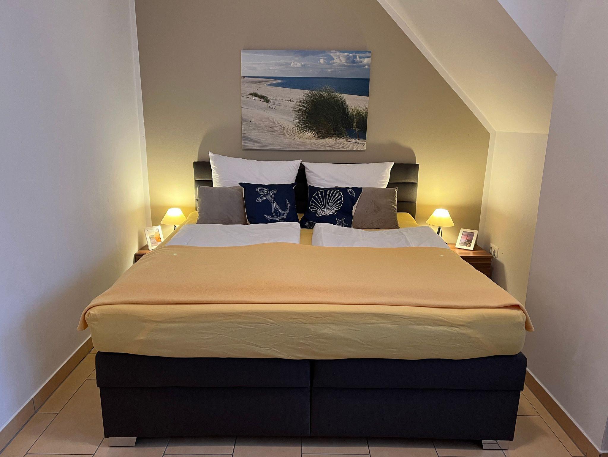 • Im Obergeschoss befinden sich zwei Schlafräume mit je 2 Schlafplätzen. Ein Schlafzimmer ist ausgestattet mit Doppelbett, Nachttischen und einem großen Kleiderschrank. Der andere Schlafraum verfügt über zwei Einzelbetten, Nachttische, Schreibtisch und einen Kleiderschrank.