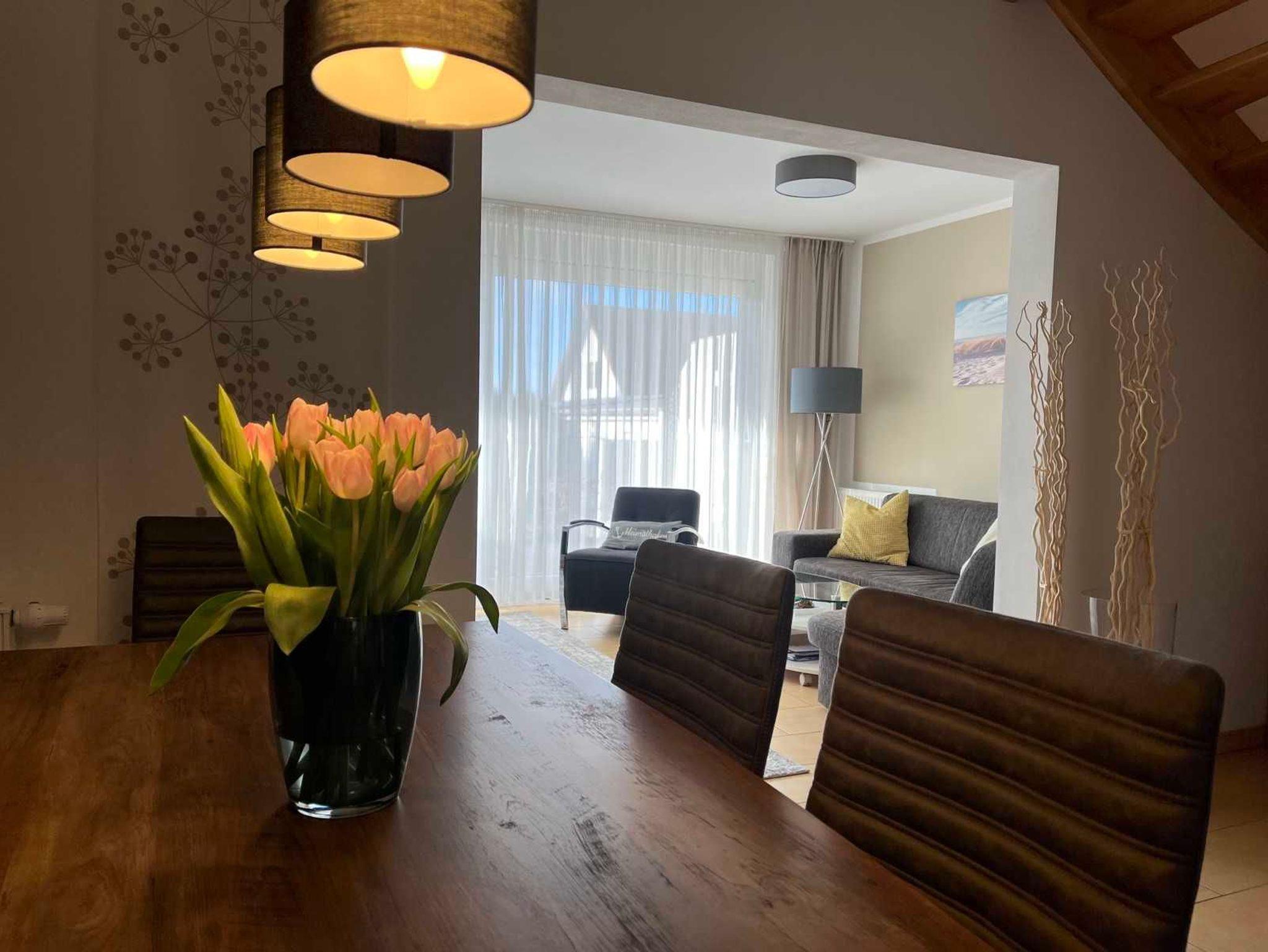Die voll ausgestattete FeWo (Bj. 2010) begrüßt Sie auf zwei Etagen in einer Doppelhaushälfte. Eingangsbereich, Wohnzimmer und Küche im EG sind offen zugeschnitten. Ein kleines Bad mit zweiter Toilette ergänzt den Komfort. Die geräumige Terrasse (Westlage für traumhafte Sonnenuntergänge) und ein ca. 200 qm großer Garten befinden sich auf der Rückseite des Gebäudes. Zwei Zimmer mit je zwei Schlafmöglichkeiten und das Bad mit Dusche empfangen Sie im OG. Eines der Schlafzimmer bietet zwei weitere vollwertige Schlafplätze auf einer Schlafcouch als kostenfreie Aufbettung.