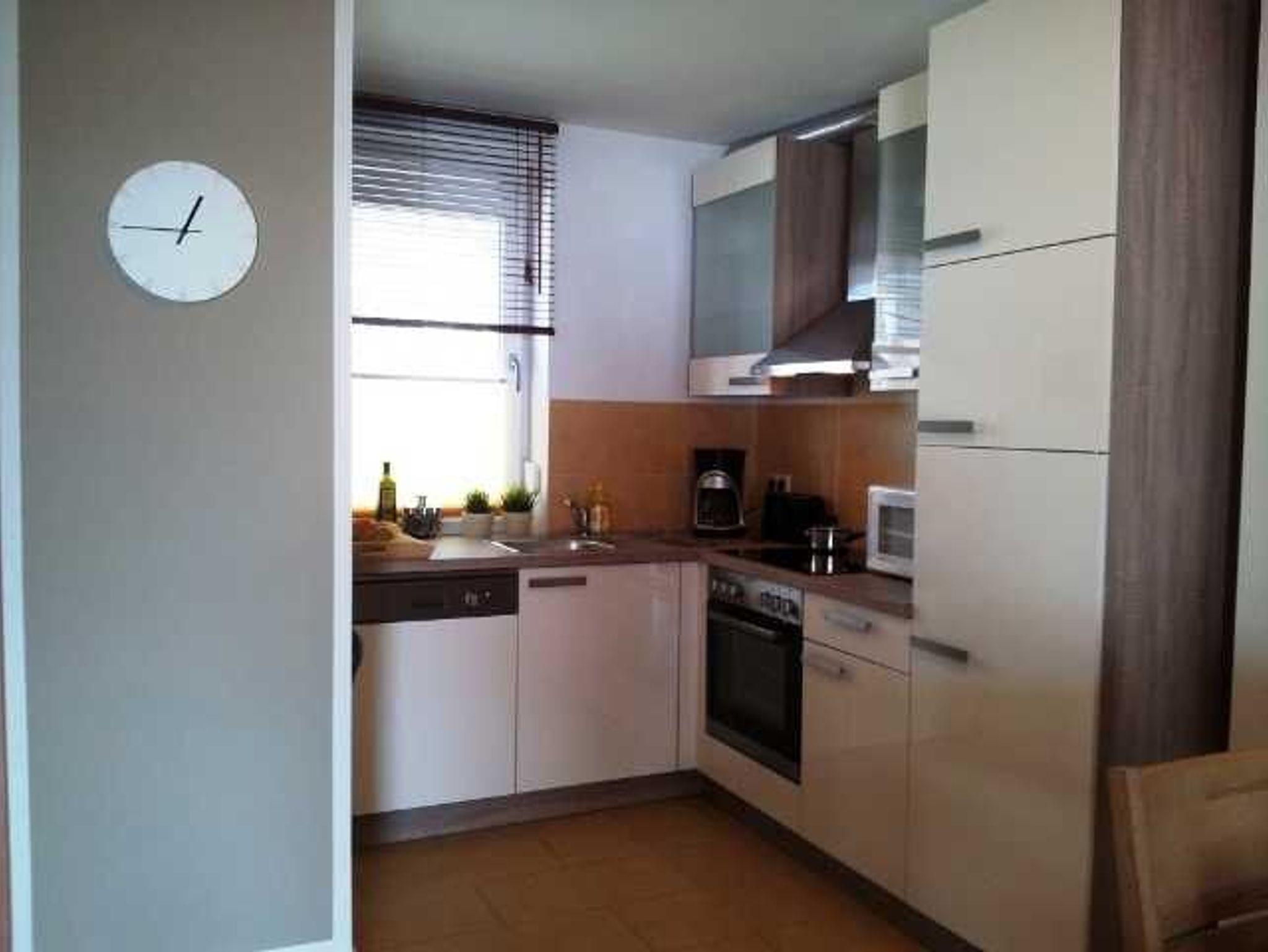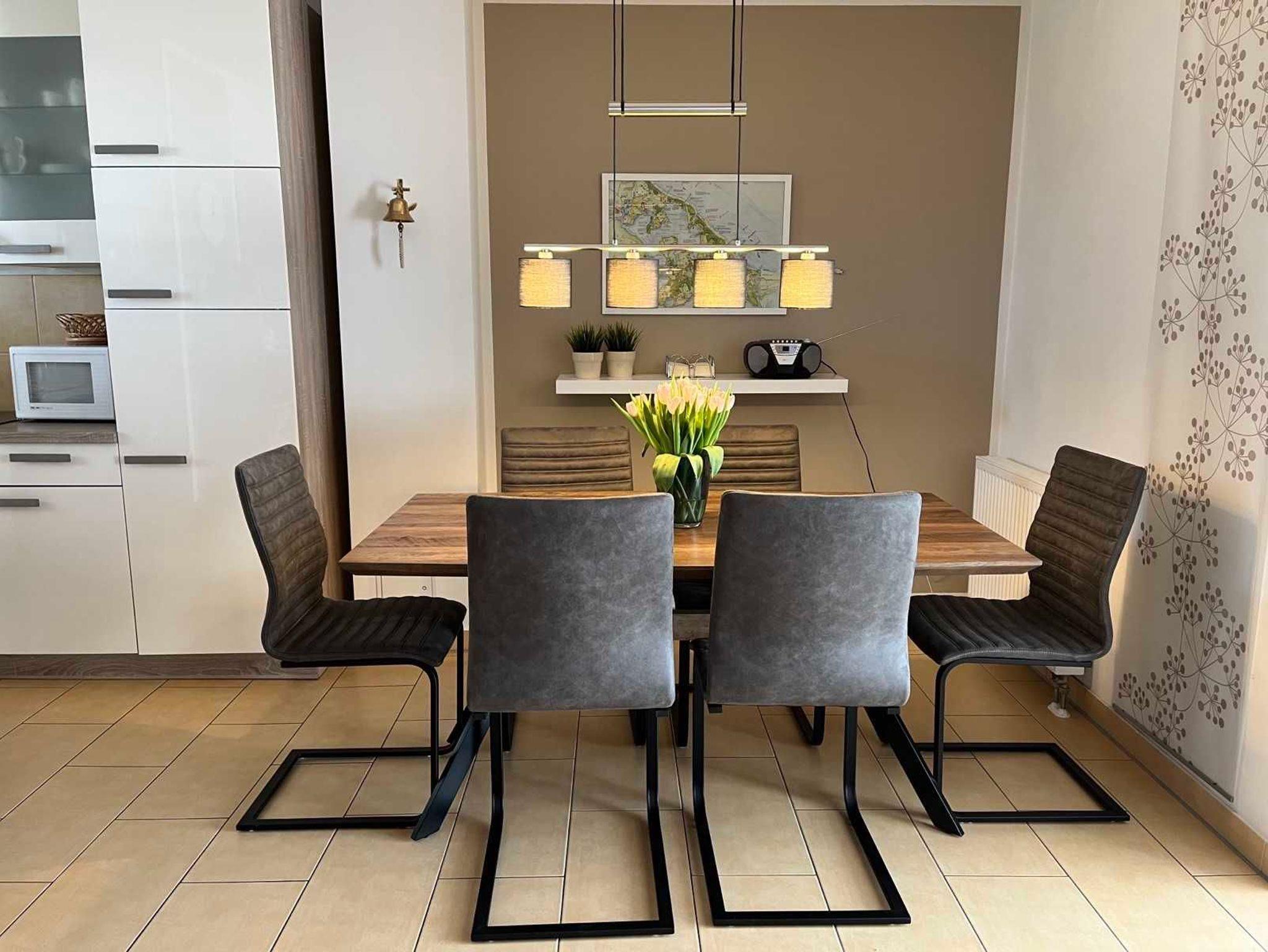 • vom Wohnraum aus betreten Sie die offen gestaltete Küche mit Esstisch. Die Einbauküche ist komplett ausgestattet mit Kochzubehör, Geschirr, Herd, Kühlschrank, Geschirrspüler, Mikrowelle, Wasserkocher und Kaffeemaschine