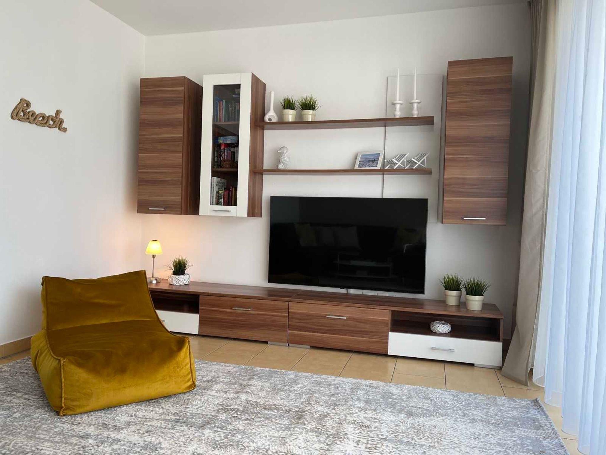 • der große Wohnraum ist ausgestattet mit großem Flachbild-TV, Radio, CD-u. DVD-Player, Eckcouch, Sideboards und Couchtisch