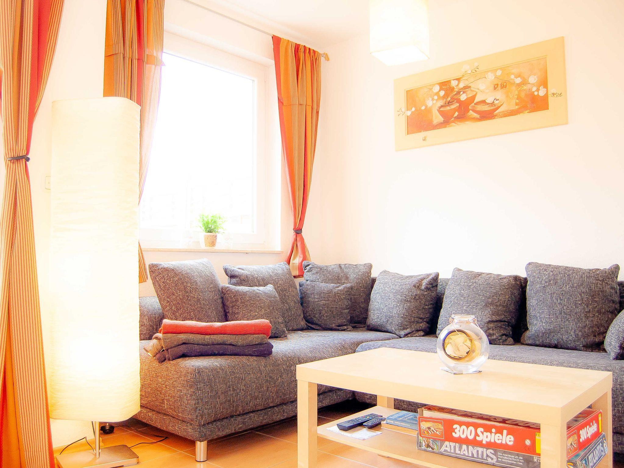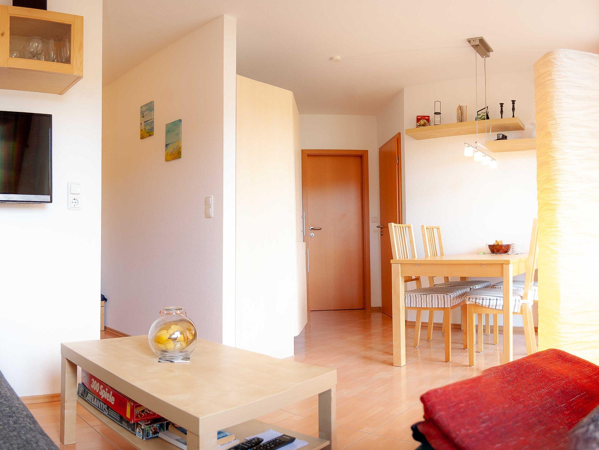 Die Ferienwohnung verfügt über ein Wohnzimmer mit offenem Küchen- und Essbereich, ein separates Schlafzimmer und ein Duschbad. Das Schlafzimmer ist mit einem Doppelbett und Kleiderschrank ausgestattet. Das Wohnzimmer mit ausziehbarer Couchgarnitur ist für die Übernachtung einer Person geeignet. Das Badezimmer mit einer ebenerdigen Dusche und einer Wandheizung zum Trocknen der Handtücher versehen.