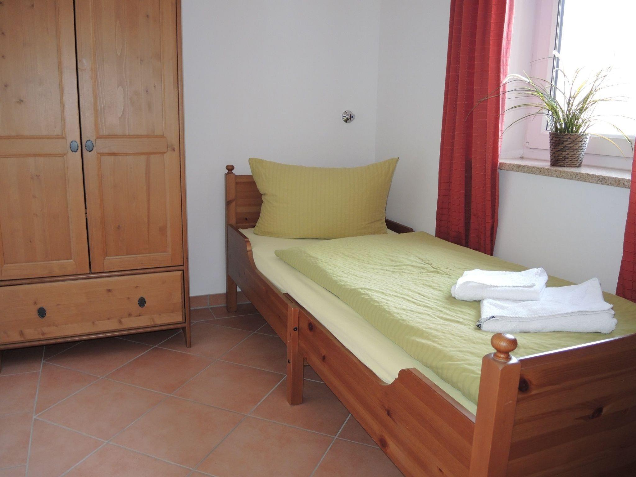 Im Erdgeschoss gibt es ein kleines Zimmer mit Einzelbett und Schrank.