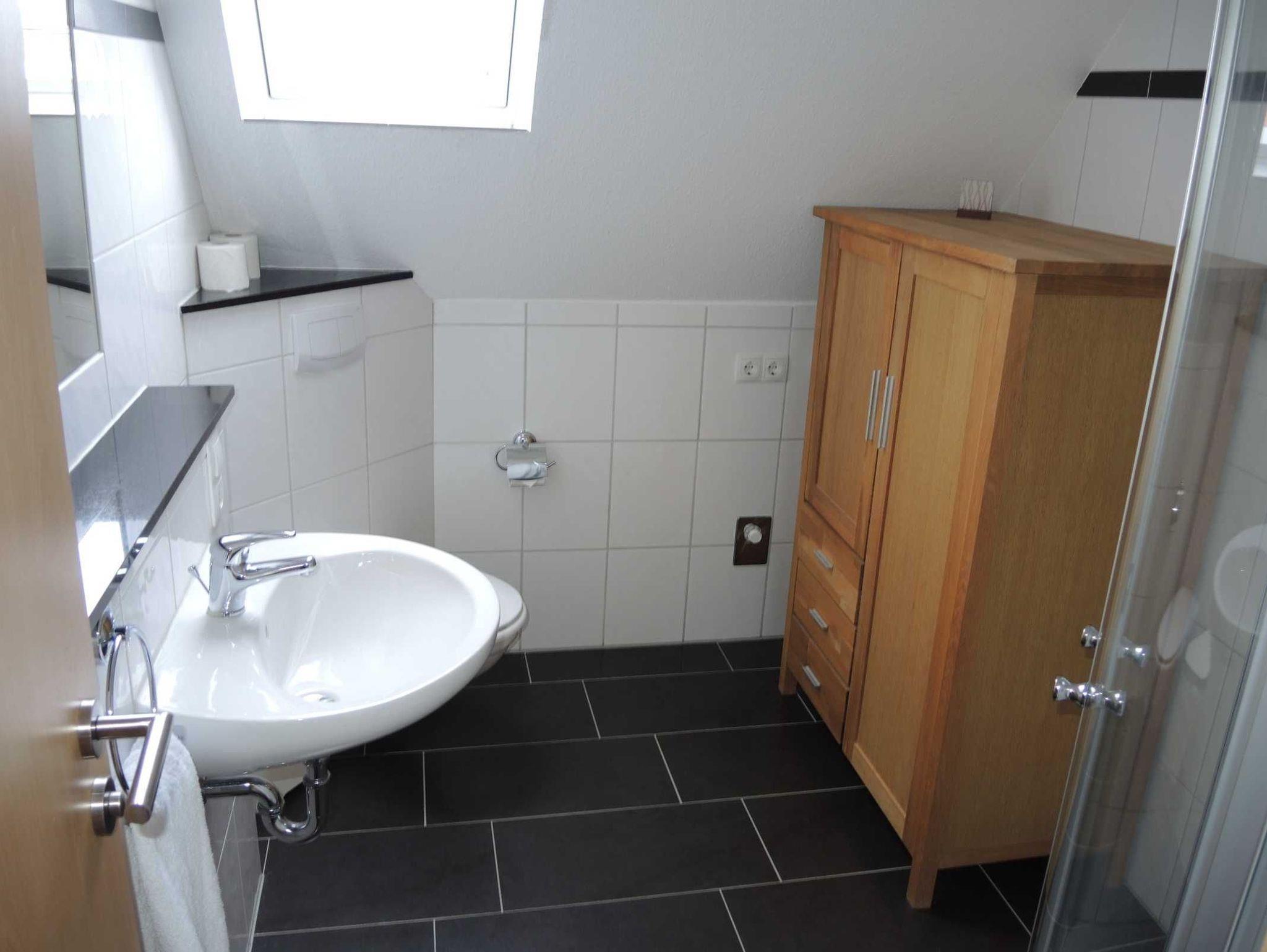 Das Badezimmer im Obergeschoss ist mit Waschbecken und Dusche ausgestattet.