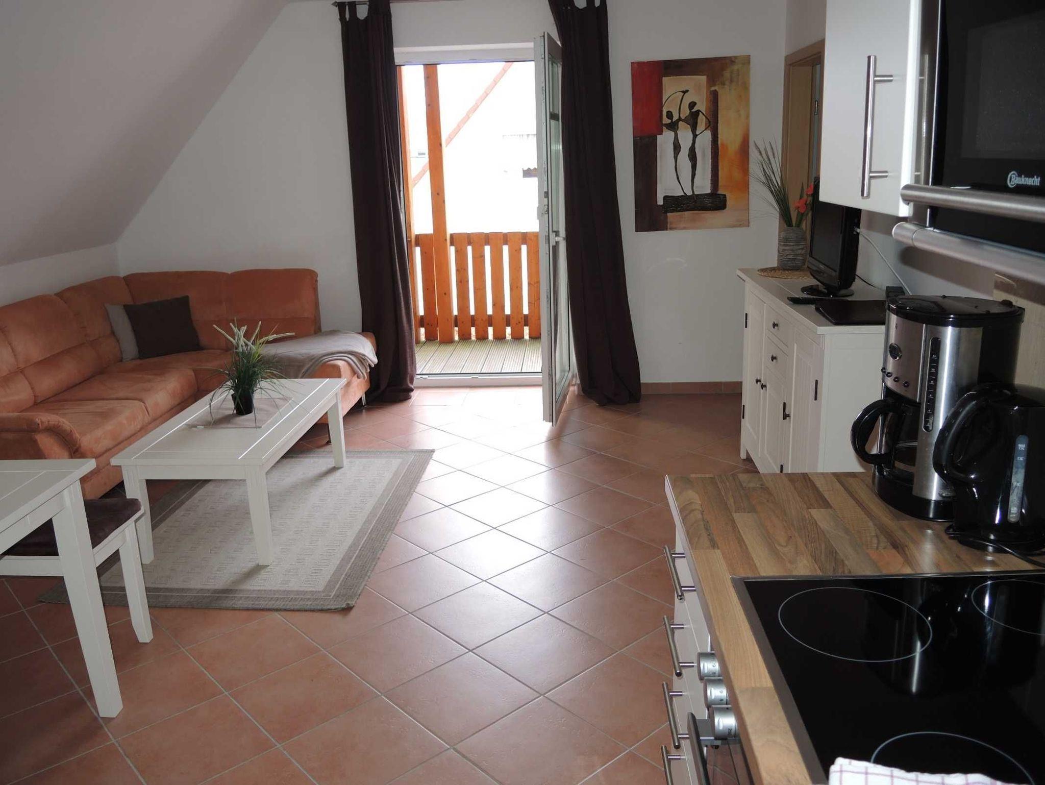 Unsere Suite Lisa mit Balkon ist modern und gemütlich eingerichtet. Die Suite ist mit *** Sternen klassifiziert. Die Küche ist in den Wohn- und Essbereich integriert. Von dort gelangt man direkt auf den Balkon.