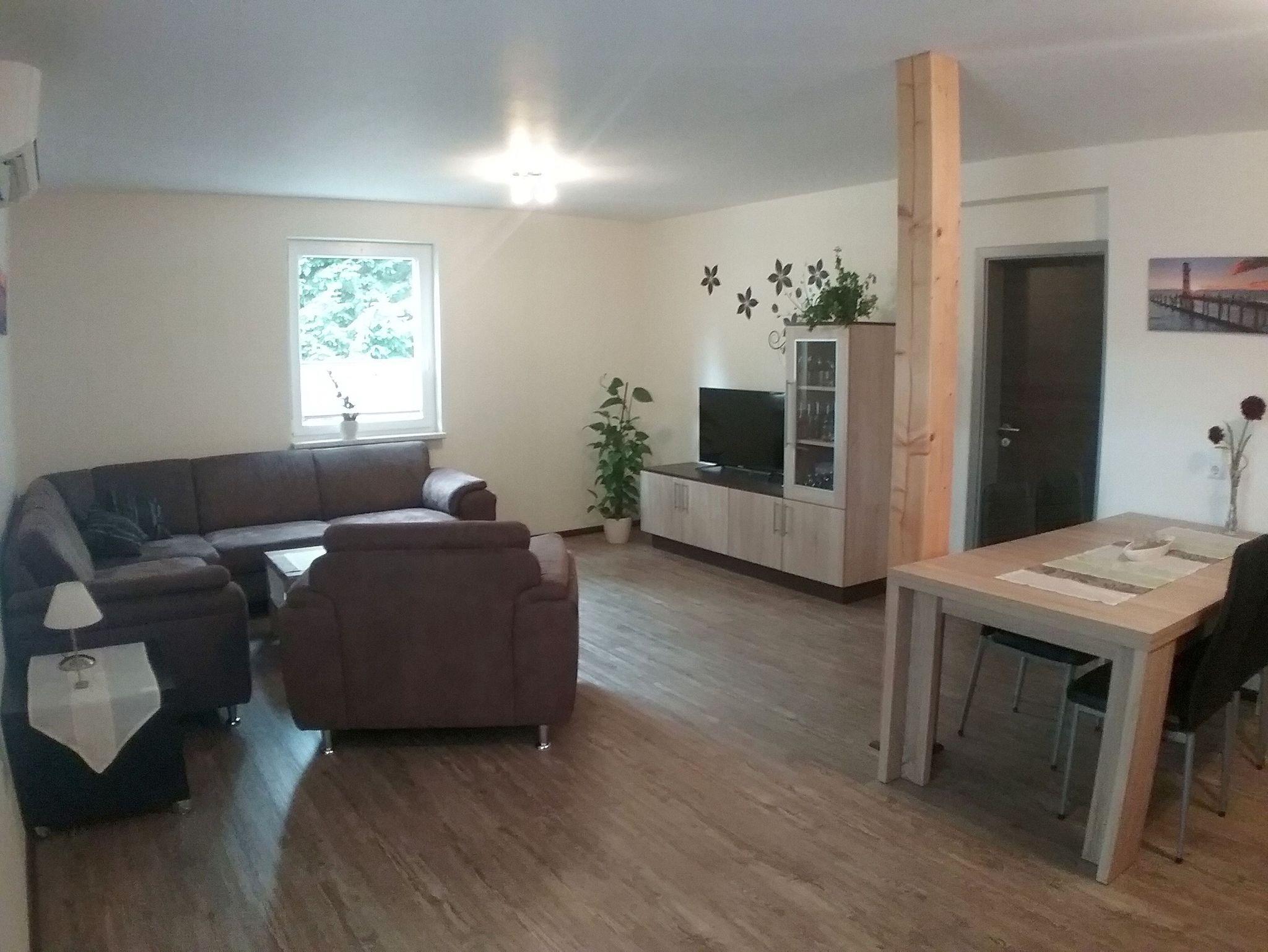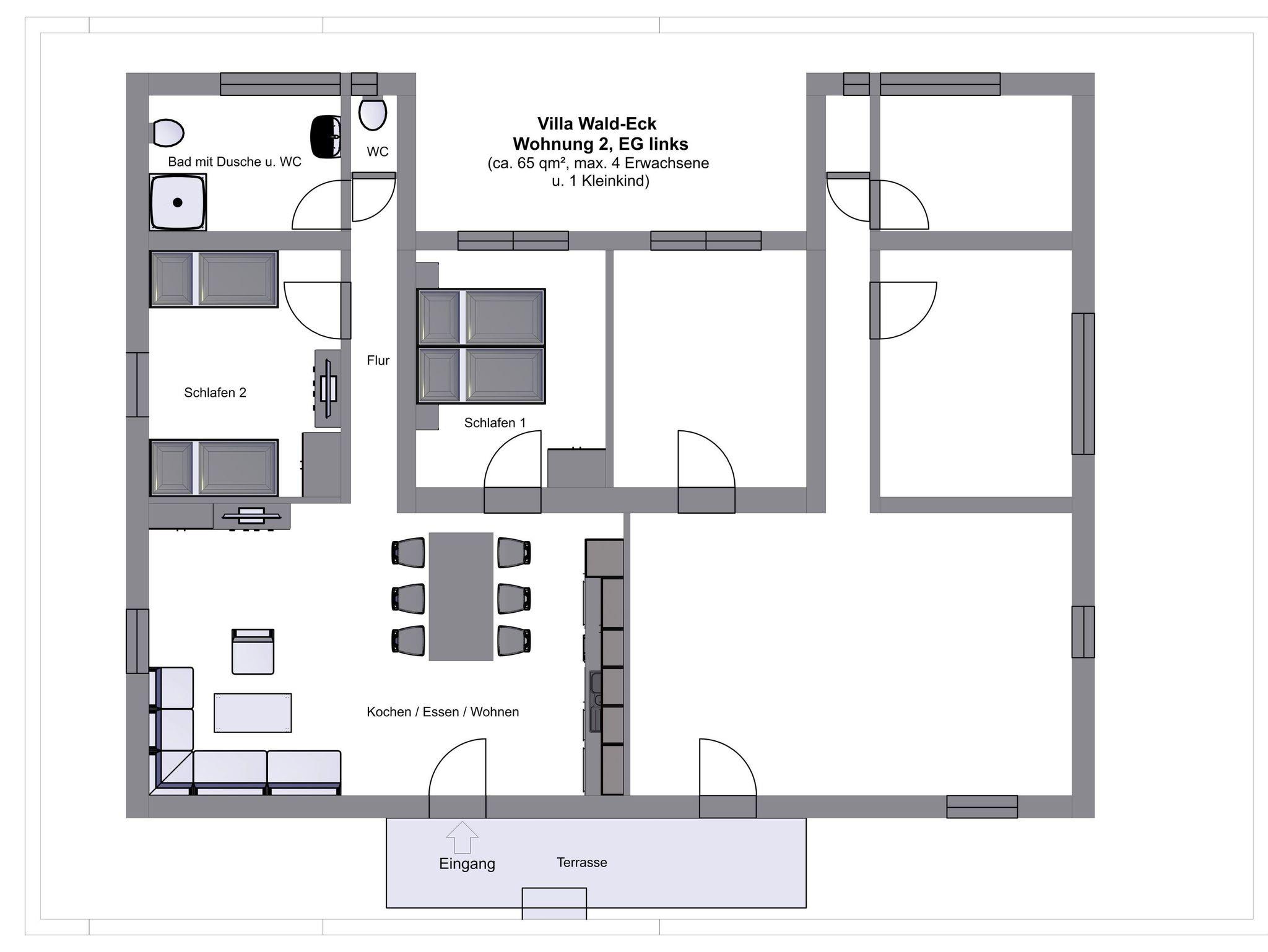 Die 3-Raumwohung im EG ist 65 qm groß und für 4 Personen, zzgl. Aufbettung für 2 Personen auf dem Schlafsofa im Wohnbereich, sowie ein Kleinkind im Kinderreisebett geeignet. Sie finden hier einen offenen Wohn-/Essbereich mit Küchenzeile, Essplatz und gemütlicher Sitzecke. In der Küche finden Sie alles was für einen entspannten Urlaub wichtig ist. Weiterhin gibt es ein Schlafzimmer mit Doppelbett und einen weiteren Schlafraum mit 2 Einzelbetten. Des Weiteren finden Sie ein Badezimmer mit Dusche und 1 Gäste-WC vor. Sowohl in der Sitzecke, als auch in dem Schlafraum mit den 2 Einzelbetten steht ein TV- Gerät.