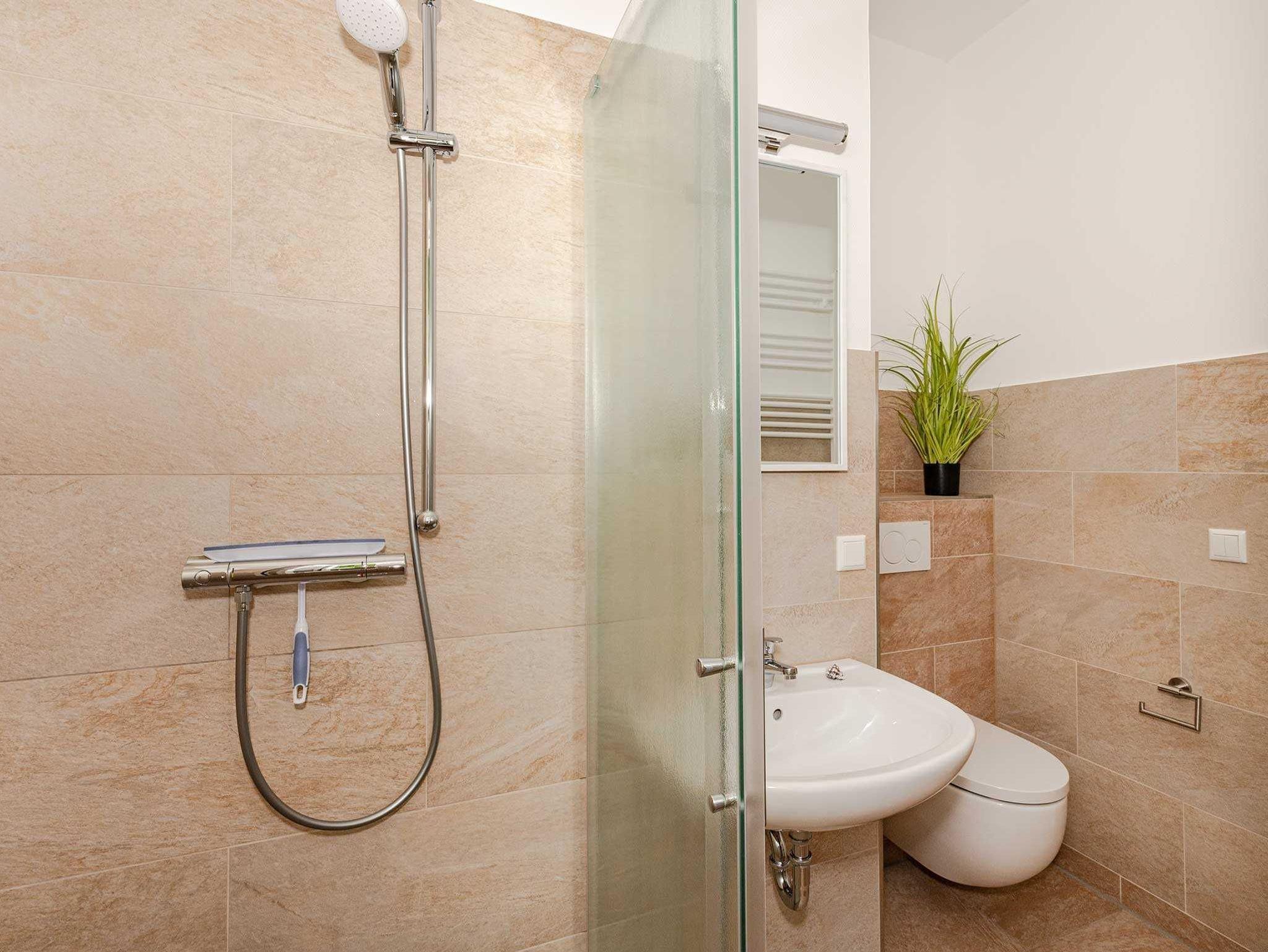 Dusche, WC und Handwaschbecken