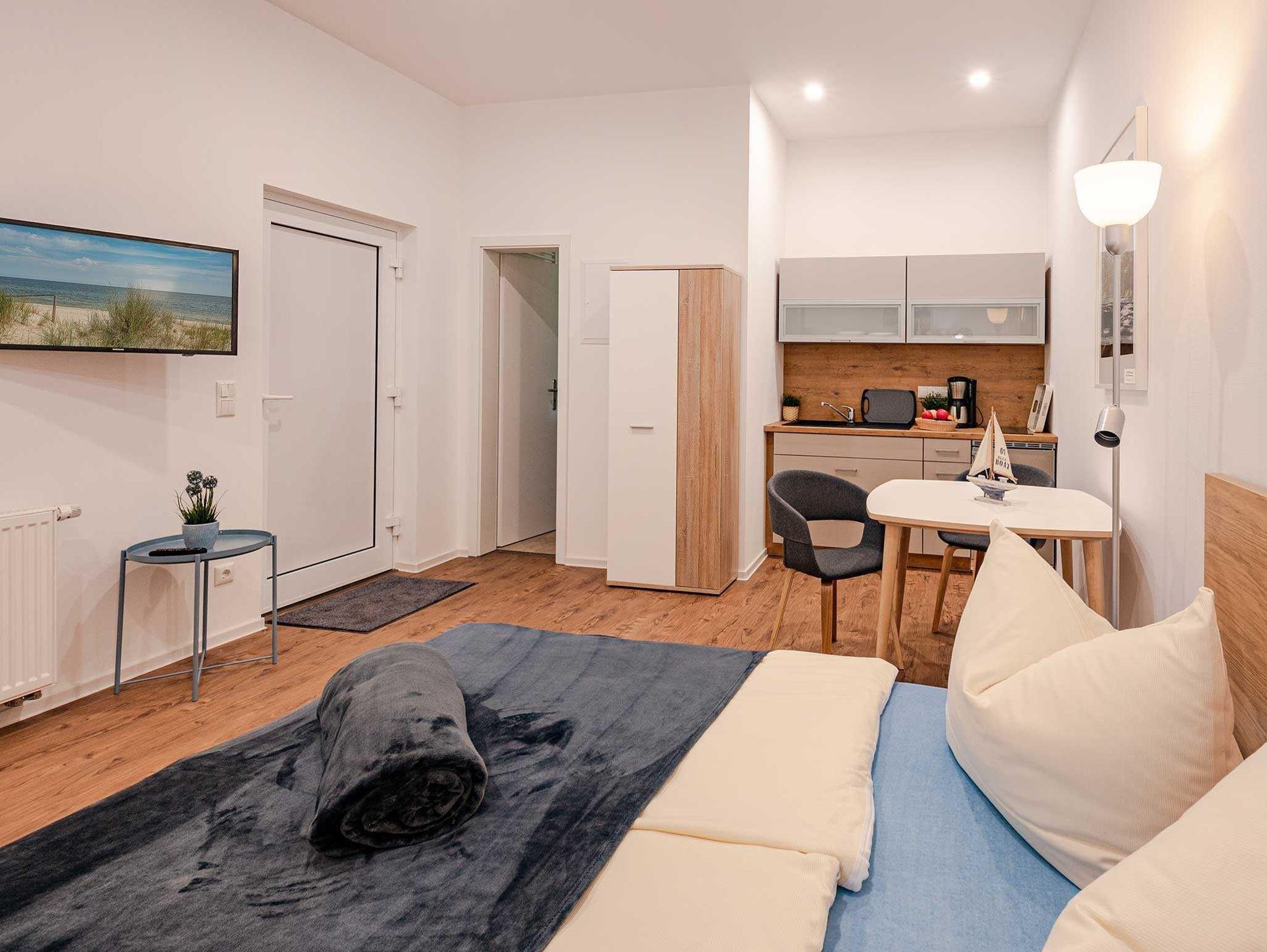 - Essplatz, Doppelbett (1,60 breit), Kleiderschrank, Flachbild-TV, Pantryküche (Kühlschrank, 2 Kochplatten, Spüle) mit Geschirr, Kaffeemaschine, Wasserkocher, Toaster