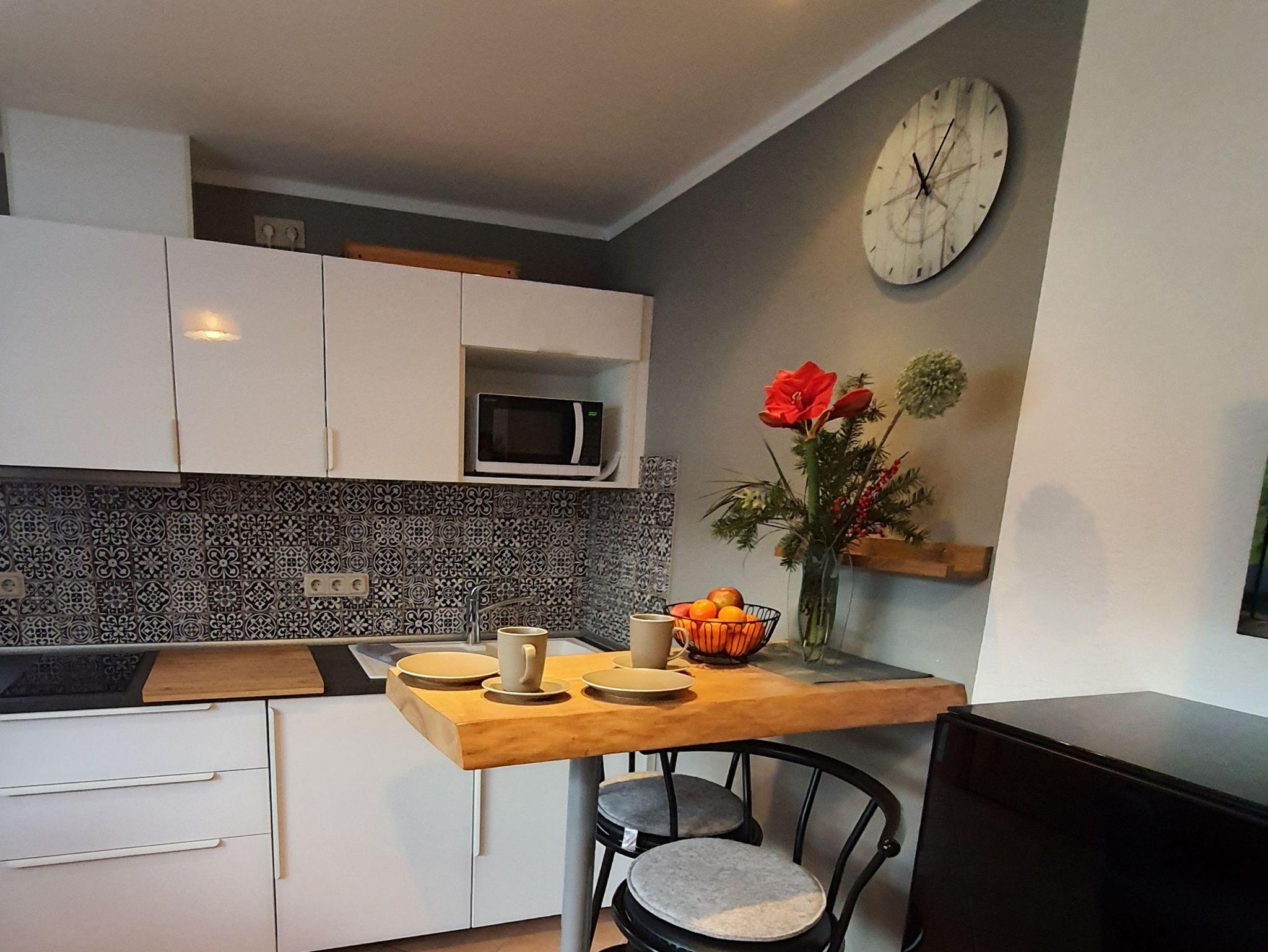 Die integrierte Küchenzeile ist mit einem Kühlschrank, Mikrowelle, Toaster, Kaffeemaschine, Wasserkocher und einem Doppelkochfeld ausgestattet. Das moderne Badezimmer verfügt über eine ebenerdige Dusche, WC und Haartrockner.