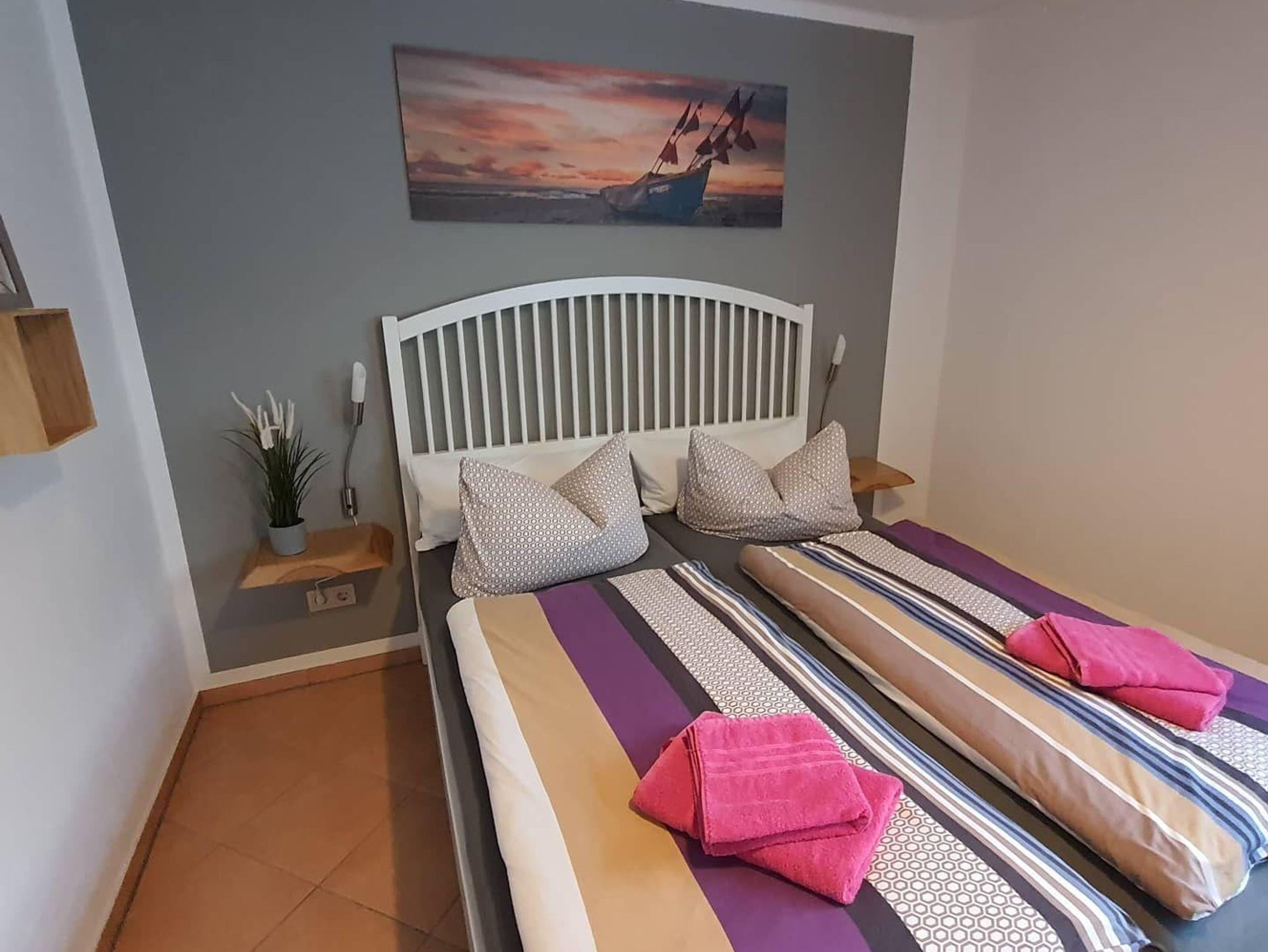 Herzlich Willkommen im Ostseebad Ückeritz. In unserer gemütlichen Ferienwohnung erwartet Sie ein kombinierter Wohn-/Schlafbereich mit Doppelbett und Leselampen, eine gemütliche Sitzecke mit zwei Sesseln und ein Smart-TV.