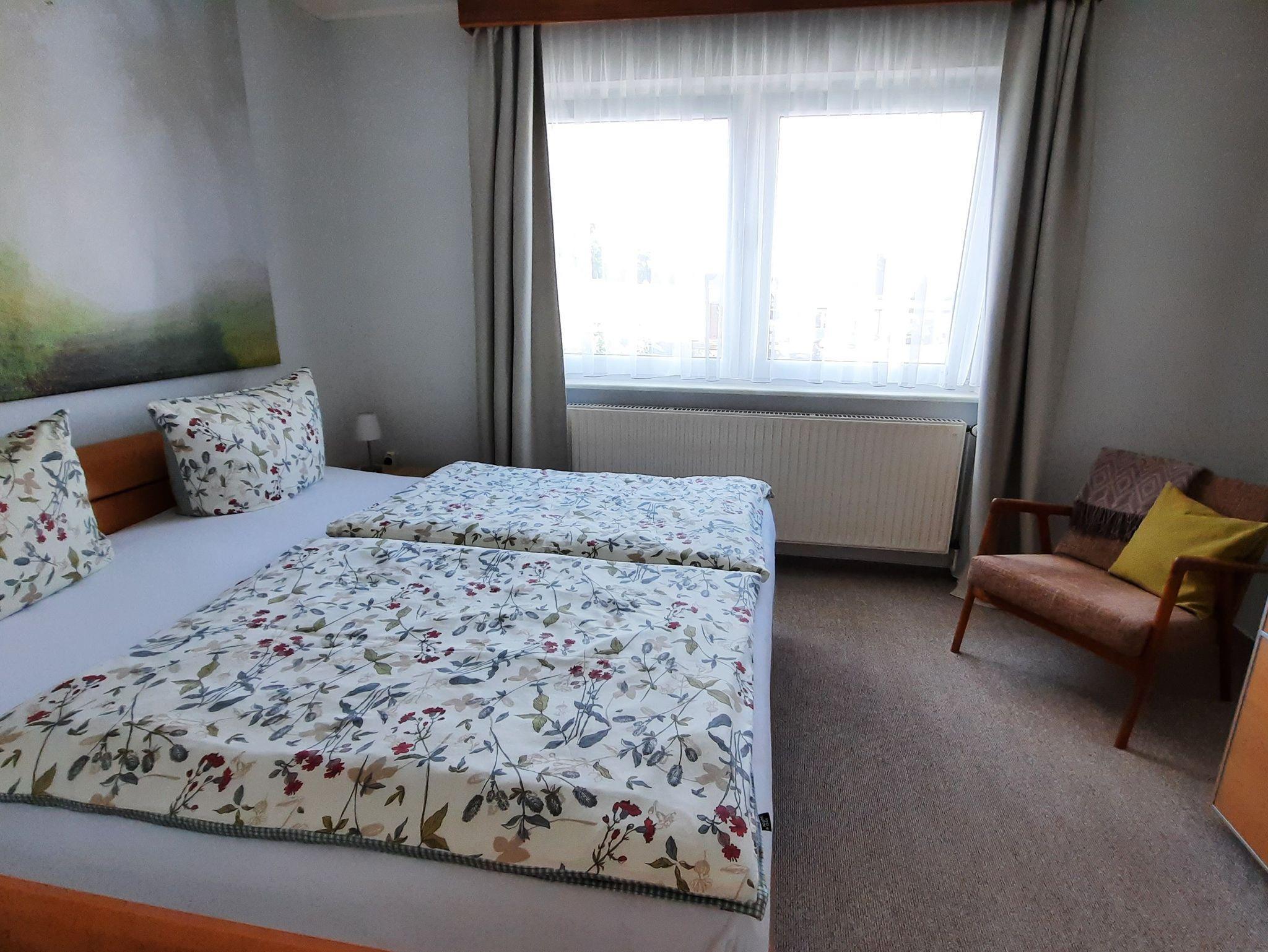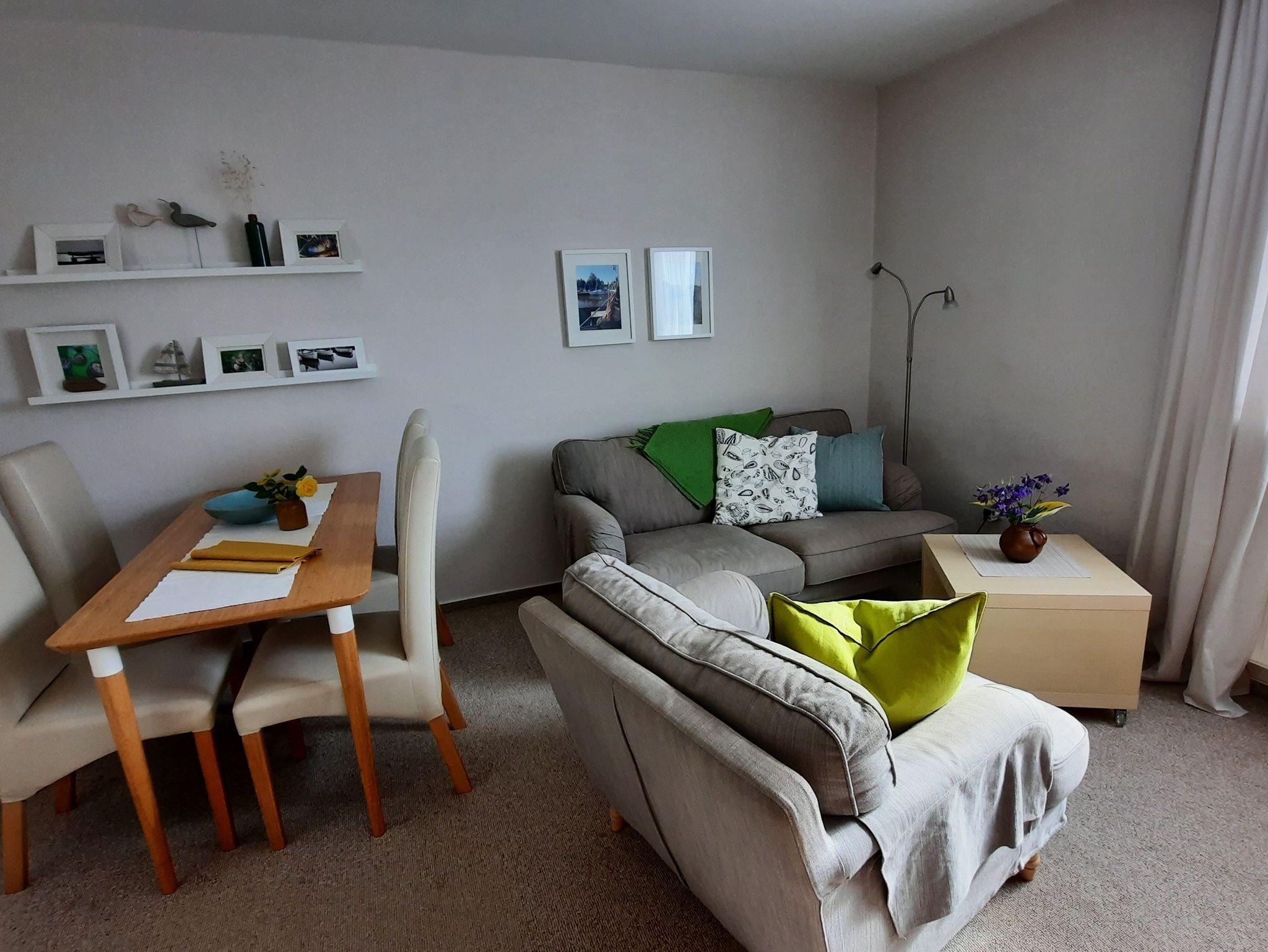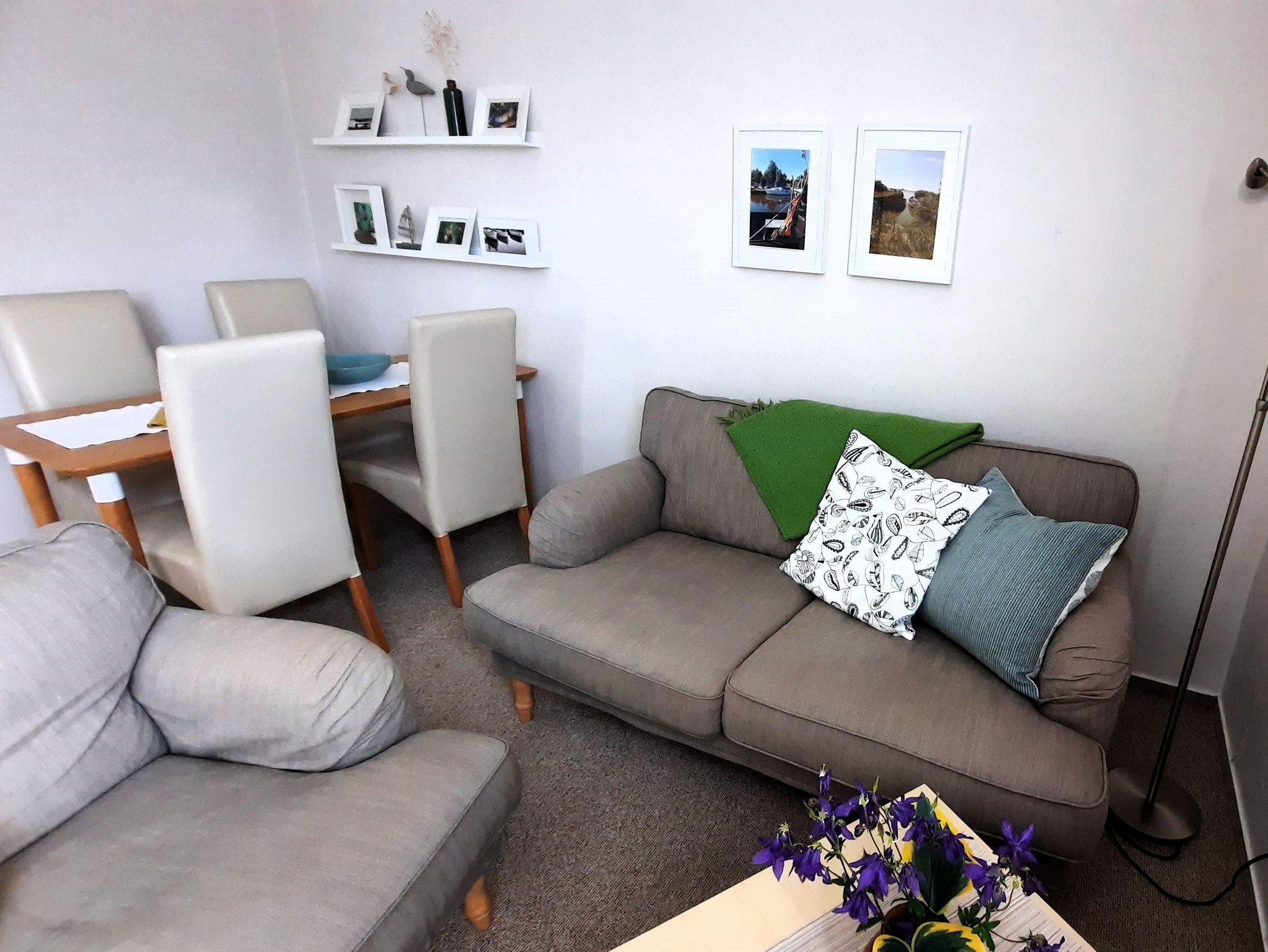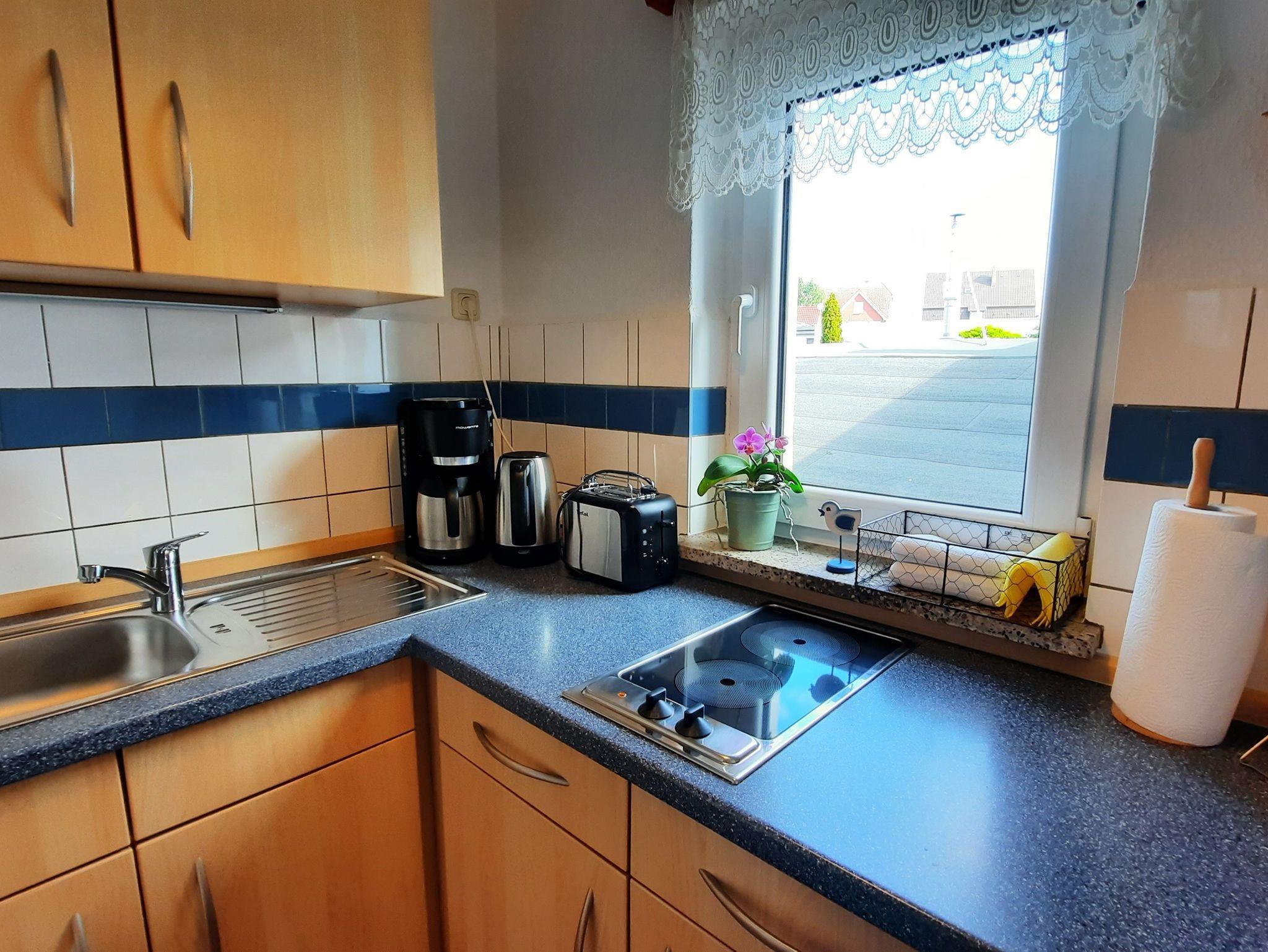 Die Nichtraucher-Ferienwohnung besteht aus einem Wohnzimmer (Couch, Sessel, Couchtisch, Essplatz, Sat-TV), einem Schlafzimmer (Doppelbett, Kleiderschrank und Sessel), einer separaten kleinen Küche (Einbauküche mit Kühlschrank, zwei Ceran-Kochfeldern, Spüle) und einem Bad mit Dusche/ WC. Die Erstausstattung Bettwäsche ist inklusive. Bitte bringen Sie Handtücher mit. (Achtung: Die Treppe zur Wohnung hat an einer Stelle eine niedrige Durchgangshöhe ca. 1,70m) Keine Haustiere!