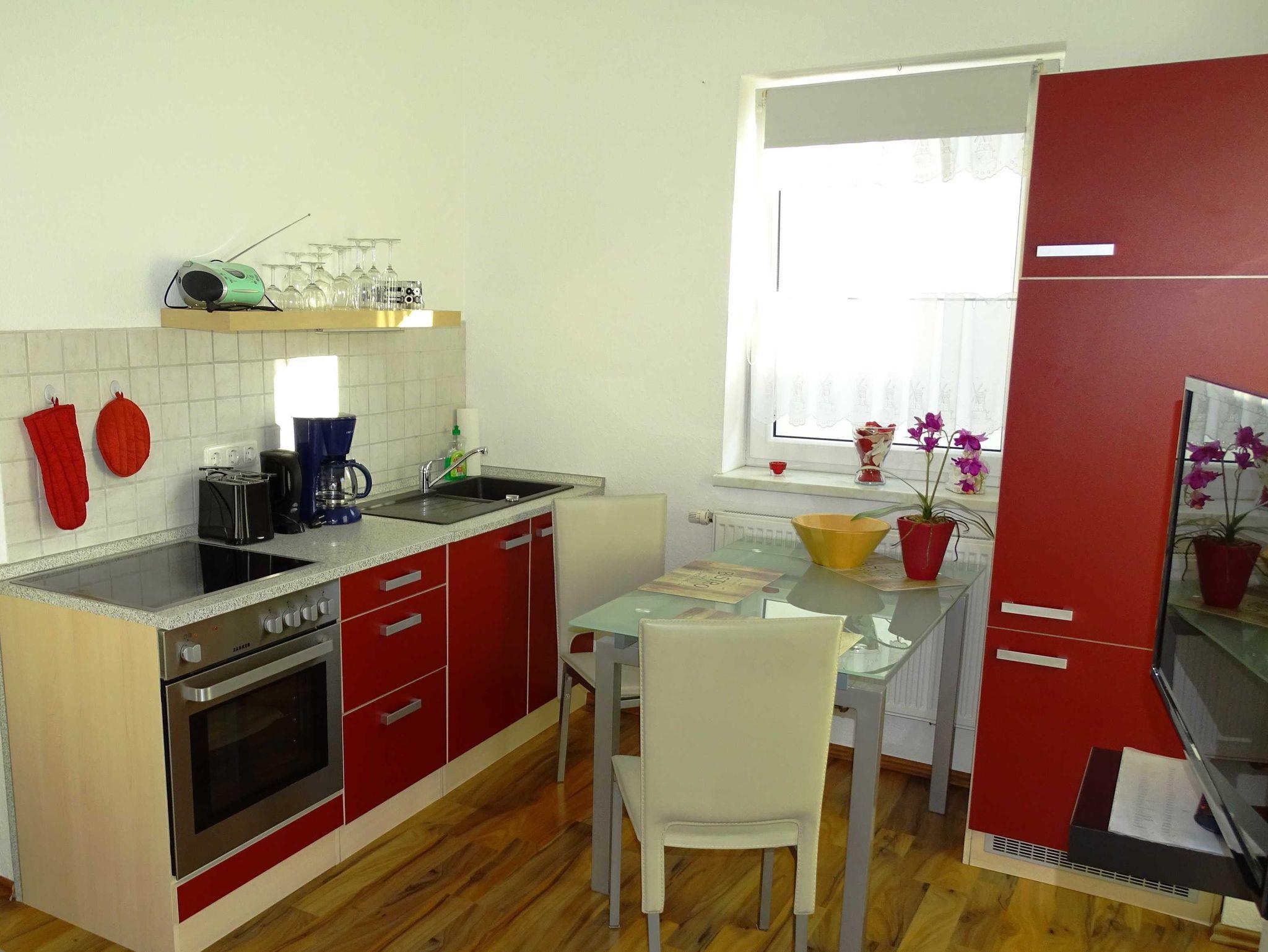 Die Ferienwohnung 1 mit 40 m² verfügt über einen Wohnraum mit Küchenzeile mit Fernseher und gemütlicher Couchecke. Im separaten Schlafraum finden Sie ein bequemes Doppelbett und einen Kleiderschrank. Das Bad ist mit Dusche und WC ausgestattet. Auf der möblierten Terrasse können Sie entspannt den Tag ausklingen lassen. Einen PKW-Stellplatz finden Sie ebenfalls auf dem Grundstück.