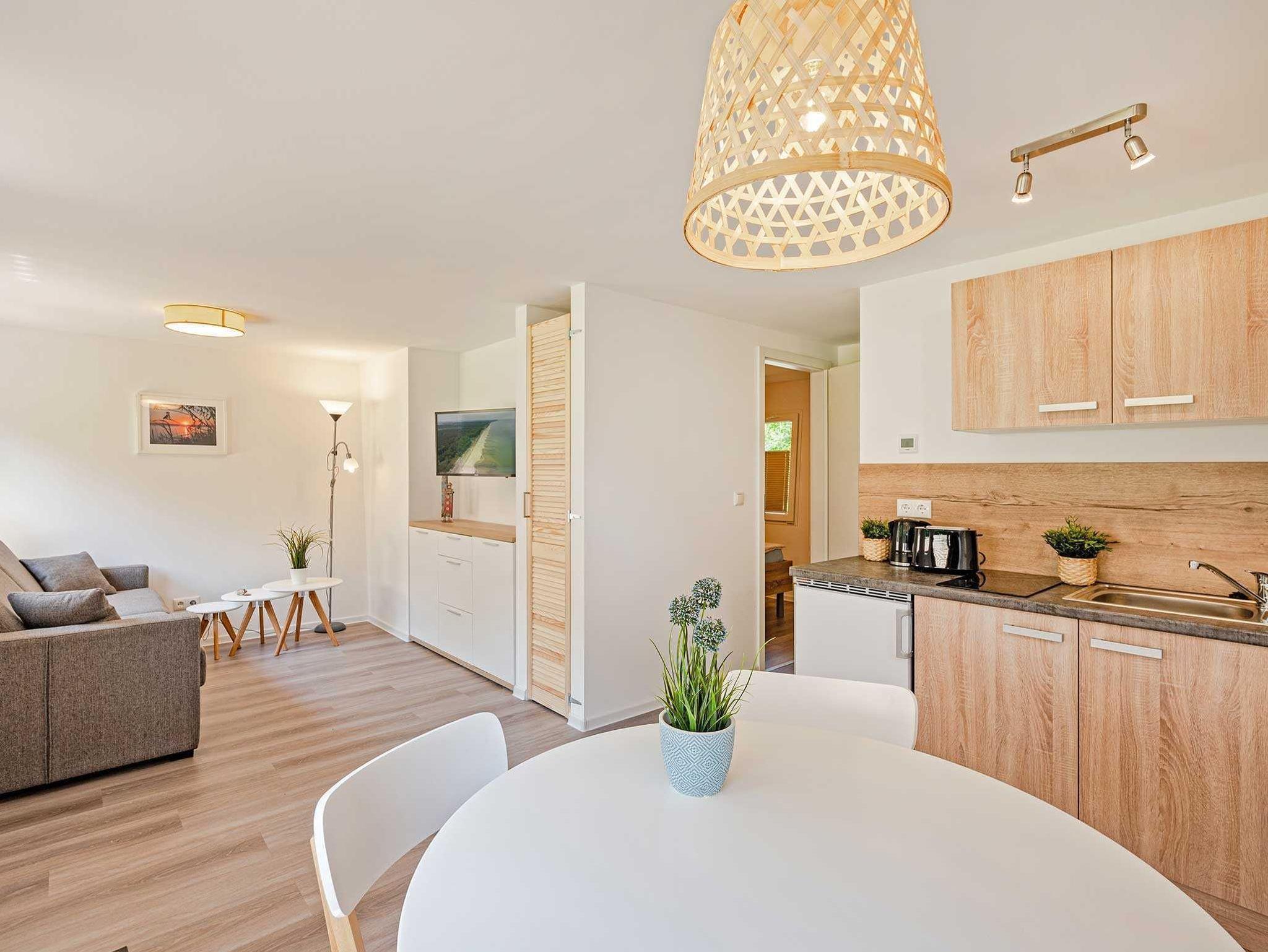 - 1 Wohnraum mit Küchenzeile (Kühlschrank, Spüle, 2er-Ceranfeld, Kaffeemaschine, Toaster, Wasserkocher) und Essplatz, Fernseher, 1 Couch, Sideboard