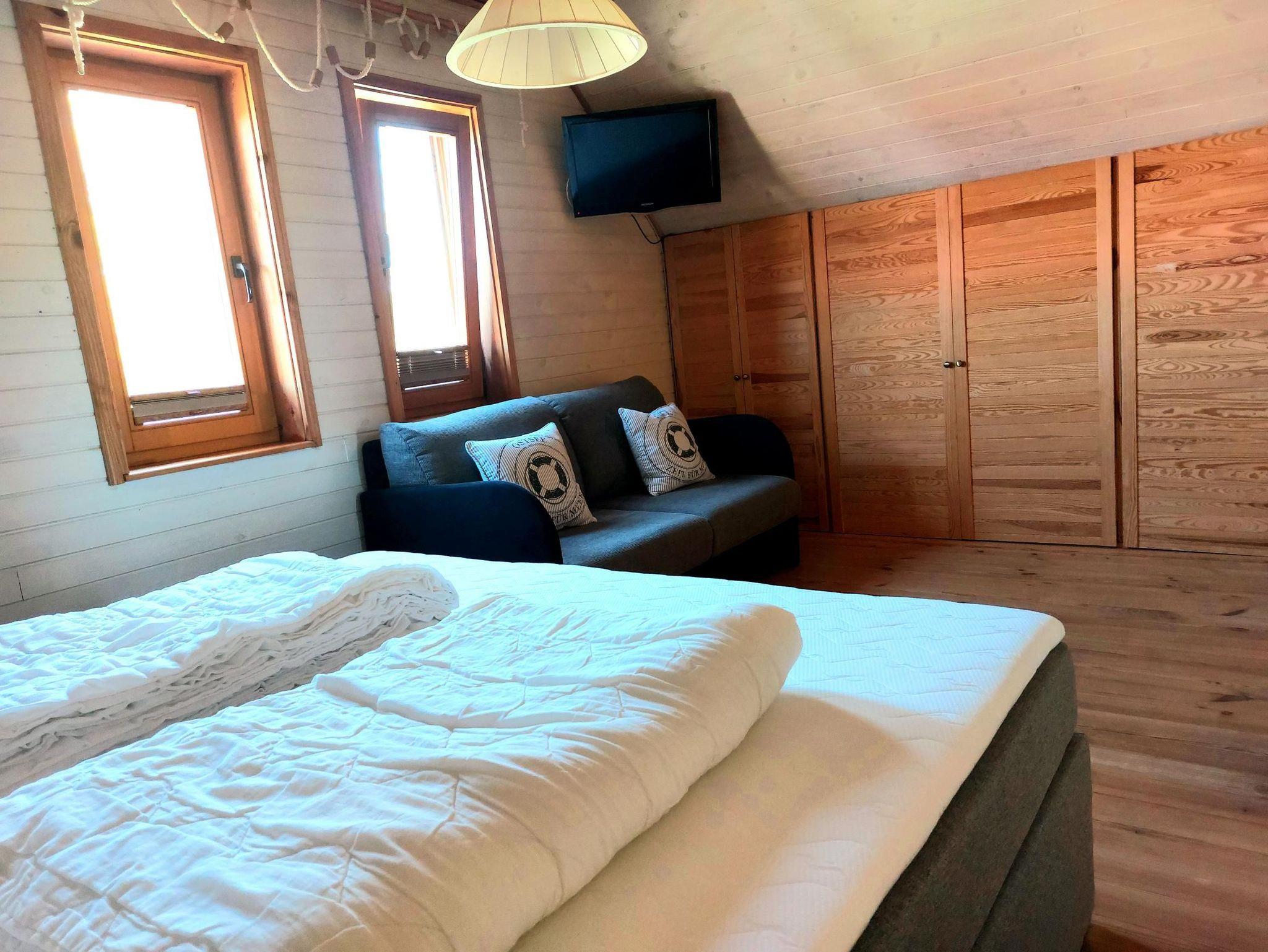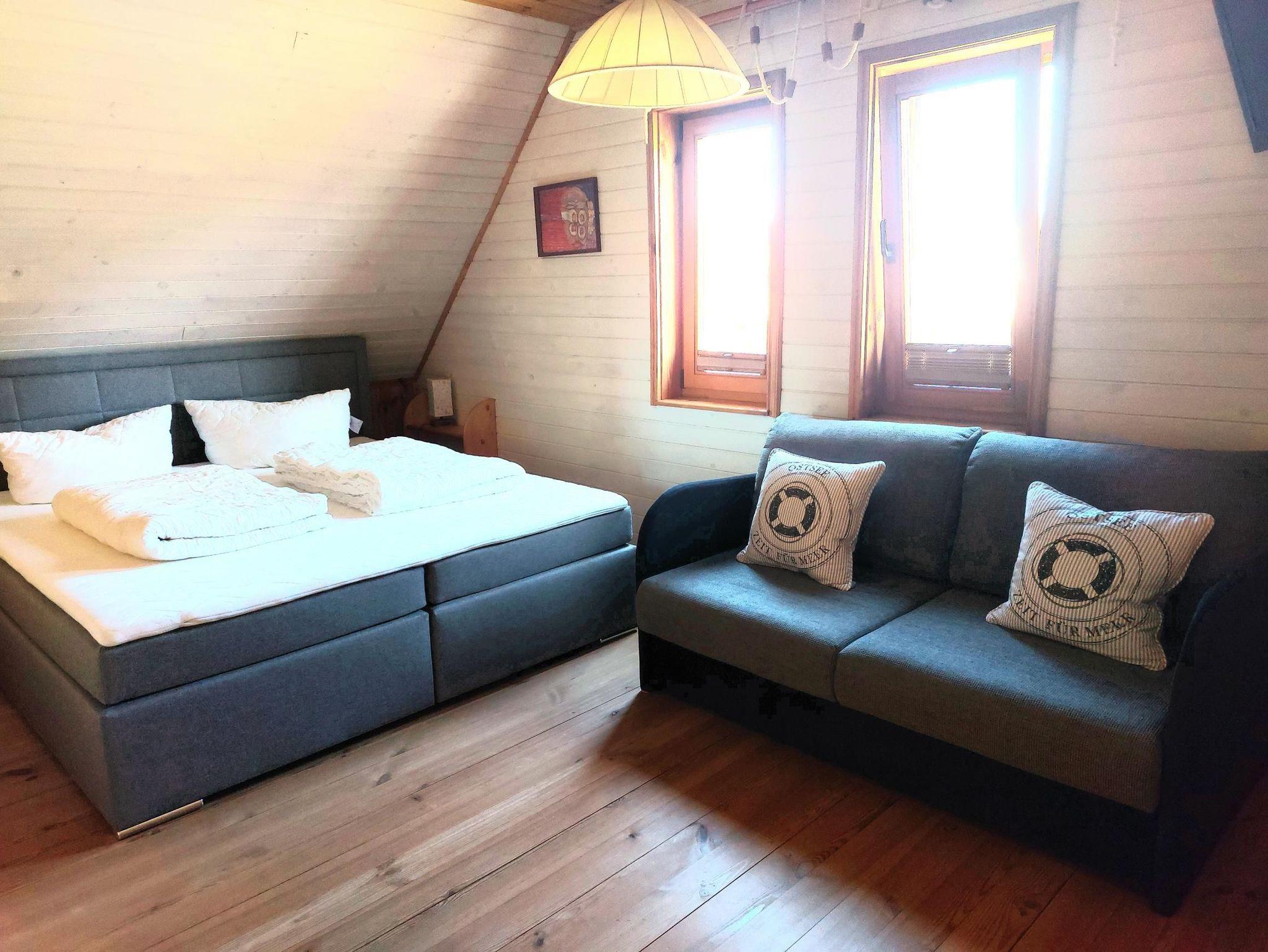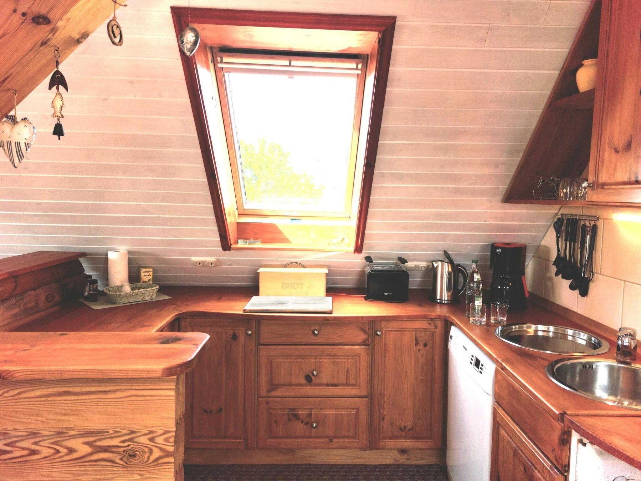 Gemütlich ausgebaute Dachgeschosswohnung in einem Holzblockhaus mit Fußbodenheizung. Sie besteht aus einem Wohnzimmer mit offener Küche, einem Schlafzimmer mit Doppelbett (1,80 x 2,00 m, durchgehend) und Bad mit Duschwanne und WC. Die Küche ist komplett ausgestattet inkl. Geschirrspüler. Der Zugang zur Wohnung erfolgt über eine Außentreppe und der großen Terrasse zur Südseite mit Blick zum Achterwasser, die sich direkt vor dem Wohnzimmer befindet.