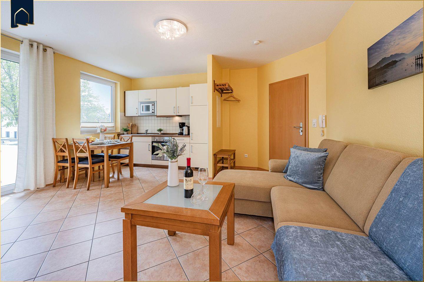 Der offene Wohnbereich bietet Ihnen alles, was Sie für einen angenehmen Aufenthalt benötigen. Die gut ausgestattete Küche ermöglicht es Ihnen, mühelos leckere Mahlzeiten zuzubereiten, die Sie am angrenzenden Esstisch gemeinsam genießen können. Das Wohnzimmer lädt mit einem großen Sofa zum Entspannen ein, das sich abends in eine Schlafmöglichkeit verwandeln lässt. Vom Wohnzimmer aus gelangen Sie direkt auf den Balkon, der mit Tisch und Stühlen ausgestattet ist – perfekt, um die frische Meeresluft zu genießen oder den Tag bei einem Frühstück im Freien zu beginnen. Das separate Schlafzimmer ist mit einem bequemen Doppelbett ausgestattet, in dem Sie erholsamen Schlaf finden. Für Ihre Urlaubsgarderobe gibt es genügend Stauraum, sodass alles seinen Platz findet.