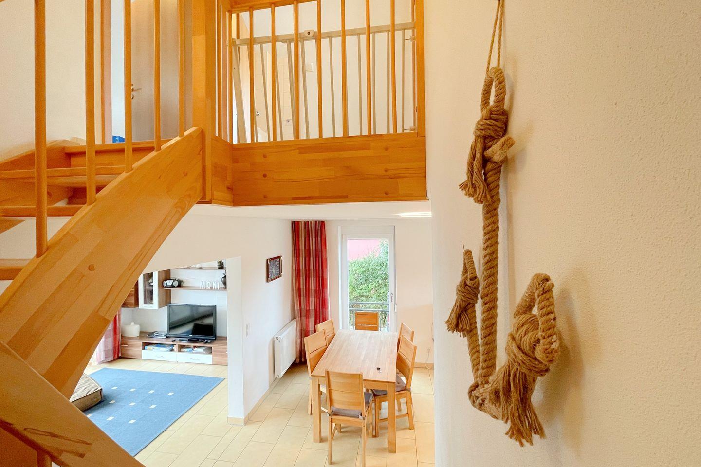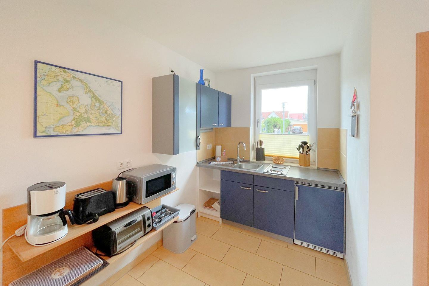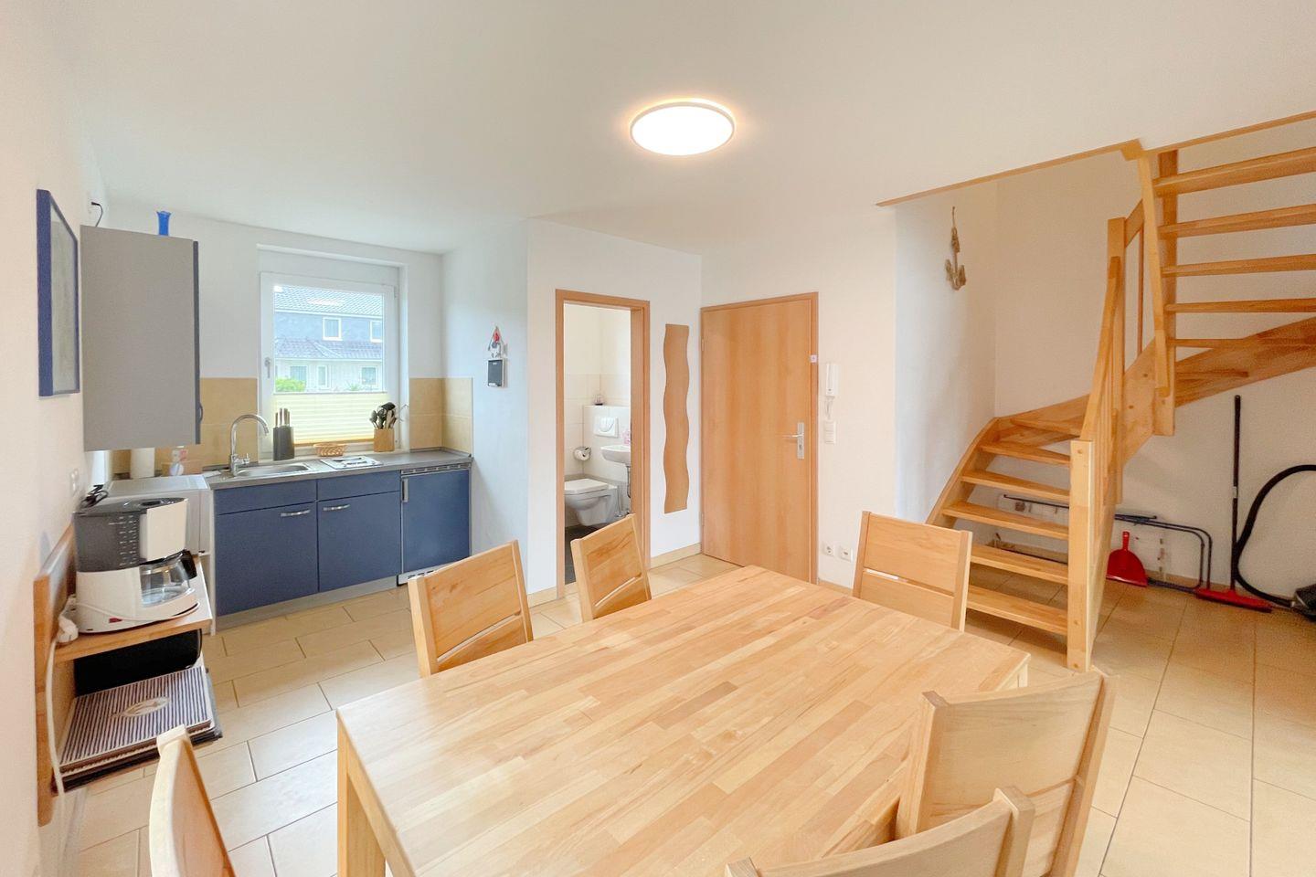 Die Ferienwohnung verfügt über zwei komfortable Schlafzimmer, die mit gemütlichen Betten ausgestattet sind, sodass Sie entspannte Nächte genießen können. Das offene Wohnzimmer geht nahtlos in die voll ausgestattete Küche über, die mit modernen Geräten wie einem Herd, Kühlschrank, Mikrowelle und einer Kaffeemaschine bestückt ist. Ideal für gesellige Kochabende, schwingt hier die perfekte Atmosphäre von Gemütlichkeit und Geborgenheit mit. Esstisch und Sofaecke laden zum Verweilen ein und lassen Raum für schöne gemeinsame Momente.
