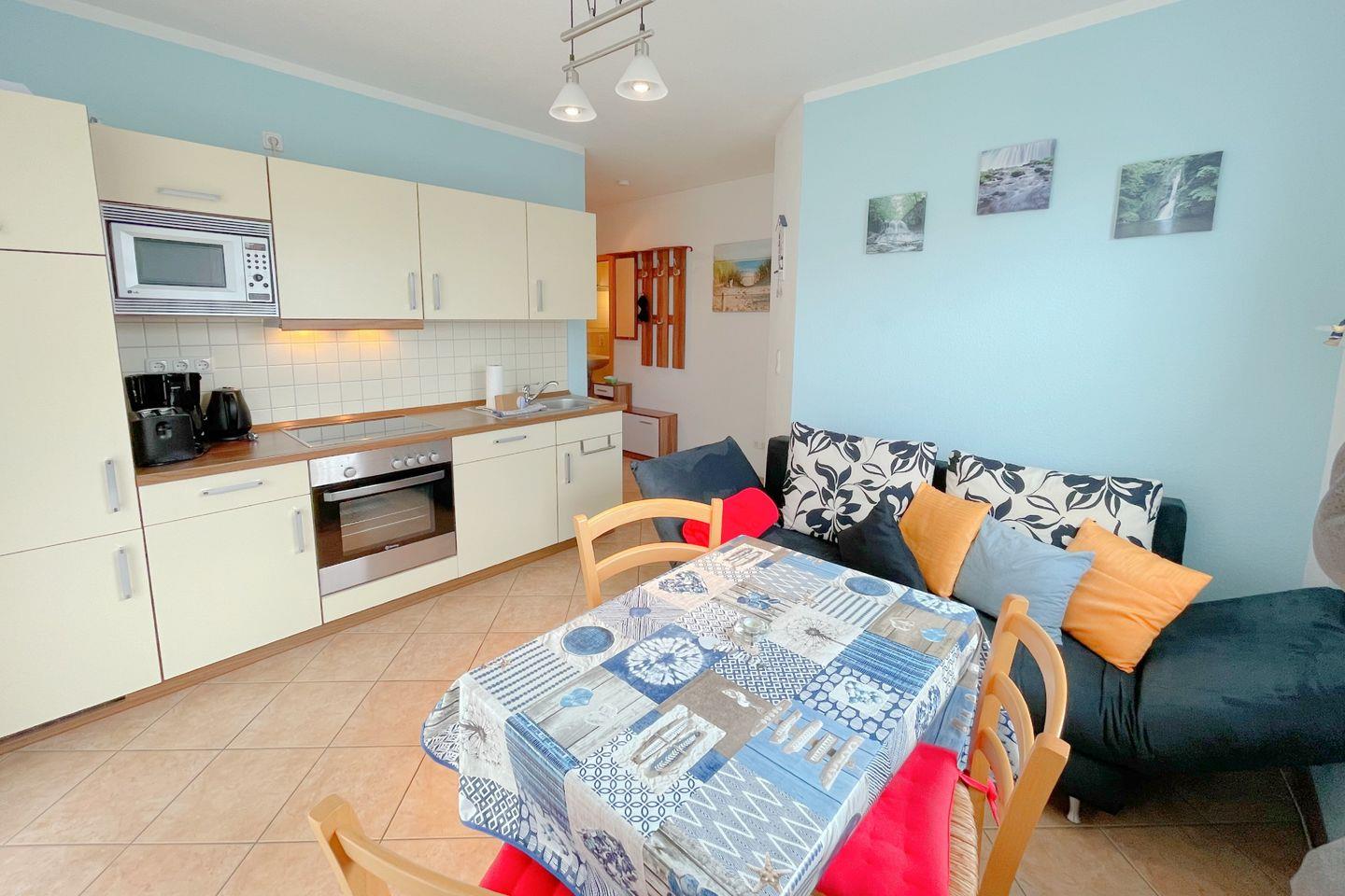 Das Wohnzimmer ist der perfekte Ort zum Entspannen. Die Sofaecke mit einem bequemen Sofa lädt zum Verweilen ein, während der digitale TV-Anschluss für unterhaltsame Abende sorgt. Bei Bedarf ist auch eine Fußbodenheizung vorhanden, die für ein angenehmes Raumklima sorgt, egal zu welcher Jahreszeit Sie Ihren Aufenthalt planen. Die gesamte Wohnung ist rauchfreier Bereich und bietet Ihnen die Möglichkeit, ohne störende Gerüche zu entspannen.
