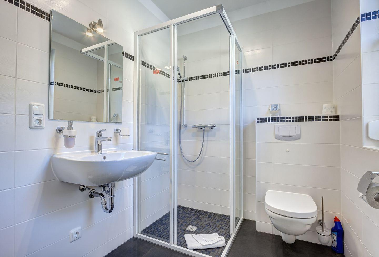 - Das Ferienhaus verfügt über zwei Badezimmer, jeweils mit Dusche – eines im Obergeschoss und eines im Erdgeschoss.