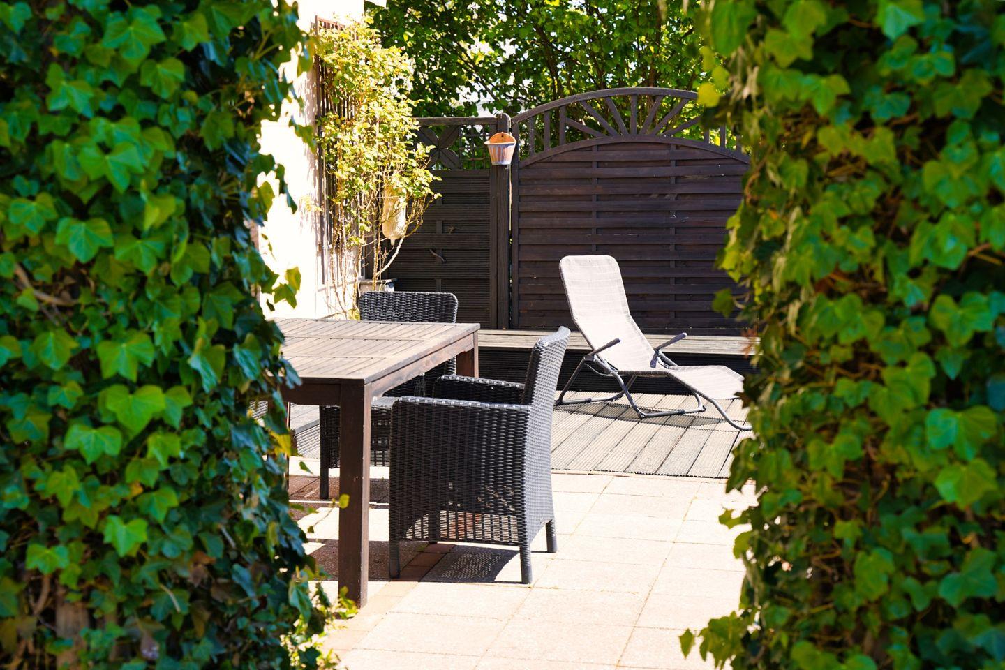 Eine Besonderheit der Ferienwohnung ist die große Terrasse, von der Sie einen wunderschönen Blick auf die Natur genießen können. Sie ist mit Gartenmöbeln und Sonnenschirmen ausgestattet und bietet einen idealen Platz, um die Seele baumeln zu lassen oder gemeinsam bei einem Grillabend neue Erinnerungen zu schaffen. Für kleine Gäste gibt es zudem einen sicheren Spielbereich im Freien.