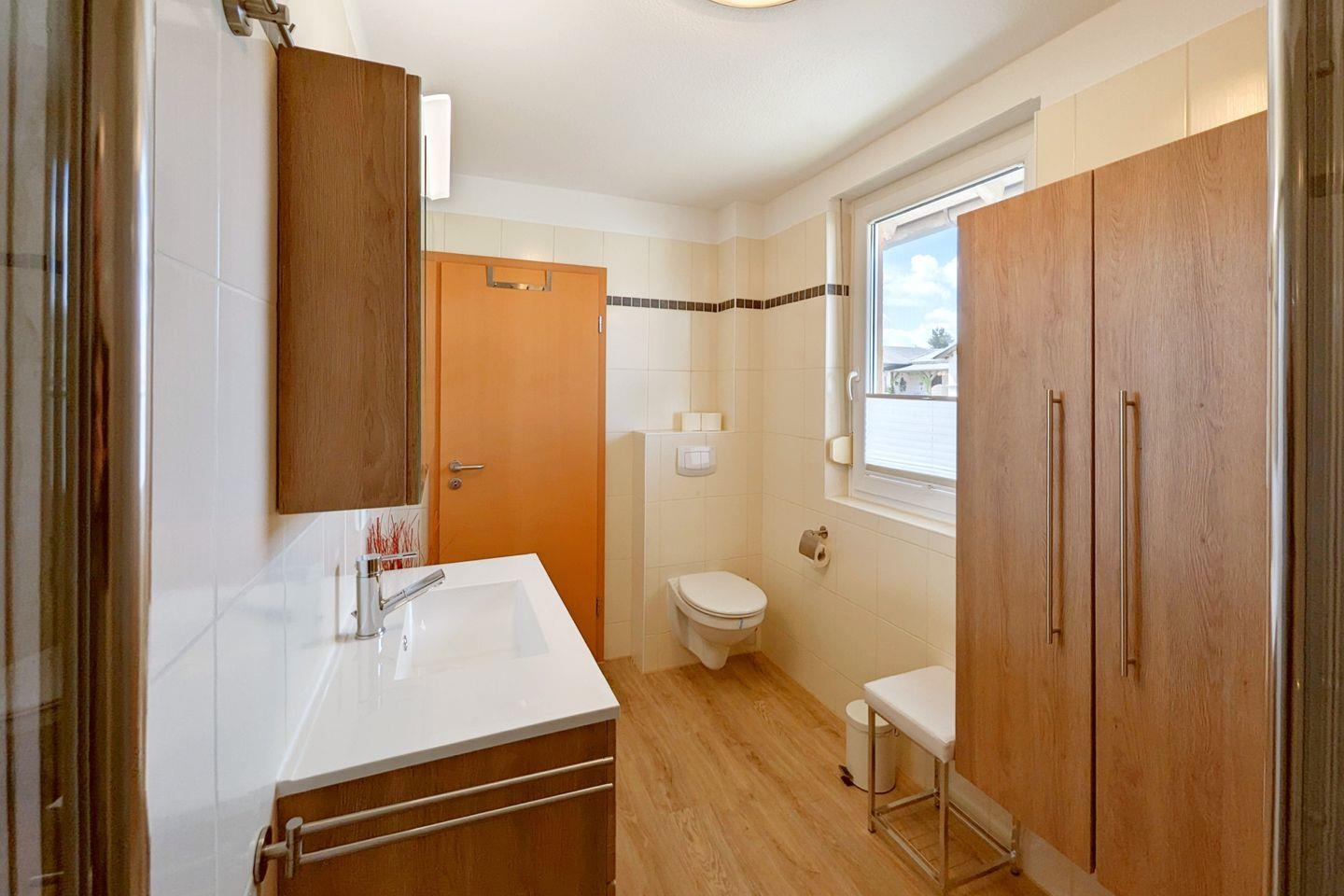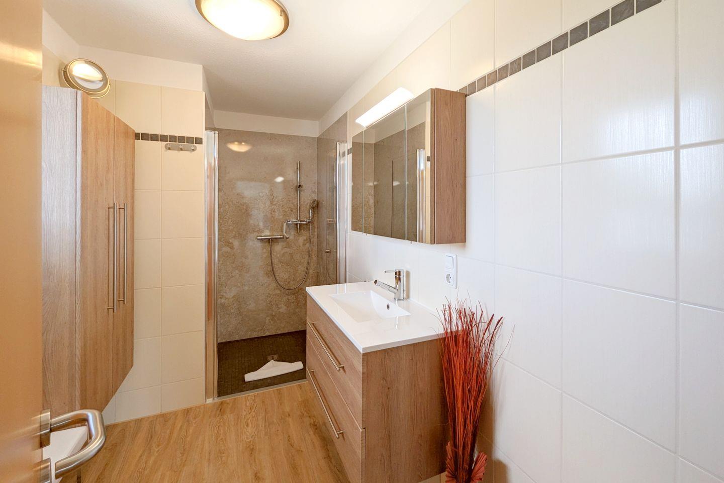 Das Badezimmer ist modern gestaltet und verfügt über eine bodengleiche Dusche, die einen einfachen Zugang bietet. Hier heißt es entspannen und nach einem erlebnisreichen Tag am Strand oder im Wald neue Energie tanken.