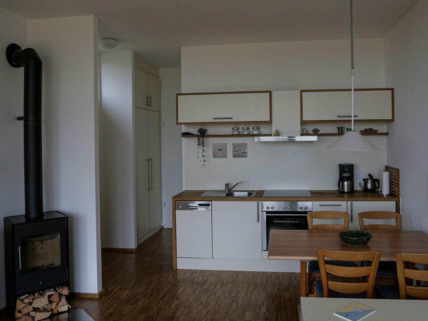 Die Wohnung ist auch durchdacht und funktional ausgestattet. Durch die Fußbodenheizung und den Kamin ist es auch in der kalten Jahreszeit mollig warm. Eine überdachte Terrasse.