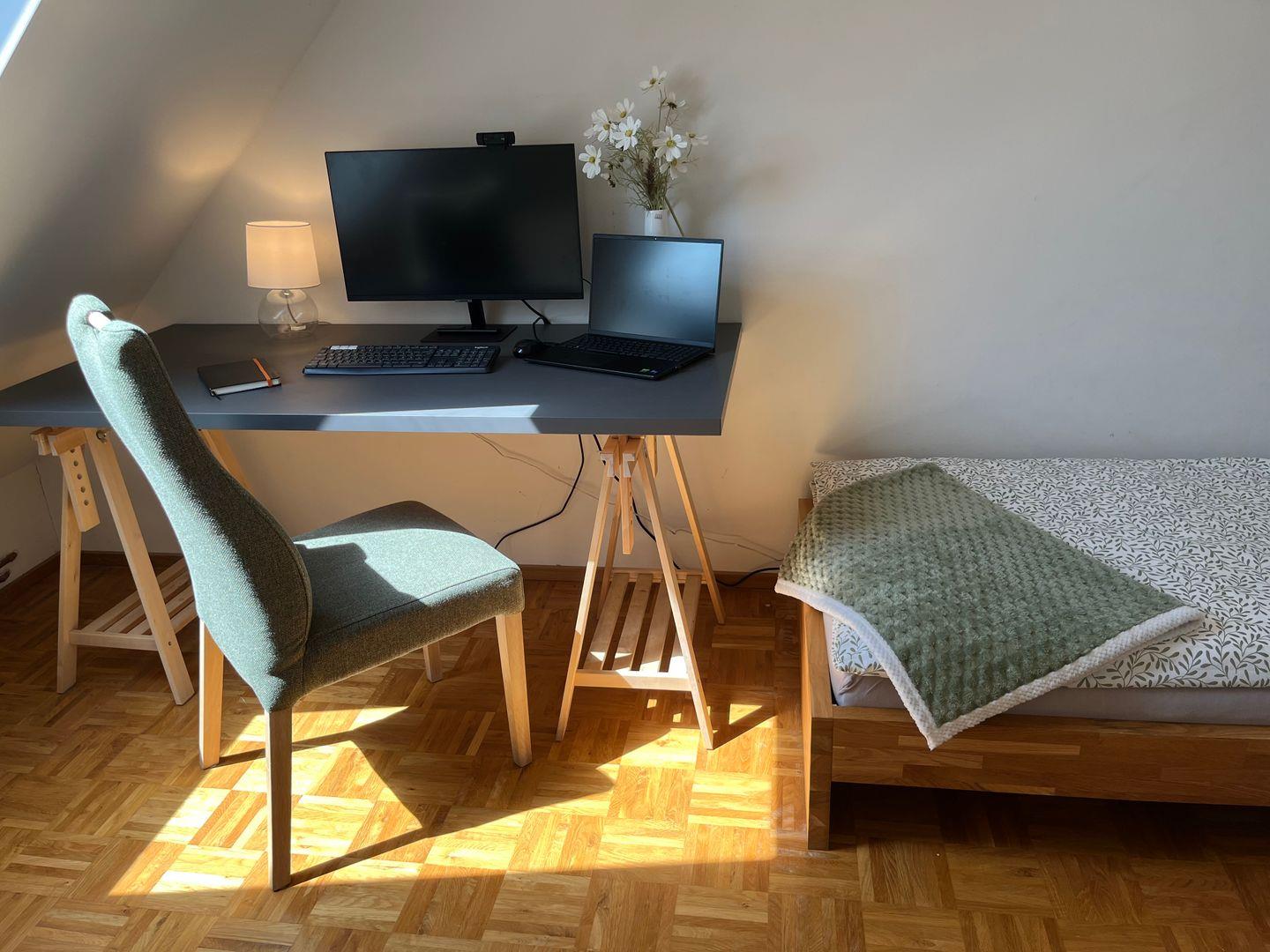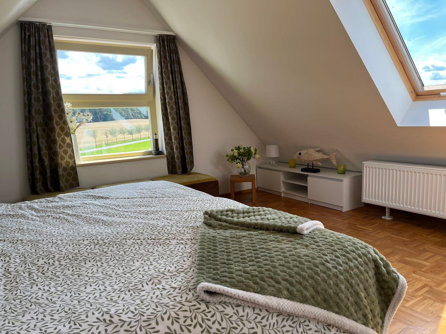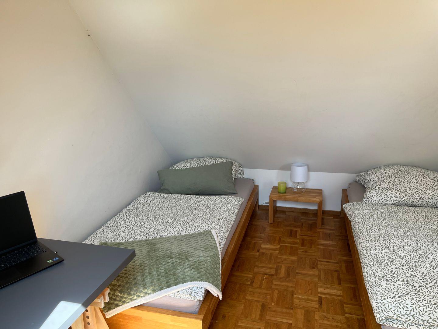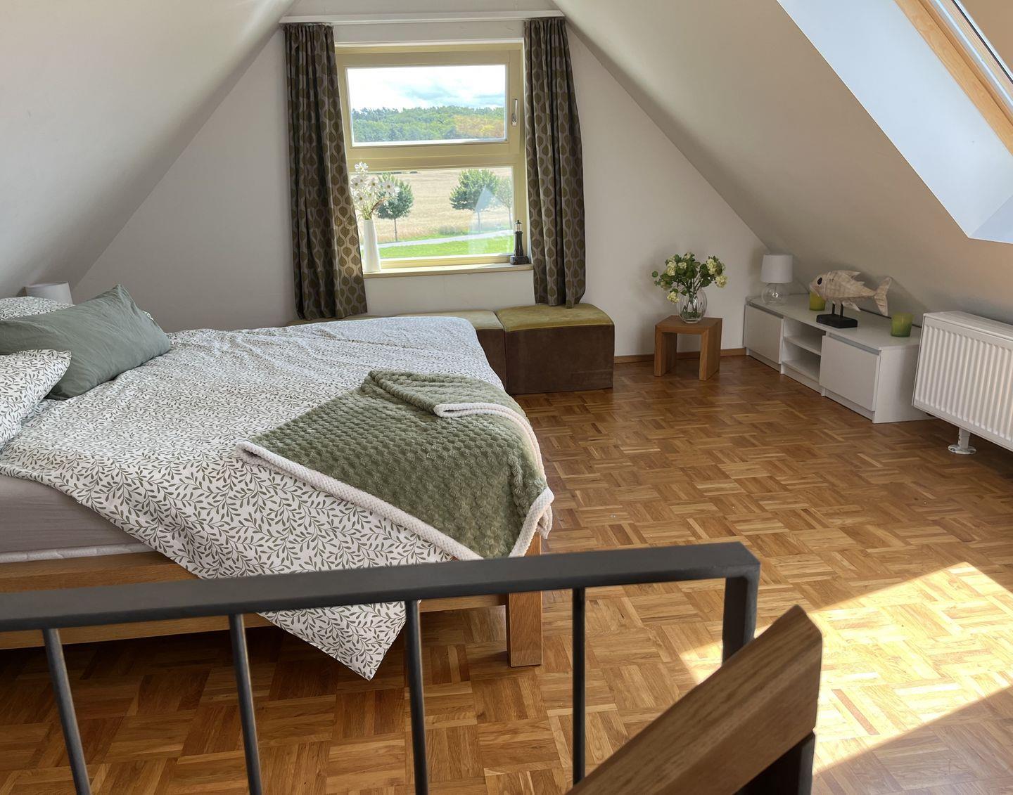 Im Dachgeschoss erwarten Sie zwei weitere Schlafzimmer. Eines ist mit einem Doppelbett ausgestattet, das andere bietet zwei Einzelbetten, einen Arbeitsplatz und ein TV-Gerät – ideal für Familien oder Gäste, die auch während des Urlaubs eine kleine Arbeitsecke benötigen.