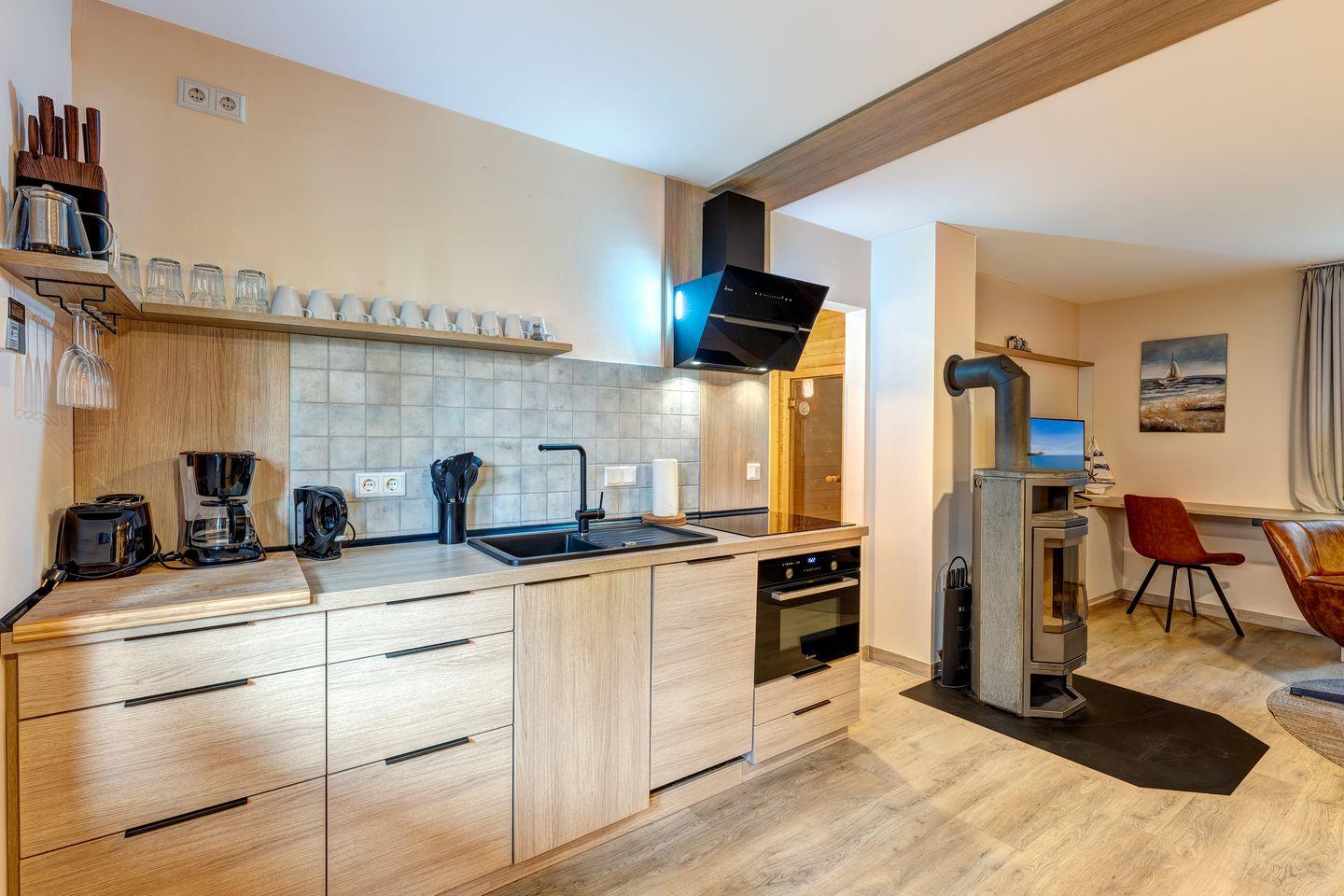 • großen Wohnbereich mit Kaminofen mit integrierter Küche