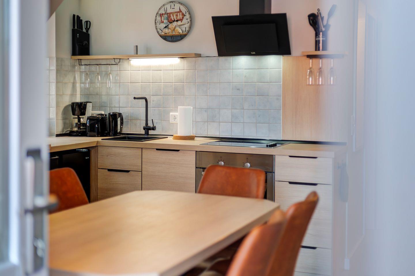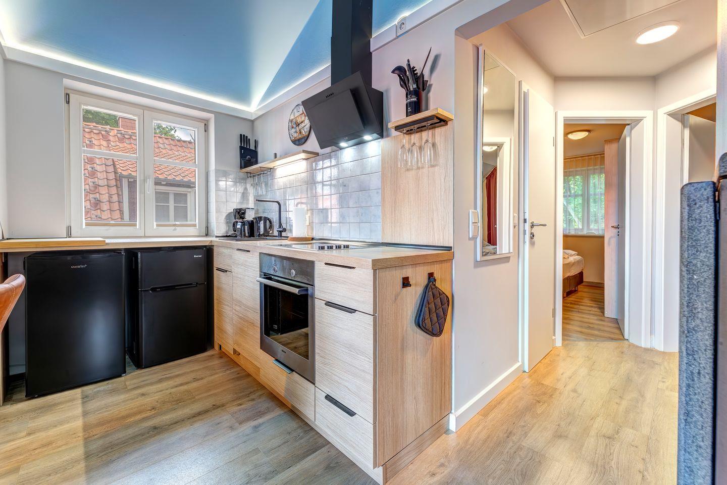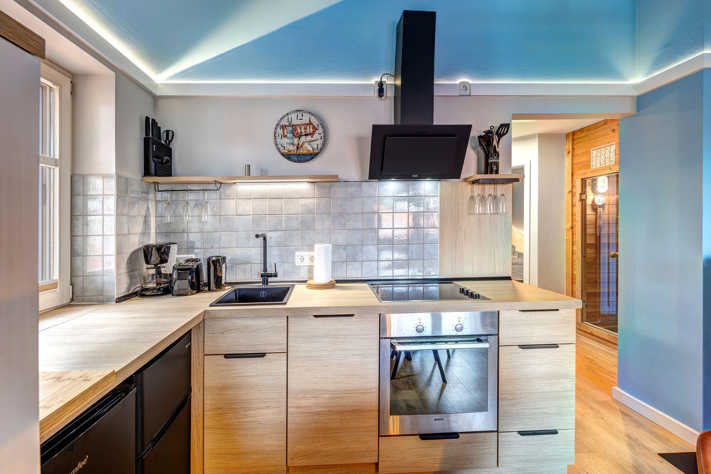 • Backofen, Wasserkocher, Cerankochfeld, Kaffeemaschine und Toaster