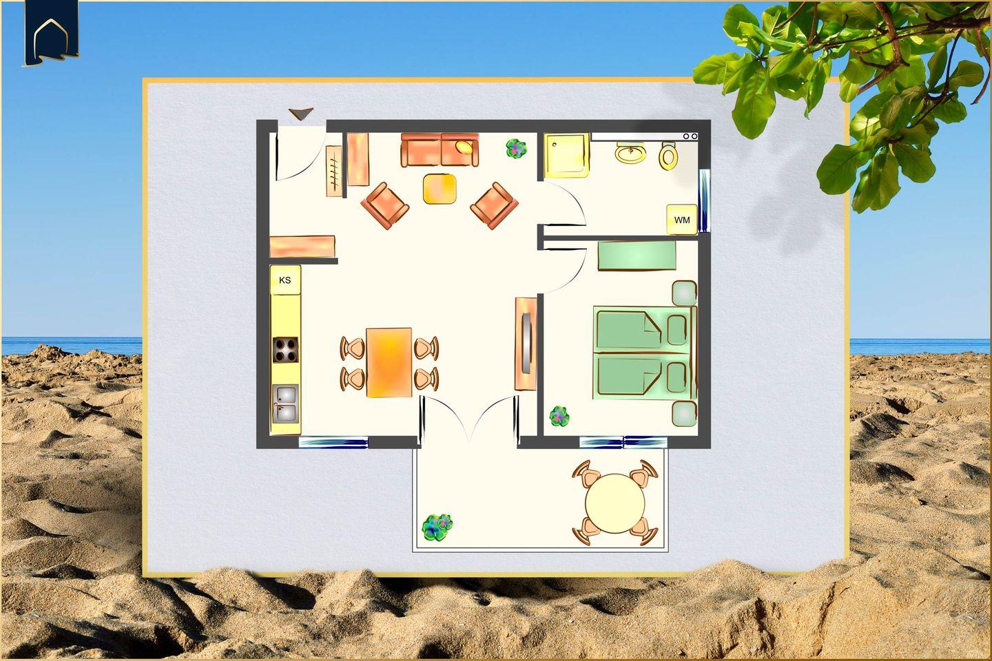 Die Ferienwohnung liegt nur etwa 800 Meter vom feinsandigen Strand entfernt. Ein kurzer Spaziergang bringt Sie ans Meer, wo Sonnenbaden, Schwimmen oder ausgedehnte Strandspaziergänge auf Sie warten. Auch Restaurants, Cafés und Einkaufsmöglichkeiten befinden sich in unmittelbarer Umgebung: ein Supermarkt ist nur 600 Meter entfernt, das nächste Restaurant erreichen Sie nach 300 Metern. Für gemütliche Stunden lädt der eigene Balkon mit Gartenmöbeln ein – hier können Sie den Tag mit einem Kaffee beginnen oder abends entspannt ausklingen lassen.