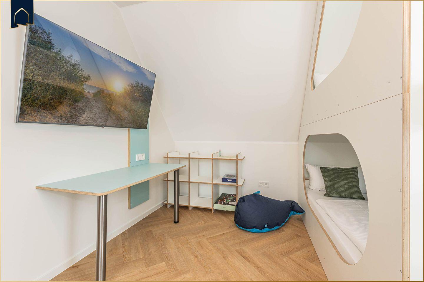 Ein besonderes Highlight Ihres Urlaubsdomizils ist die private Sauna im Haus – ideal, um nach einem langen Strandspaziergang, einer Fahrradtour oder einem aktiven Tag voller Erlebnisse in wohliger Wärme zu entspannen. Der offene Wohnbereich mit bequemer Sofaecke, Smart-TV lädt zum Verweilen ein. Insgesamt vier Fernseher im Haus sorgen dafür, dass jedes Familienmitglied auf seine Kosten kommt – sei es beim Filmabend oder beim Rückzug in die eigenen vier Wände.