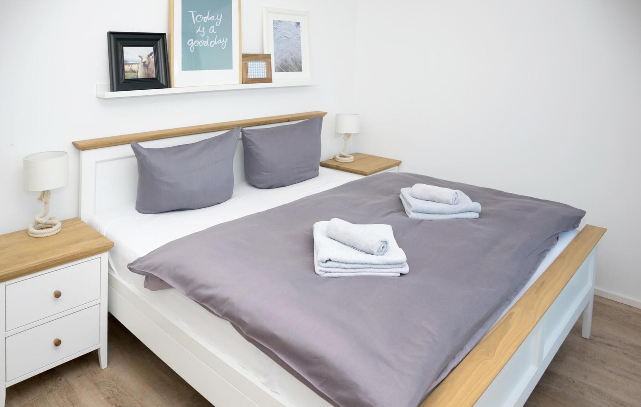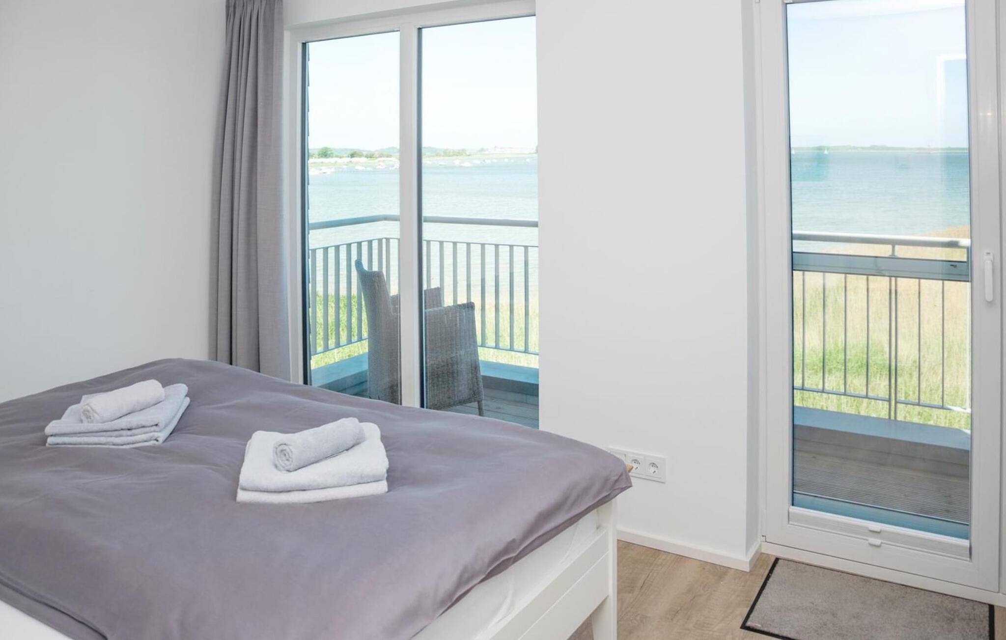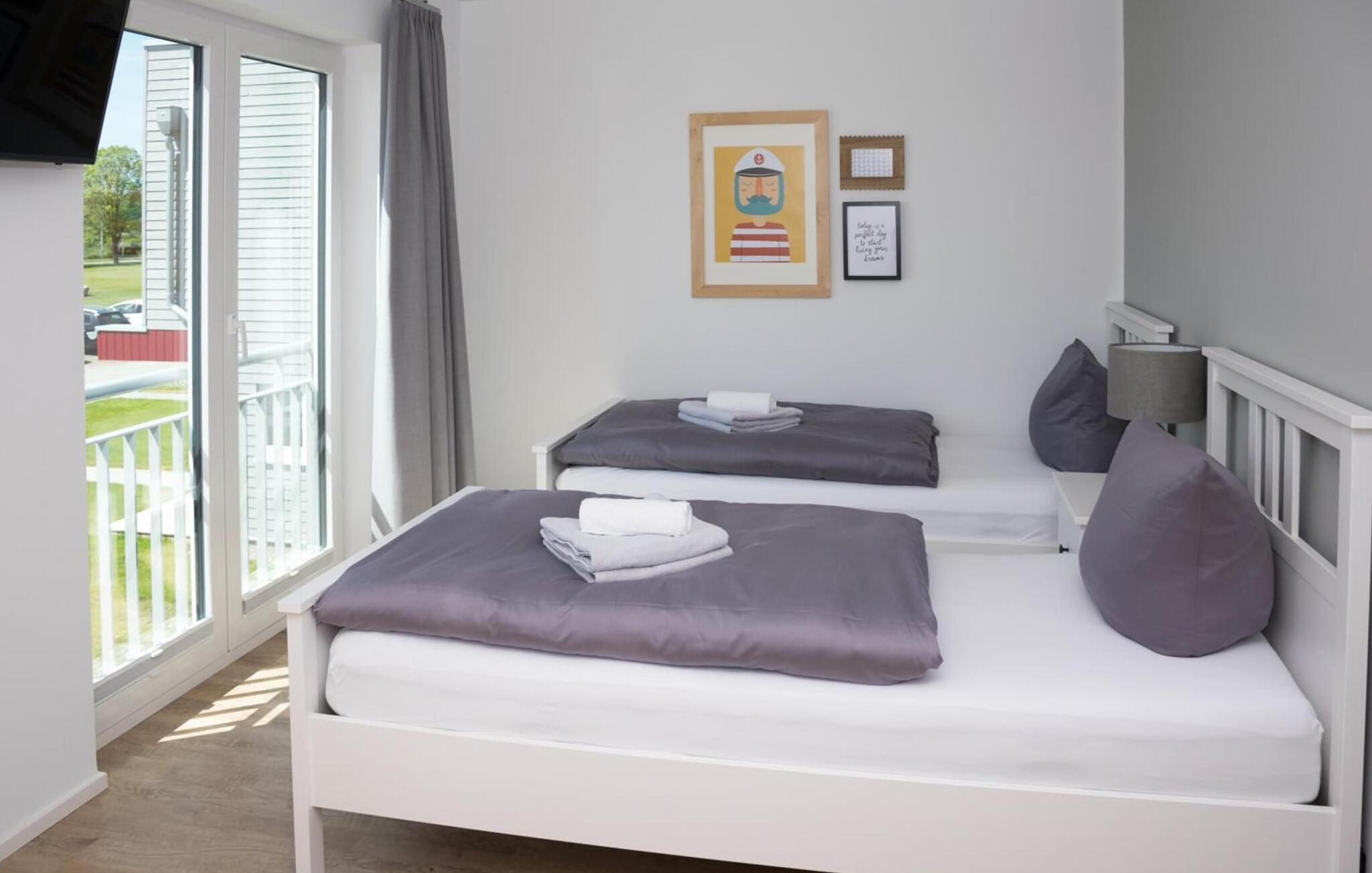 Im Obergeschoss lässt das Hauptschlafzimmer Träume wahr werden, denn Aufwachen und Einschlafen darf der Gast hier bei atemberaubendem Schleiblick. Morgens bietet das Schleiufer ein wahres Naturspektakel: Wenn die Enten und die Schwäne aufwachen, lässt sich der Tag auf der an das Schlafzimmer angrenzenden Terrasse beginnen. Ein zweites Schlafzimmer bietet mit zwei Einzelbetten Platz für zwei Erwachsene, während ein komfortabler Schlafsessel mit einer Liegefläche von 92 x 196 cm einen weiteren Schlafplatz für ein Kind bietet. Ebenfalls befindet sich in diesem Schlafzimmer ein weiterer Flatscreen-TV mit Home Entertainment Programm.