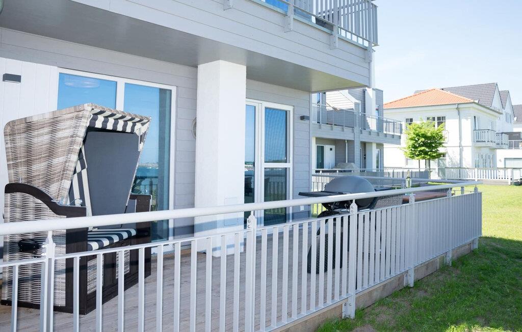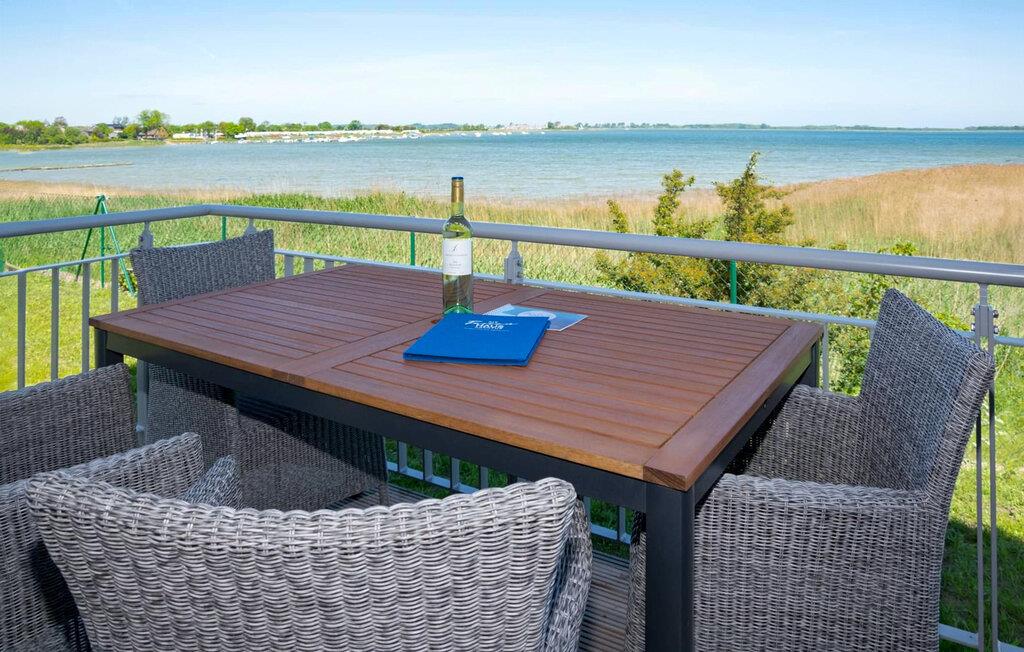 Highlight des Ferienhauses Achtern Schilf ist die große Dachterrasse, die einen Rundum-Wasserblick auf die Schlei und den Hafen des OstseeResorts bietet.