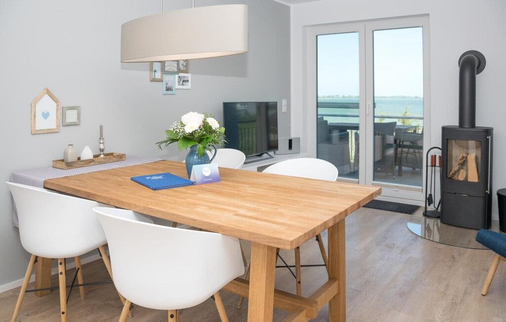 Der offene Wohn- /Essbereich im Erdgeschoss besticht mit bodentiefen Fenstern, durch die der Blick auf das im Wind wiegende Schilf des Schleiufers und die Weite der Schlei fällt, welche direkt vor dem Fenster für ein atemberaubendes Panorama sorgt. Sitzlandschaft, Kaminofen und ein großer Esstisch sorgen für Gemütlich- und Geselligkeit. Direkt angrenzend an das Wohnzimmer befindet sich die Terrasse mit Panoramablick auf die Schlei. Ob bei einem geselligen Grillabend mit Weber Grill oder mit Wein und Buch, die unmittelbare Wassernähe macht den Urlaub unvergesslich. Für Entertainment sorgen ein Bose Sound Touch Musik System und eine Play Station 5.