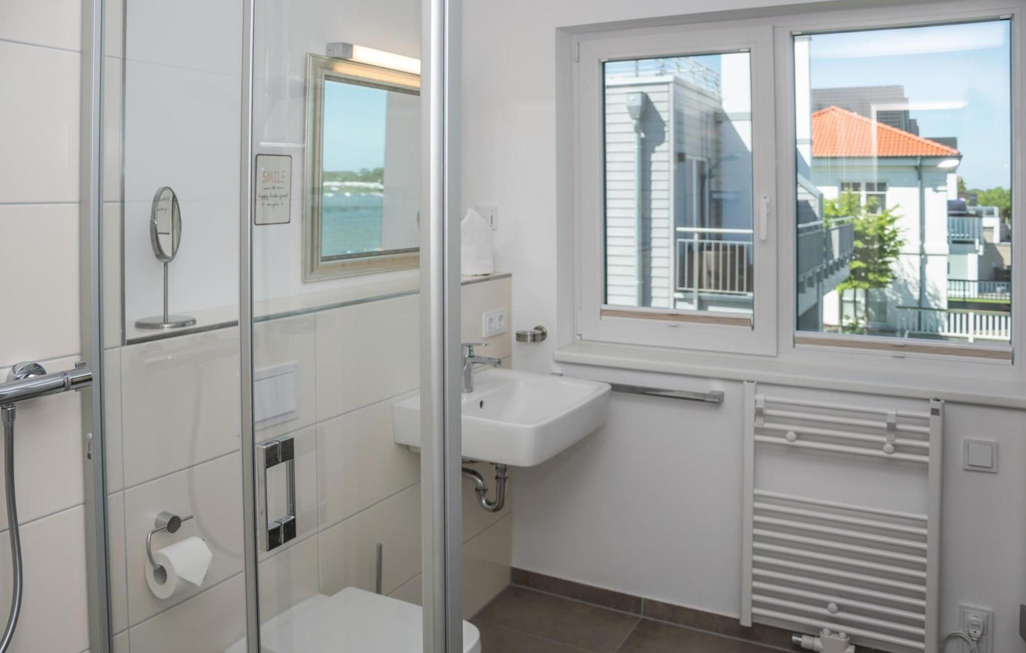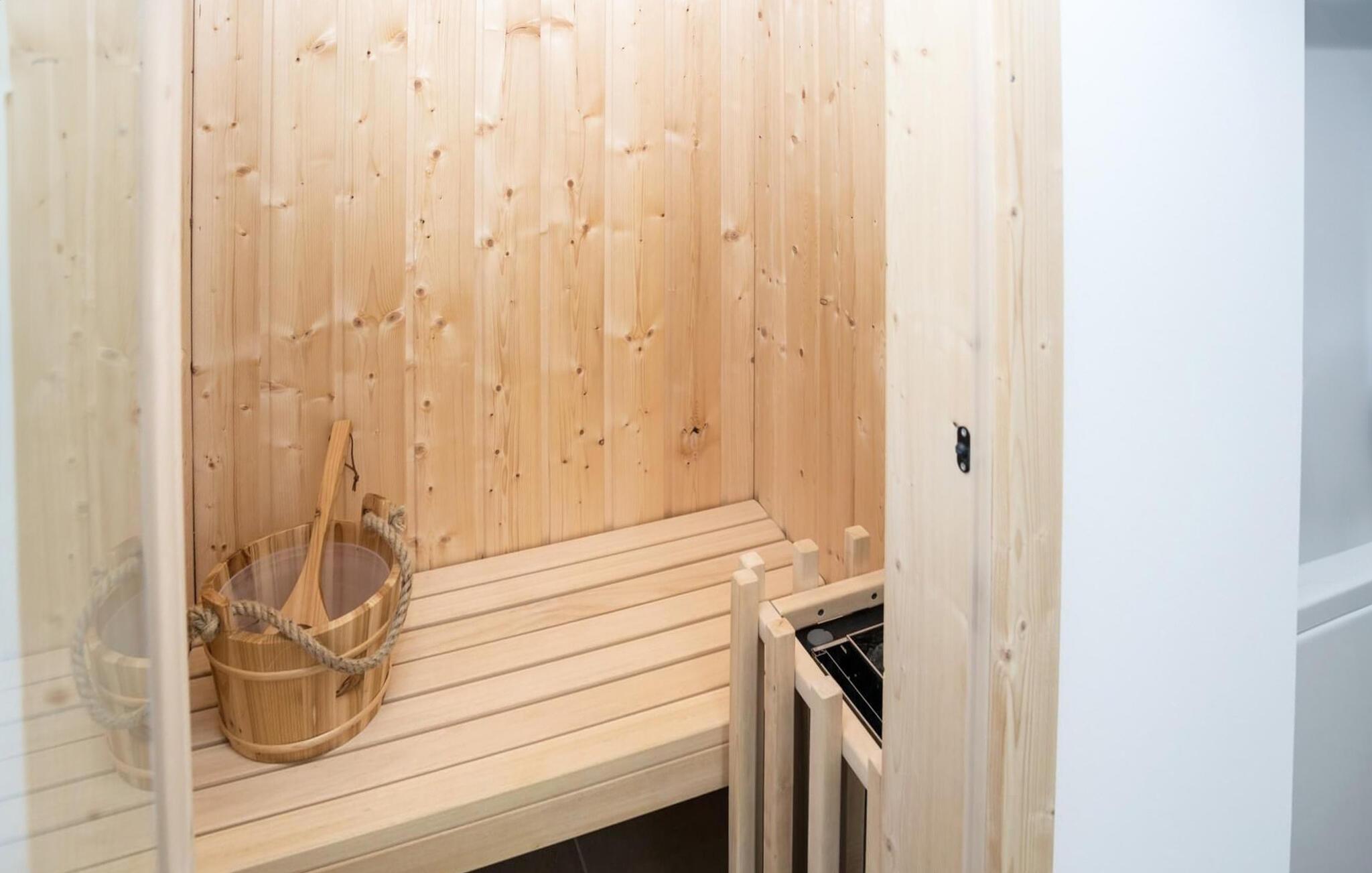 Ebenfalls im ersten Obergeschoss befindet sich das Hauptbadezimmer mit persönlichem Wohlfühlprogramm: Whirlwanne, Sauna mit Wasserblick und Dusche machen dieses Bad zum privaten Wohlfühlbereich.