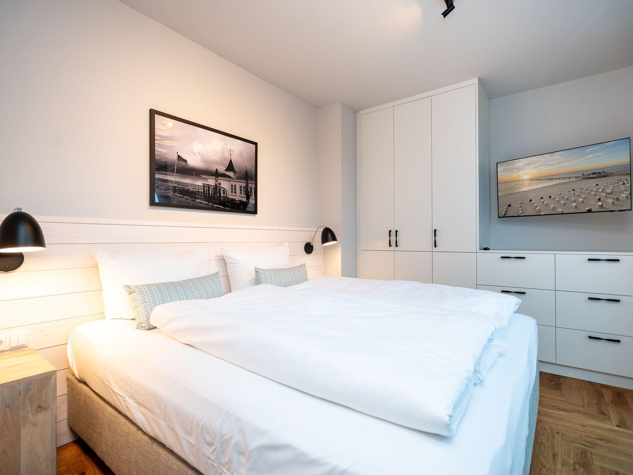 Willkommen im Penthouse-Appartement. 4.1! Dieses exklusive Appartement befindet sich im Penthouse des Hauses A auf der 4. Etage und begeistert mit einer stilvollen Einrichtung sowie einem atemberaubenden Meerblick über die Dächer von Ahlbeck. Auf 49 m² finden 2 Personen alles, was das Herz begehrt, um den Urlaub entspannt zu genießen. Der offene Wohnbereich mit edlem Echtholzparkett lädt zum Verweilen ein: Machen Sie es sich in den drehbaren Relaxsesseln bequem, die Füße entspannt auf dem Hocker, und genießen Sie Ihre Lieblingssendung auf dem 50-Zoll-Flat-TV oder lassen Sie einfach die Seele baumeln beim traumhaften Blick über die Ostsee. Die moderne Küchenzeile ist perfekt ausgestattet ? mit einem 3-Platten-Induktionsherd, Backofen mit Mikrowellenfunktion, Spülmaschine und allem, was Sie für Ihre kulinarischen Abenteuer benötigen. Der angrenzende Essbereich mit Sitzbank, Esstisch und zwei Stühlen bietet den idealen Ort für gemütliche Mahlzeiten. Das separate Schlafzimmer verspricht erholsame Nächte im komfortablen Boxspringdoppelbett (1,80 m x 2,00 m). Ein geräumiger Kleiderschrank und ein weiterer 43-Zoll-Flat-TV sorgen für zusätzlichen Komfort. Vom Wohnbereich haben Sie Zugang zur großzügigen Nord-West-Dachterrasse, wo Sie herrliche Sonnenuntergänge erleben können. Das moderne Tageslichtbad mit Dusche, Toilette und Waschtisch rundet das Angebot perfekt ab. Natürlich steht Ihnen kostenfreies WLAN zur Verfügung, und Ihr Auto parkt sicher auf dem Tiefgaragenstellplatz. Erleben Sie unvergessliche Tage an der Ostsee in dieser traumhaften Ferienwohnung ? wir freuen uns auf Sie!