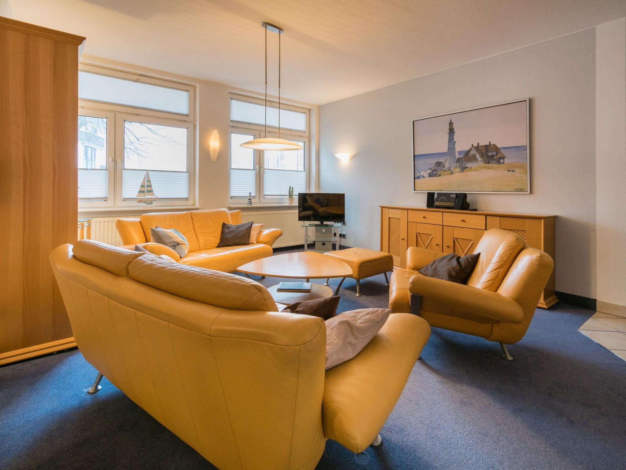 Die großzügig geschnittene Wohnung mit 95 qm befindet sich im ersten Obergeschoss und bietet Platz für bis zu 6 Personen. Sie verfügt über einen großen Wohnraum mit gemütlicher Couchlandschaft sowie Kamin und Essbereich. Eine voll ausgestattete Küche mit Backofen mit Mikrowellenfunktion, Spülmaschine, Kühlschrank (mit Gefrierabteil) sowie Kaffeemaschine, Wasserkocher und Toaster ist vorhanden.