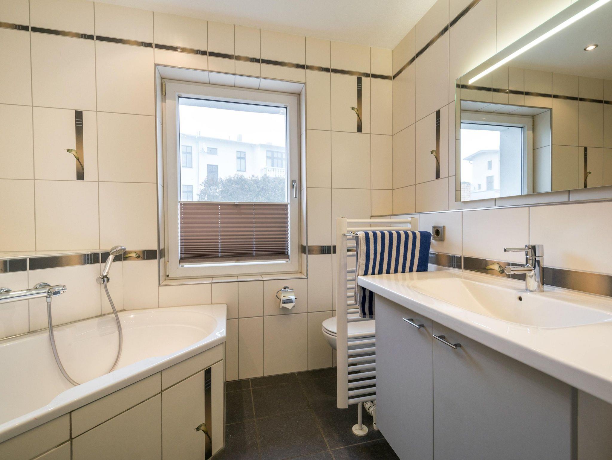 Tageslichtbad mit ebenerdiger Dusche und Badewanne. Sie haben WLAN und einen Parkplatz vor dem Haus.