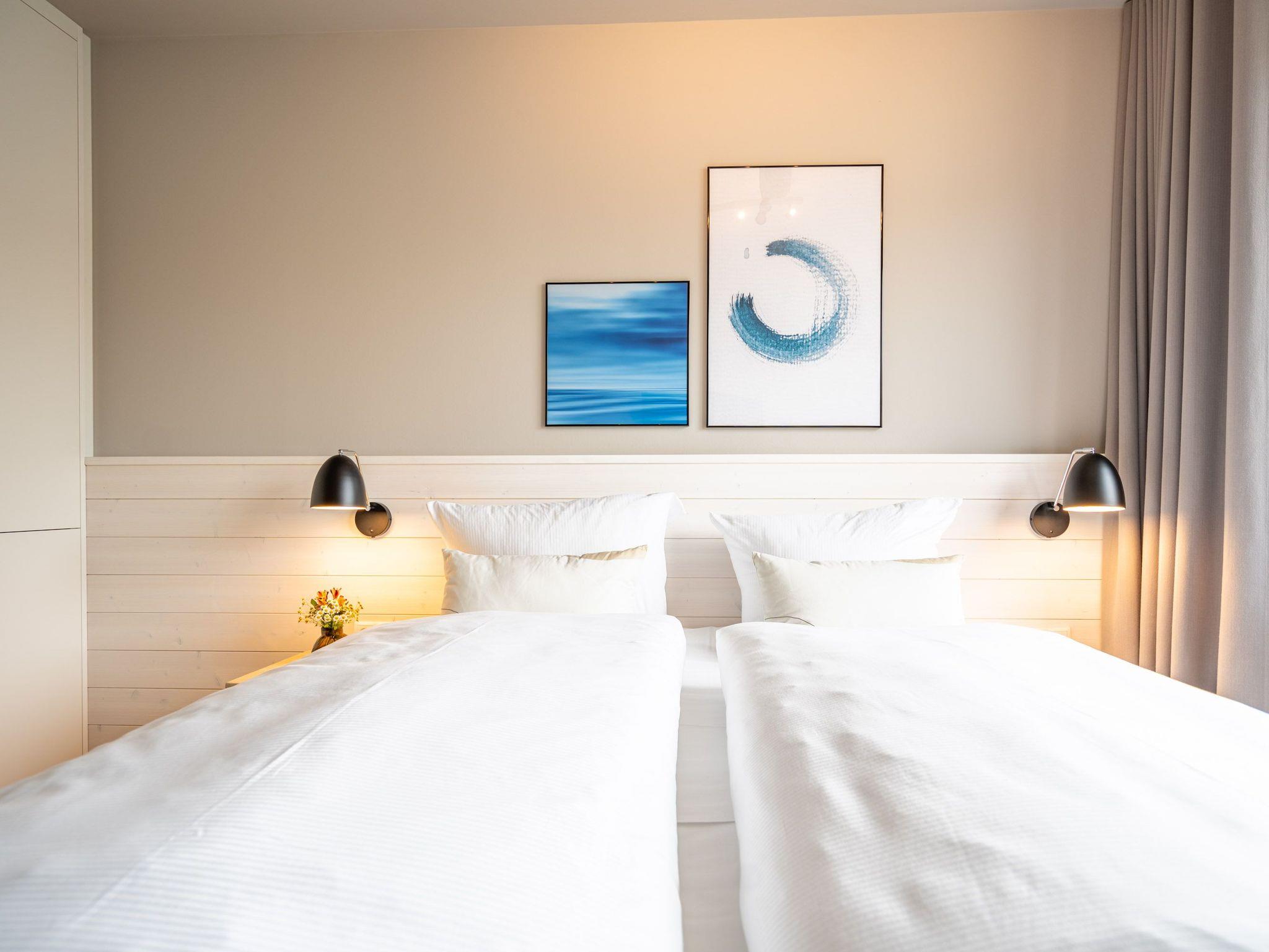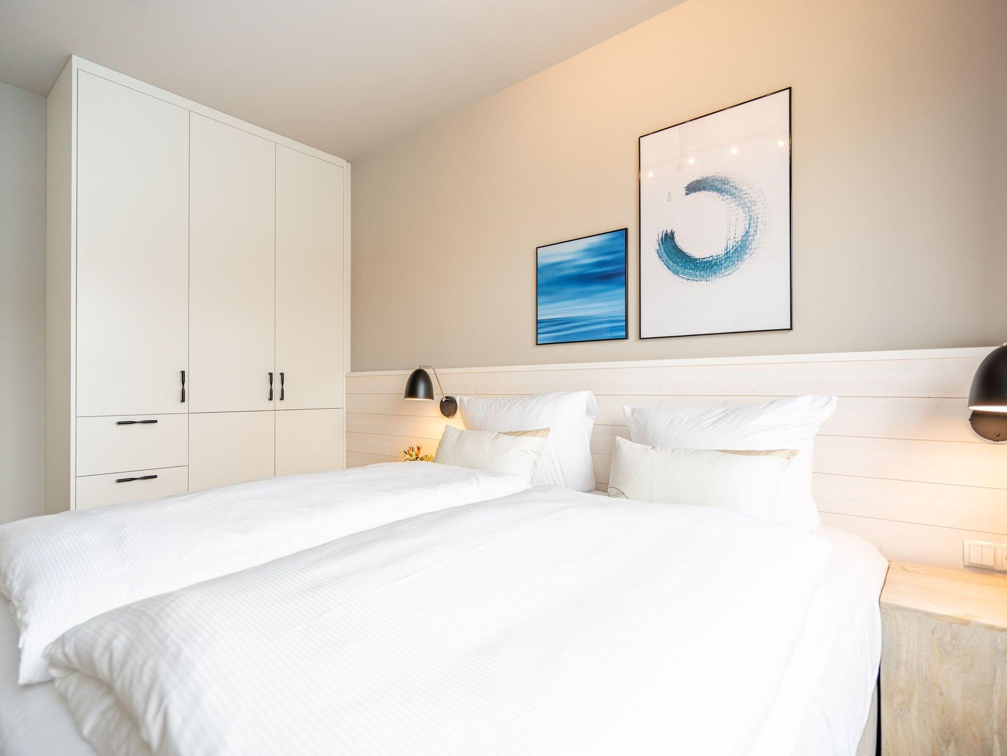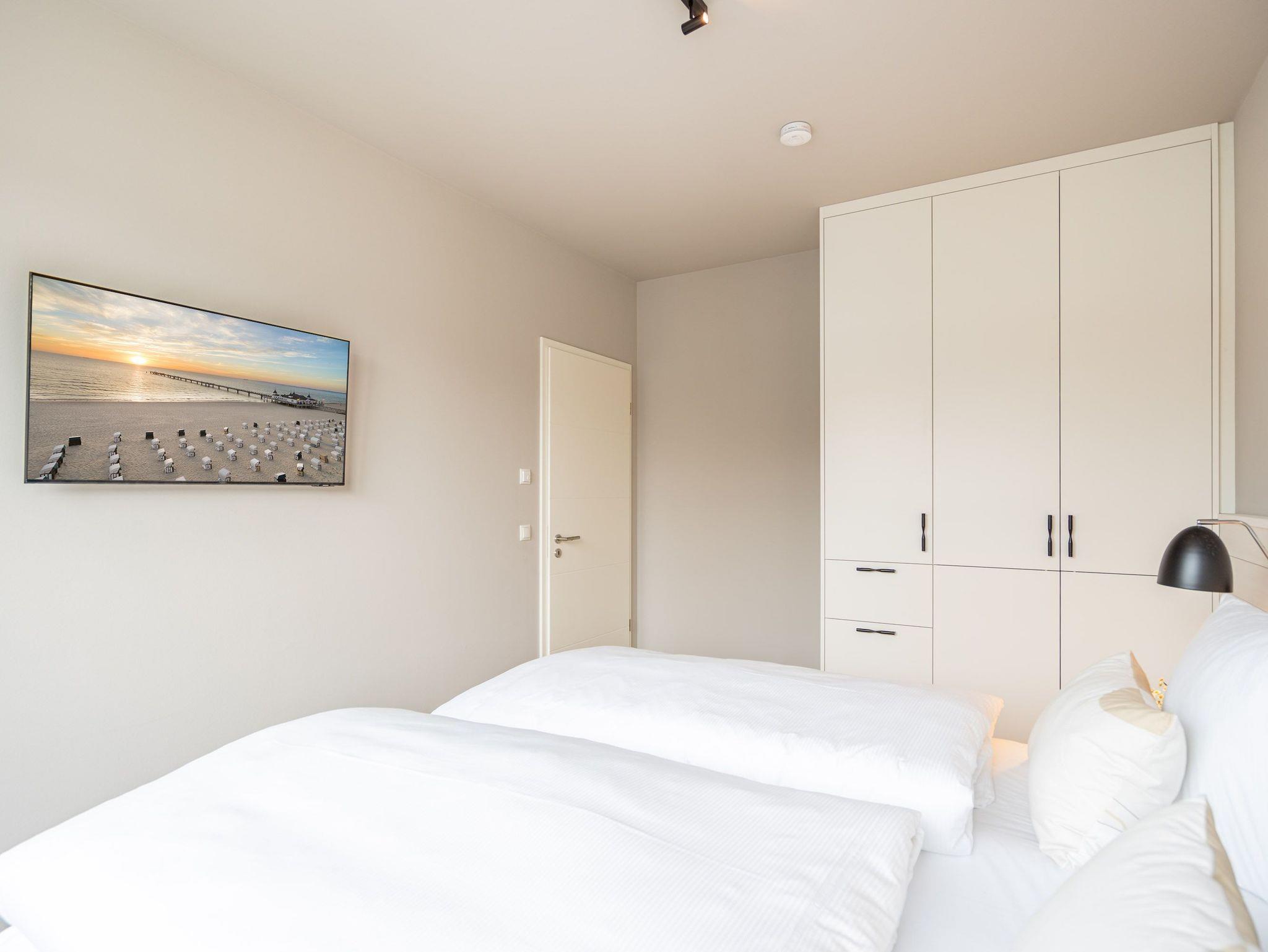 Ein Appartement zum Wohlfühlen, zum Aus-und Entspannen und zum Verlieben ist das 3-Raum-Appartement B 2.4 (Haus B) in der 2. Etage der Strandterrasse. Die 88 Quadratmeter sind mit Geschmack und viel Liebe zum Detaileingerichtet und ein ideales Domizil für bis zu 4 Personen und 1 Kleinkind im Kinderreisebett, die gemeinsam eine Auszeit direkt am Meer genießen wollen. Die Ostsee ist nur 80 Meter entfernt und vom Balkon der Wohnung aus sogar zu sehen. Der Blick reicht seitlich bis über die wunderschöne alte Ahlbecker Seebrücke hinaus. Blaue Weite bis zum Horizont. Ein großzügiger Wohn-Essraum bietet viel Platz zum Entspannen. Geben Sie sich auf der stylischen Couch mit Sessel vor dem großen Flat-TV (50 Zoll) dem süßen Nichtstun hin. Ein gemütlicher Essplatz versammelt alle zu den selbst gekochten Leckereien. Die können Sie in der offenen Küchenzeile ganz leicht zubereiten. Sie ist mit allen Annehmlichkeiten und hochwertigen Elektrogeräten wie einem Backofen, einem 4-Platten-Induktionsherd und einer Nespresso-Kapselmaschine ausgestattet. Die Wohnung hat einen Elektrokamin (ohne Wärmeabgabe), der für eine behagliche Atmosphäre sorgt. Sie können sowohl vom Wohnzimmer als auch von einem der beiden Schlafzimmer aus auf den Balkon mit Ostausrichtung hinaustreten. Ein Esstisch und eine Sonnenliege verschönern die Momente unter freiem Himmel. Das Rauschen der Wellen wirkt sich beruhigend und entschleunigend auf Geist und Körper aus. Ganz besonders, wenn man vom sanften Rauschen in den beiden komfortablen Schlafzimmern in den Schlaf gebracht wird. Jedes der Zimmer verfügt über ein bequemes Boxspringdoppelbett (1,80m x 2,00m), einen Kleiderschrank und einen Flat-TV (43 Zoll). Zwei moderne Duschbäder bieten mit Dusche, Waschtisch und WC allen Komfort. Für kuschelig warme und entspannende Stunden gibt es in einem der Bäder eine Infrarotsaunakabine. Ein PKW-Stellplatz in der Tiefgarage ermöglicht schon ein relaxtes Ankommen. Erholung also rundherum. Freuen Sie sich auf eine stilvolle Ferienwohnung mit einer hochwertigen Ausstattung ganz nah am Meer.