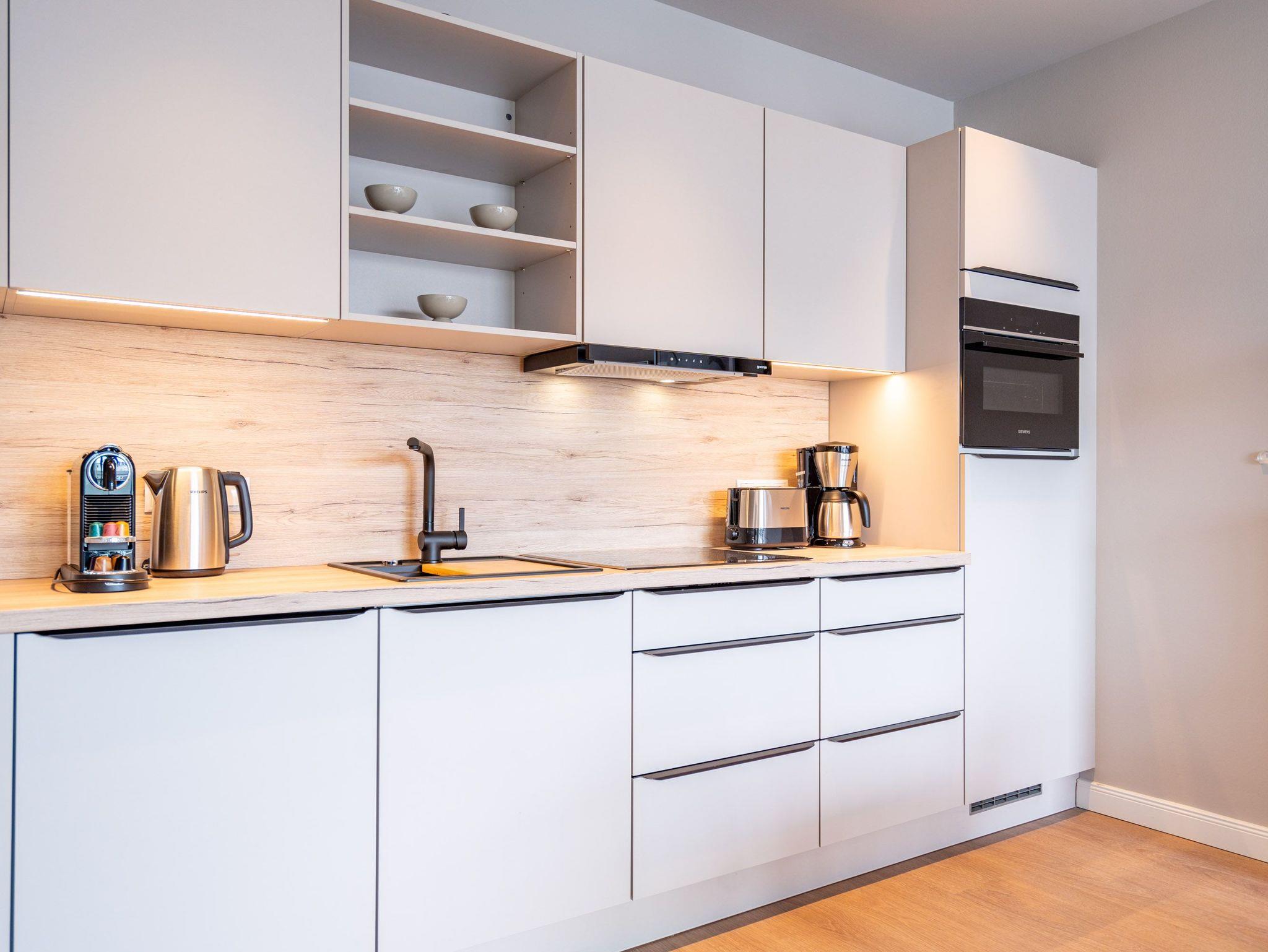 Die 2024 fertig gestellte Strandterrasse liegt direkt an der belebten Strandpromenade und bietet einen einzigartigen Ausblick auf die Grand Dame der historischen Seebrücken sowie die historische Konzertmuschel, einem beliebten Treffpunkt für Kunst und Kultur. Dahinter liegt die Ostsee ? ein Panorama, das zu den schönsten in den Kaiserbädern gehört. Es ist wie das Abtauchen in eine andere Zeit. In eine Zeit, in der man mit Stock, Sonnenschirm und Hut fürs „Sehen und gesehen werden“ über die Promenade schlenderte; aber auch in eine Zeit, in der ? damals wie heute ? Zeit einmal für eine kurze Weile keine Rolle spielt. Weil man angekommen ist im Loslassen, Entspannen und Genießen. Es ist dieser besondere Geruch nach Meeresluft und Freiheit, der in Erinnerung bleibt. Dazu die Bilder, die man mitnimmt. Von langen Strandspaziergängen, vom Lachen in fröhlich schäumenden Ostseewellen, von der Zeit in einem wunderschönen Urlaubsdomizil. Denn genau das ist die Strandterrasse mit ihren 56 modernen und exklusiven Ferienappartements direkt gegenüber der Ahlbecker Seebrücke. Die Ein-, Zwei- oder Dreizimmerwohnungen ? zwischen 40 und 70 Quadratmeter groß ? sind von einer Innenarchitektin gemeinsam mit unserem Erfahrungsschatz an Gästewünschen mit viel Liebe zum Detail und ganz individuell konzipiert worden. Entspannung und Wohlfühlen stehen an erster Stelle. Alles ist aufeinander abgestimmt und sorgt für eine gemütliche Atmosphäre. Wählen Sie zwischen einem Domizil in einem hellen, sandfarbenen Designkonzept oder einem Appartement mit anthrazitfarbenen Farbakzenten. Alle Appartements verfügen gleichermaßen über eine stilvolle und komfortable Einrichtung, die passgenau angefertigt worden ist, sowie über moderne Küchen und Bäder. Jedem Schlafzimmer ist ein eigenes Bad mit Dusche zugeordnet (außer App. B4.5). Die Appartements besitzen fast alle einen Balkon ? viele schauen sogar zur Ostsee hinaus. Die meisten Feriendomizile haben einen Elektrokamin und Infrarotsaunen. Im Erdgeschoss befindet sich ein separater Gemeinschaftsraum für Fahrräder. Außerdem besteht die Möglichkeit, im Gemeinschaftswaschraum 2 Waschmaschinen [&] Trockner zu nutzen. Ergänzt wird das Angebot durch eine Gemeinschaftssauna, die täglich von 11:00 bis 22:00 Uhr nutzbar ist. In der Tiefgarage (Einfahrtshöhe 2,03 Meter) steht für jede Wohnung 1 Pkw-Stellplatz zur Verfügung. Ist alles zur Zufriedenheit untergebracht? Dann kann der Urlaub ja beginnen. Und beim Blick vom Balkon über die Ostsee treffen sich zum Sonnenaufgang das Heute und das Damals. Gelassenheit legt sich beim Gang hinunter an den Strand auf die Seele. Jetzt darf die Zeit stehenbleiben.