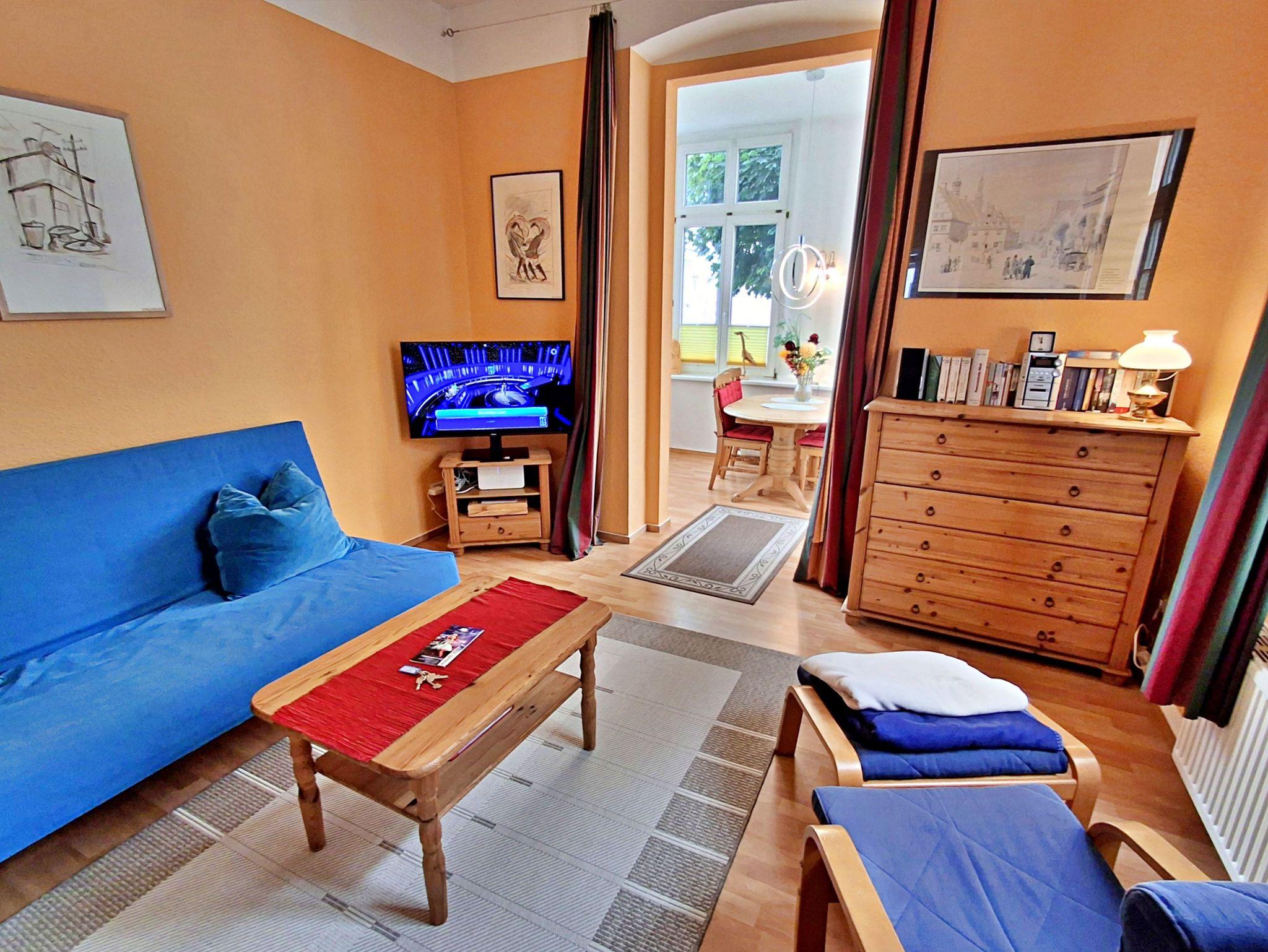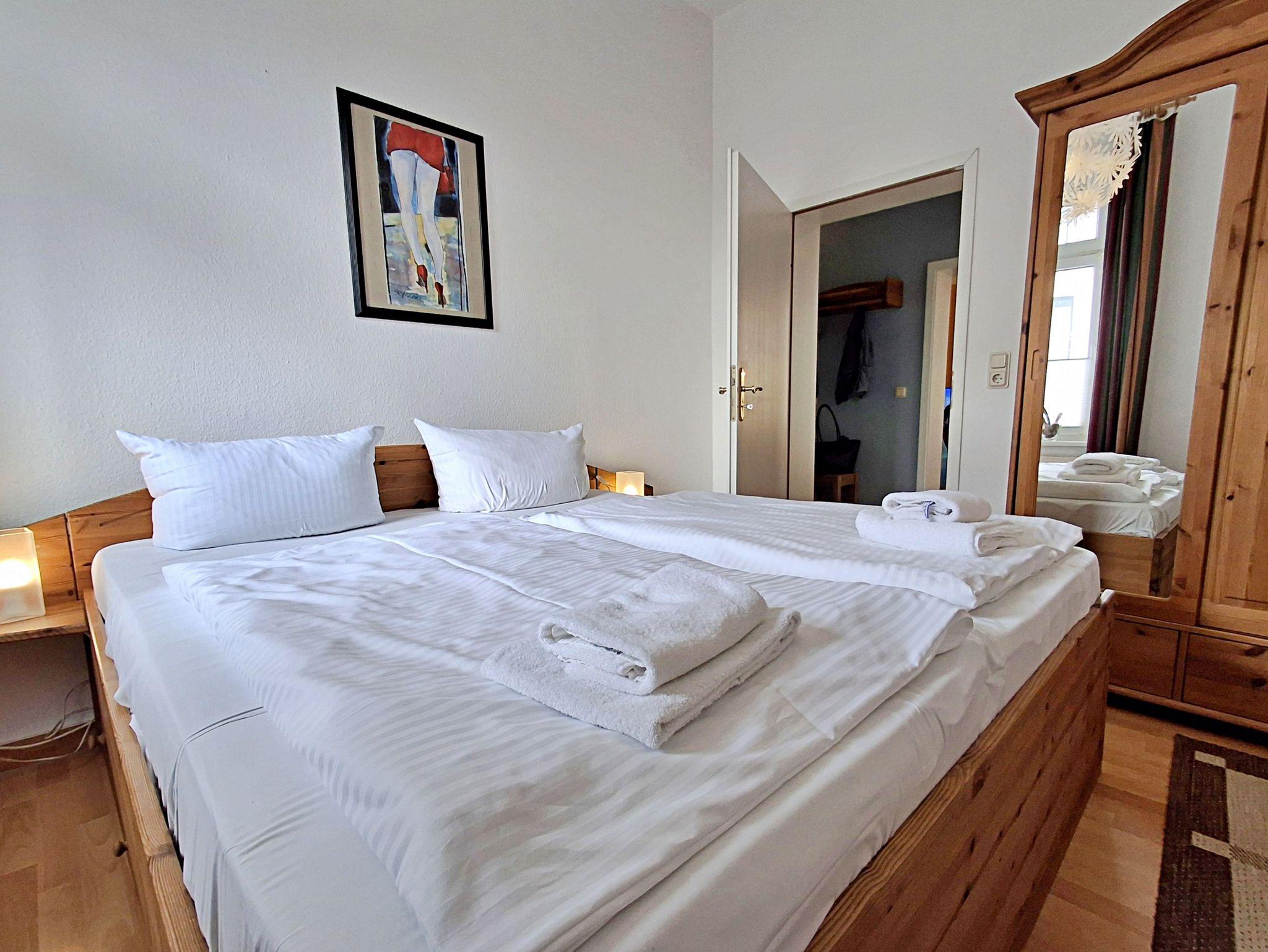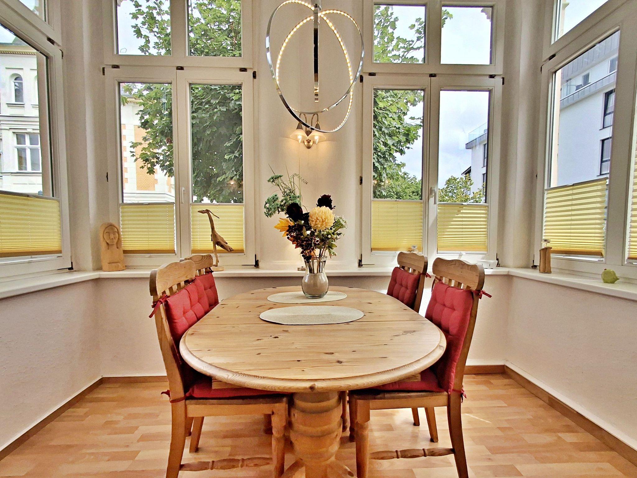 Diese gemütliche 50 qm große Wohnung befindet sich im Erdgeschoss der charmanten Villa Phönix. Hier erwartet Sie ein liebevoll eingerichteter Rückzugsort, perfekt für einen entspannten Urlaub zu zweit. Die Wohnung verfügt über zwei hübsche Zimmer, einen kleinen Wintergarten, eine kleine, gut ausgestattete Küche mit Kühlschrank, 2-Platten-Ceranherd, Mikrowelle, Wasserkocher, Toaster und Tassimo-Kaffeemaschine sowie ein großes Badezimmer mit Badewanne, die auch eine Duschfunktion bietet und Waschmaschine - ideal zum Relaxen nach einem erlebnisreichen Tag. Das Schlafzimmer hat ein bequemes Doppelbett und einen Kleiderschrank mit genügend Stauraum. Warme Farben, strapazierfähiger Laminatboden und bequeme Möbel sorgen für eine angenehme Atmosphäre. Zur Ausstattung gehören außerdem Flachbild-TV, Radio, MP3-Player, Esstisch mit 4 Stühlen und eine kleine Urlaubsbibliothek, damit Sie es sich richtig gemütlich machen können.