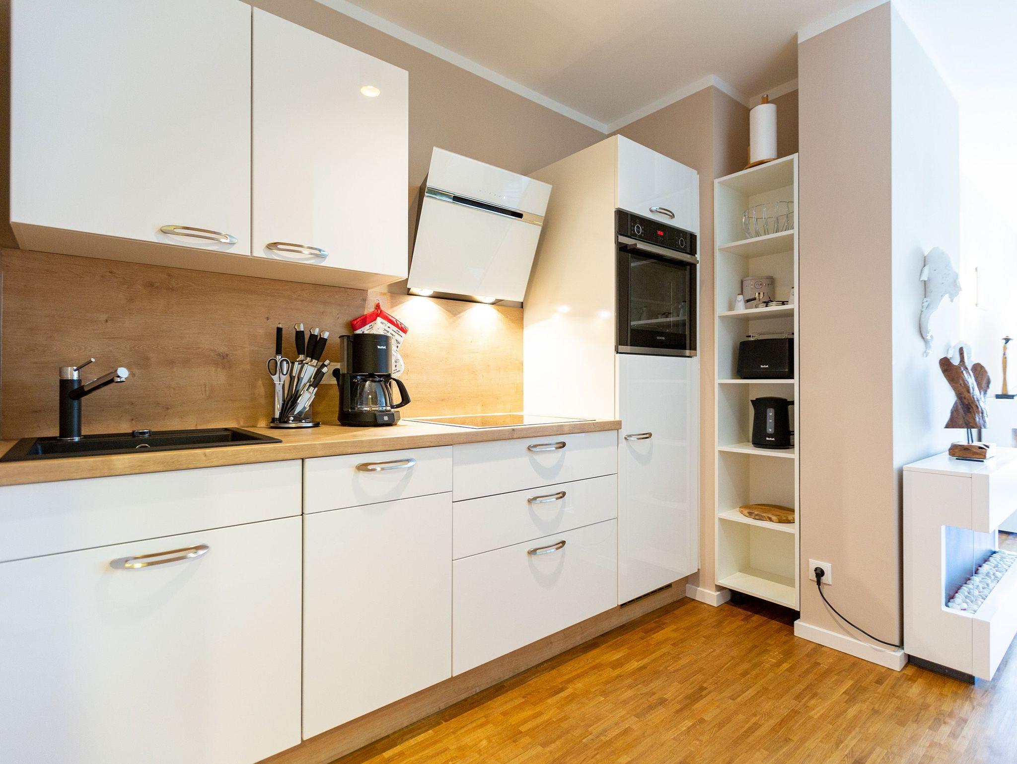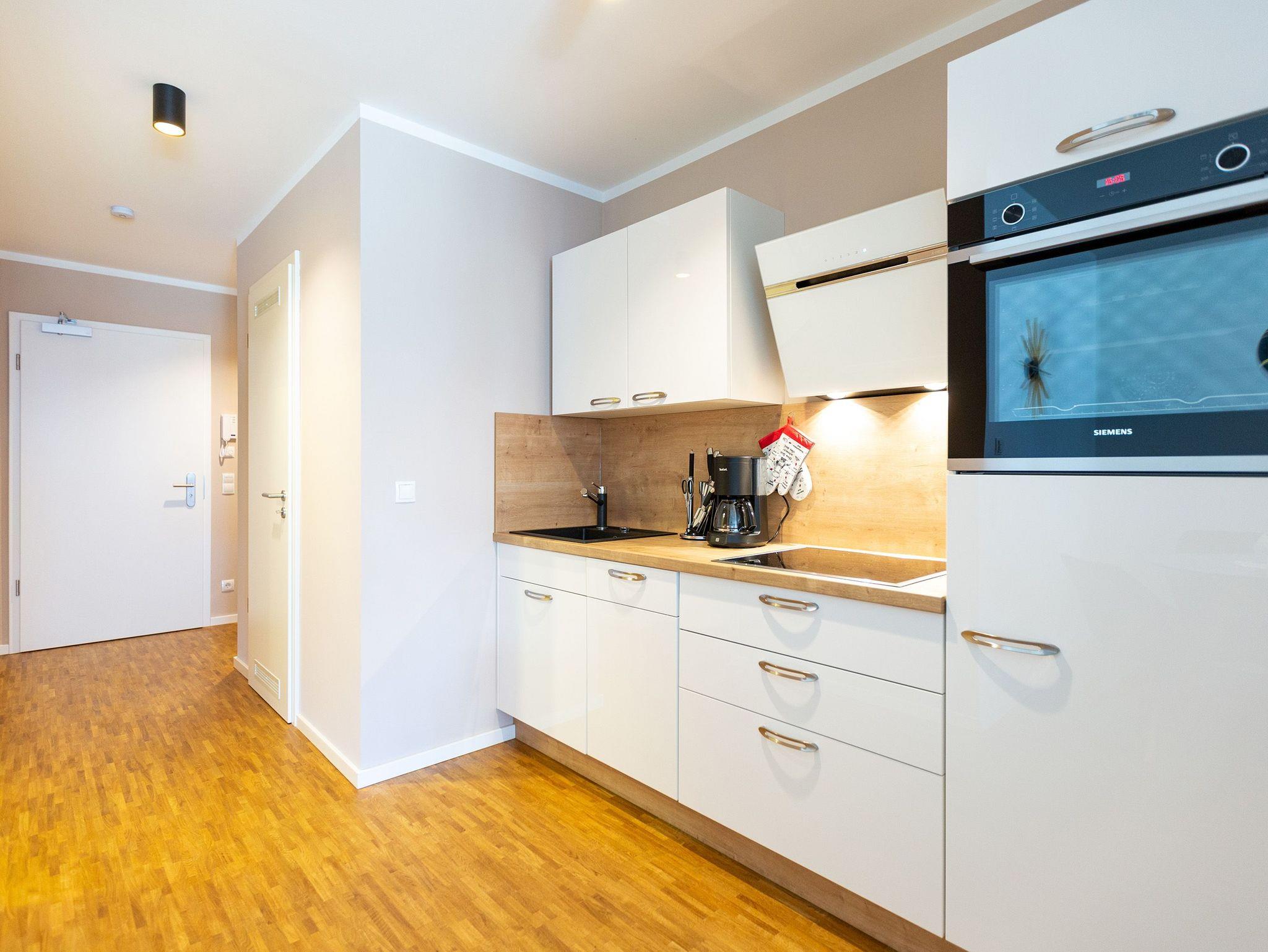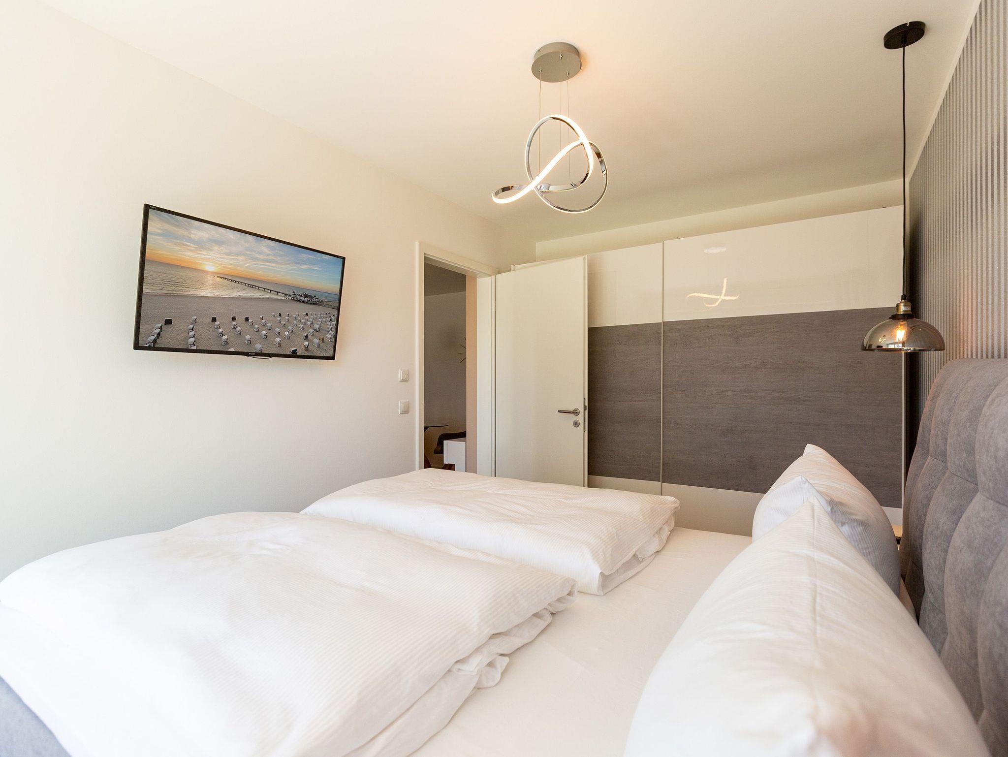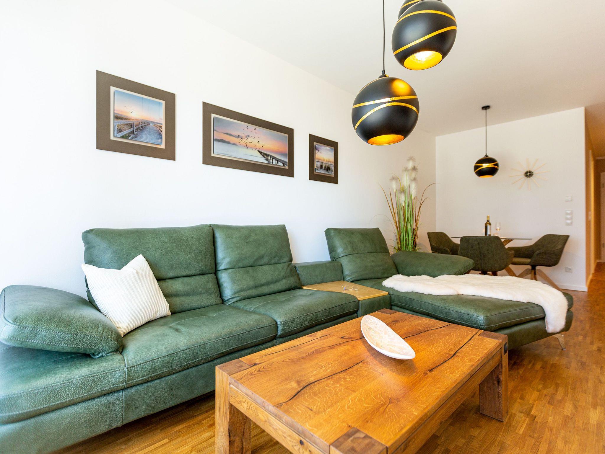 Ein Feriendomizil mit Stil und einer schönen Terrasse erwartet Sie im Erdgeschoss vom Quartier 7. Für zwei Personen ist dieses wunderschön eingerichtete Zwei-Zimmer-Appartement das ideale Auszeit-Zuhause. Auf den 50 Quadratmetern finden Sie alles, was Sie für eine entspannte Zeit auf Usedom brauchen können. Ein großzügiges und offenes Wohnzimmer lädt zum Relaxen ein. Ein großer Flat-TV gehört zur Ausstattung dazu. Ebenso ein Elektro-Kamin mit Panoramascheibe. Sollte es auf Usedom einmal widererwartend ungemütliches Wetter geben, sorgt er dafür, dass Sie sich schnell kuschelig und geborgen fühlen. Entspannen Sie auf der großen Ledersofalandschaft und genießen Sie einfach die Zeit, die hier auf der Insel bedeutungslos wird. Das WLAN ist hier kostenfrei nutzbar. Die Liebe zum Detail und zur Natur wird in den kleinen Dekorationen sichtbar. Zum Wohnzimmer hin öffnet sich eine komplett ausgestattete Küche. Markengeräte und edles Geschirr erleichtern das Zubereiten der Mahlzeiten. Am modernen Glastisch können Sie gemütlich sitzen und essen. Ist das Wetter schön, eignen sich dafür allerdings auch die Gartenmöbel auf der sonnenüberfluteten Süd-West-Terrasse (14 Quadratmeter). Skandinavisches Design: Im Schlafzimmer wartet ein bequemes und großes Boxspringdoppelbett (1,80 m x 2,00 m) nur darauf, Ihnen den Schlaf zu versüßen. Wenn die Ostsee nicht so ein Magnet wäre, könnte man hier glatt den ganzen Tag verkuscheln. Für das Kino-im-Bett-Gefühl ist ein Flat-TV vorhanden. Ein geräumiger Schrank bietet viel Platz für Kleidung. Auch vom Schlafzimmer aus haben Sie einen Zugang zur Terrasse. Das Bad ist mit Dusche und WC ausgestattet. Freuen Sie sich hier auf ein kleines Highlight: Eine finnische Sauna. Entspannen Sie ausgiebig in ihrem eigenen kleinen Private SPA. Handtücher liegen bereit. Ebenso ist das Bett bei Ihrer Anreise bezogen. In der Tiefgarage ist der Stellplatz Nr. WE 02 für Sie reserviert.